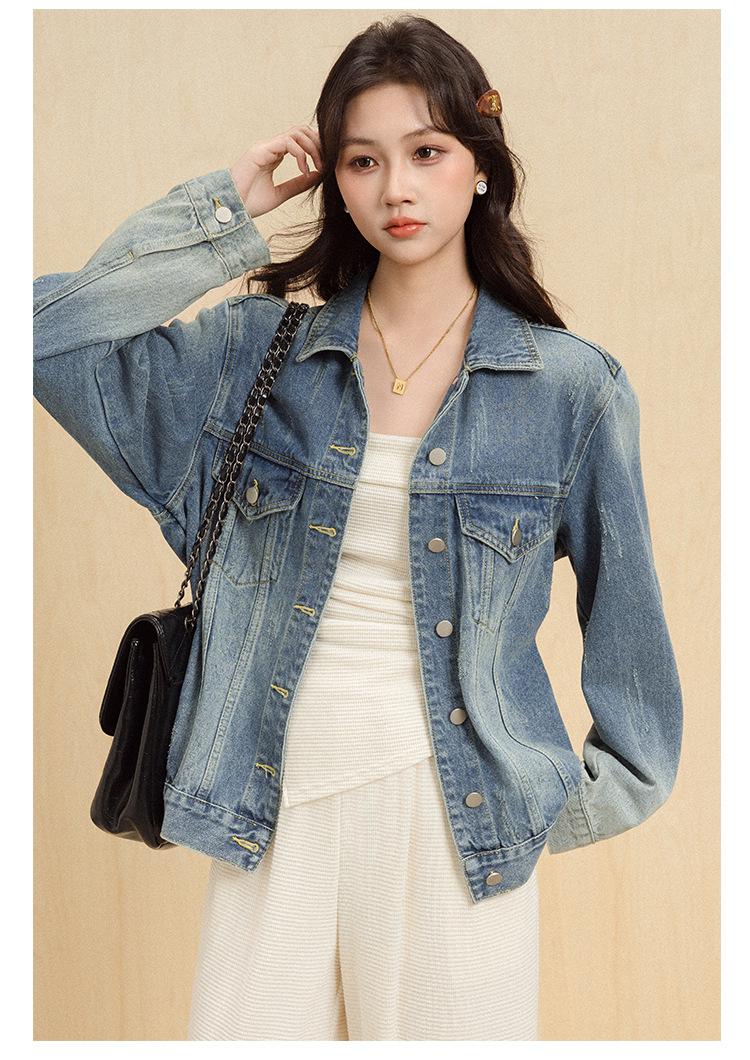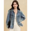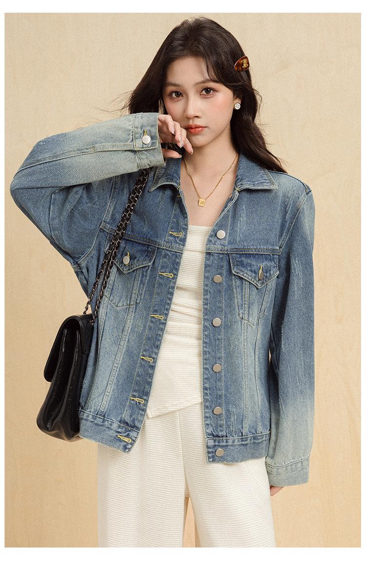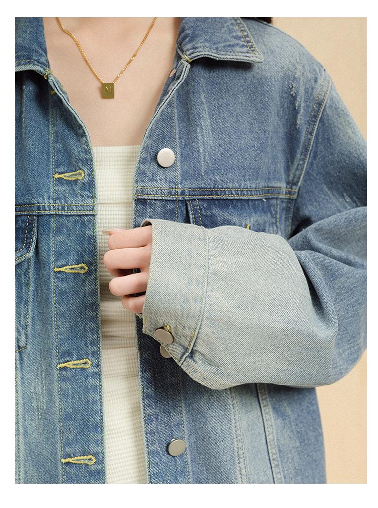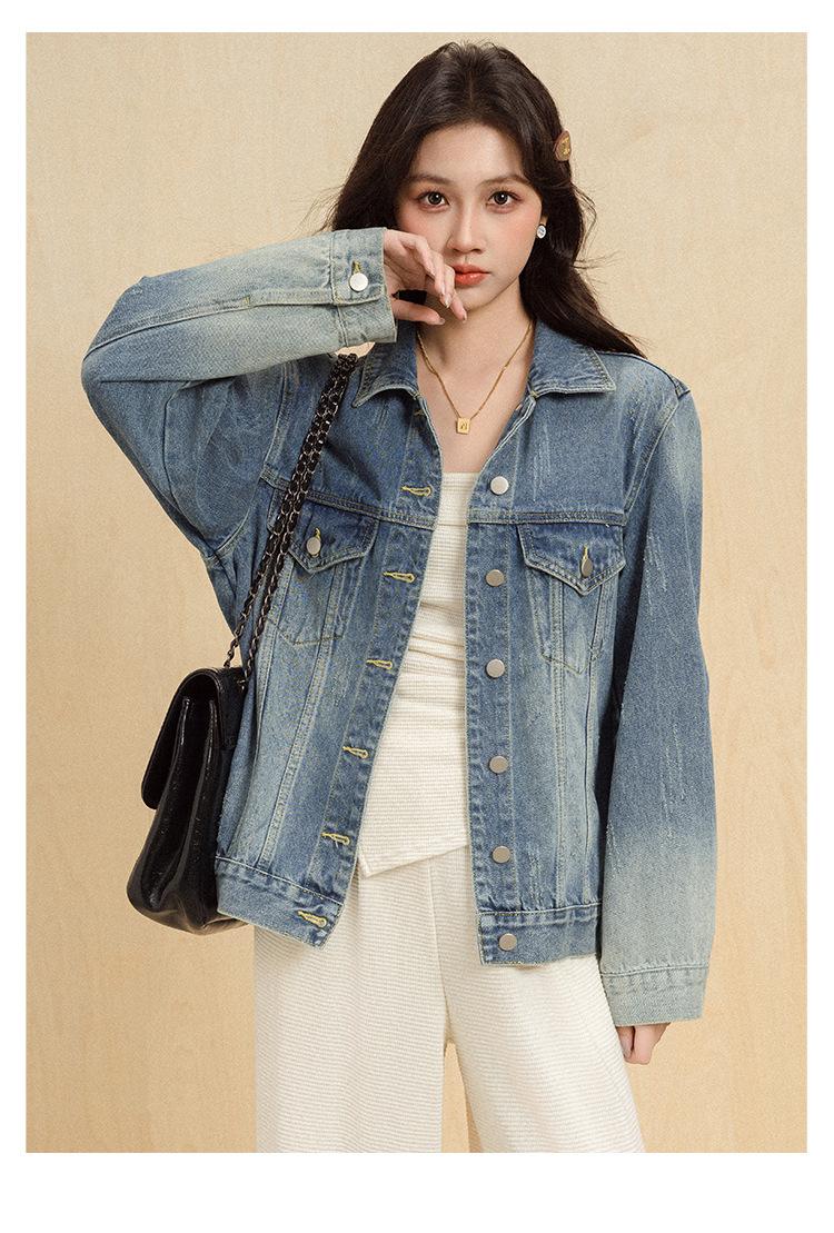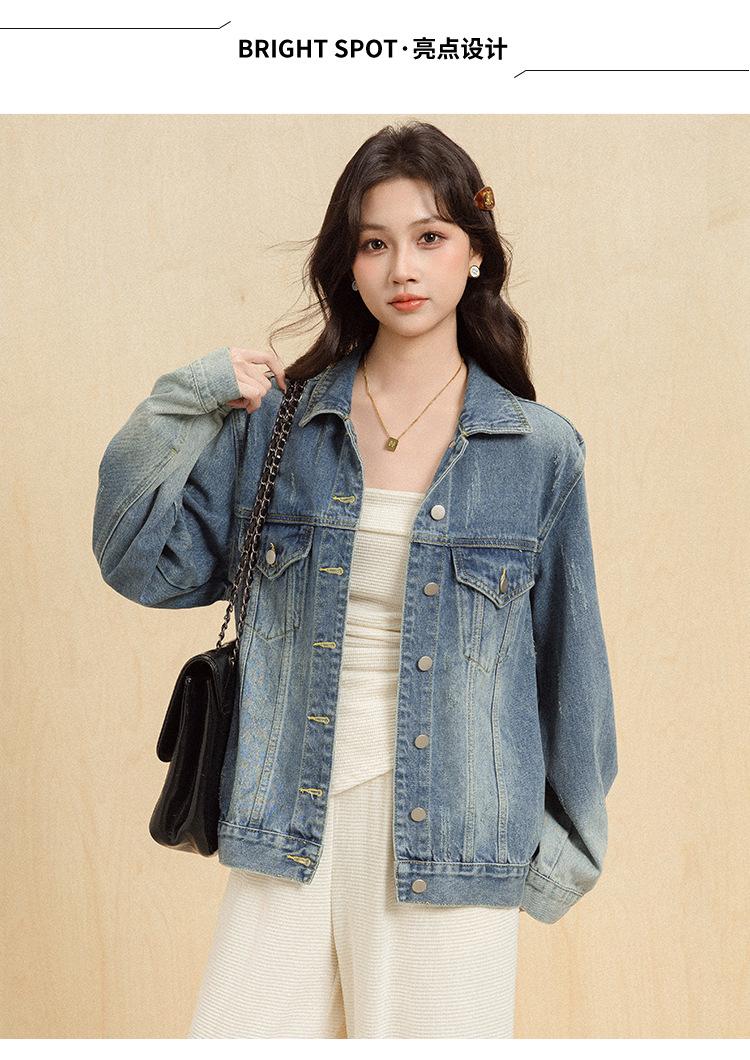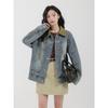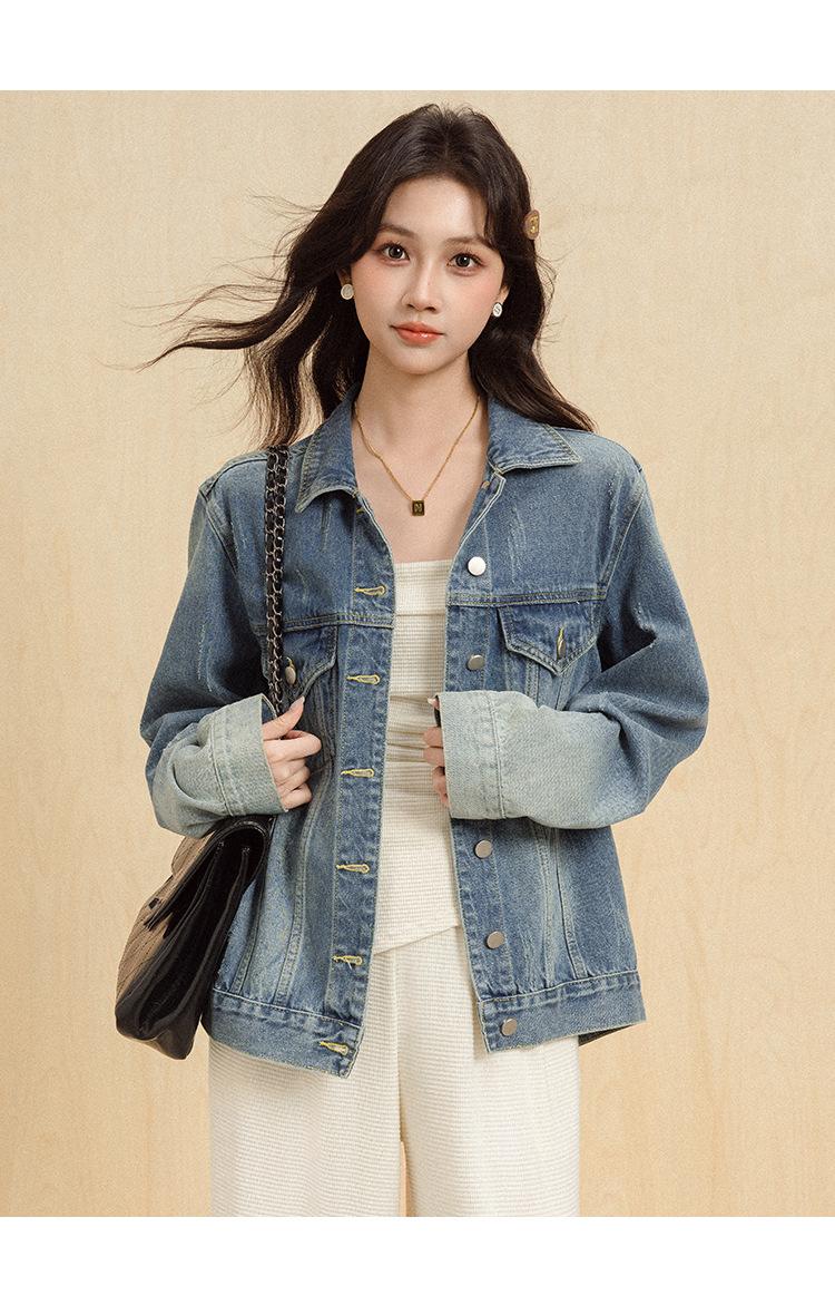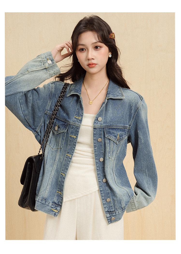 2025 Otoño Nuevo Estilo Coreano Tendencia Retro Versátil Lavado Desgastado Cuello Vuelto Versátil Estilo Hong Kong Chaqueta de Mezclilla Mujer