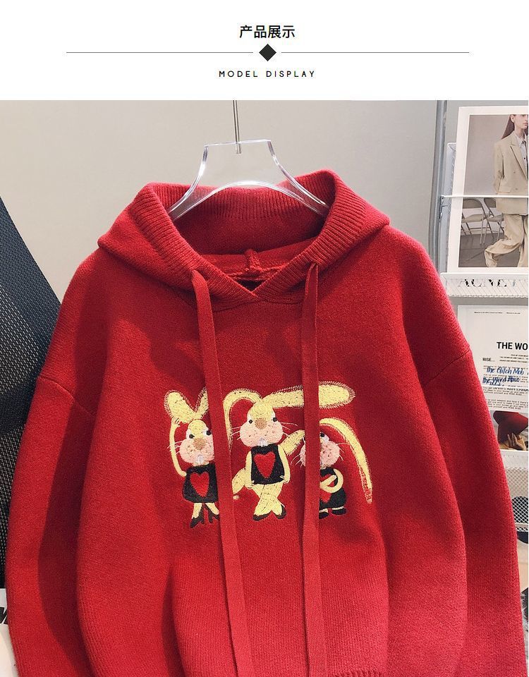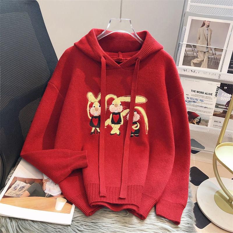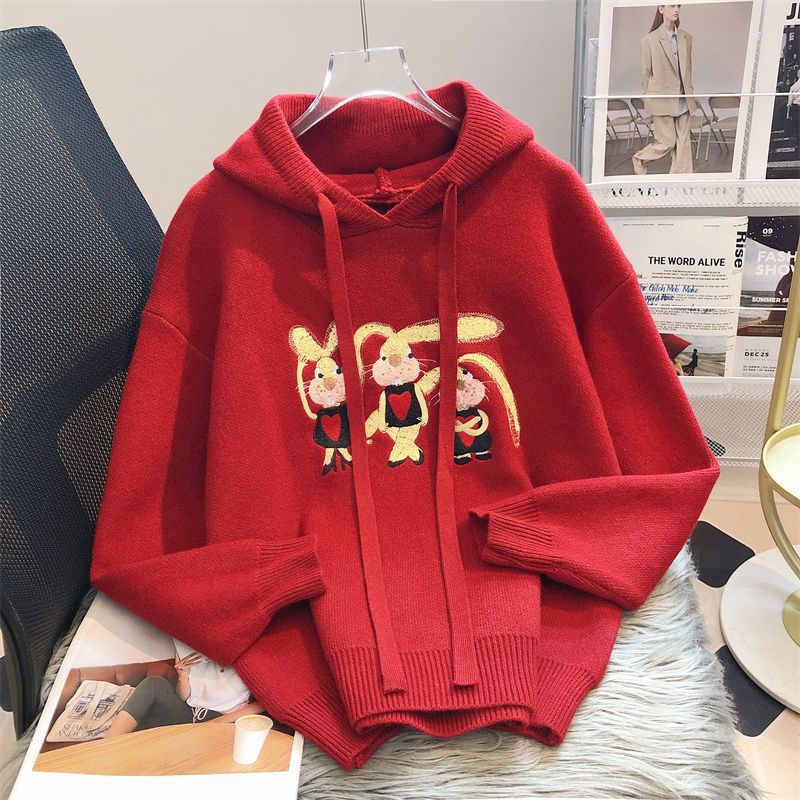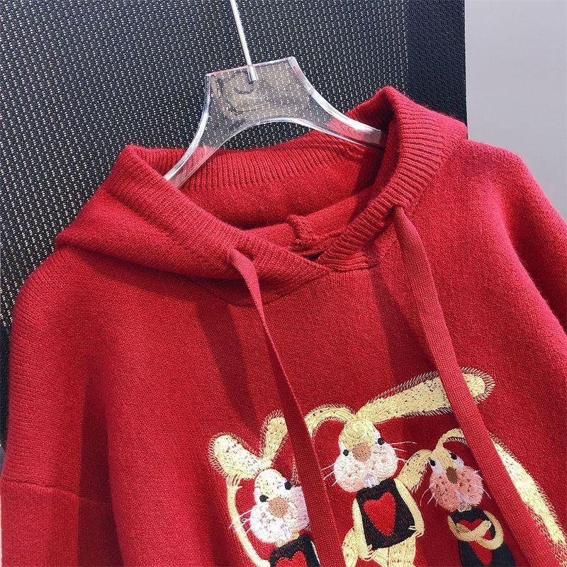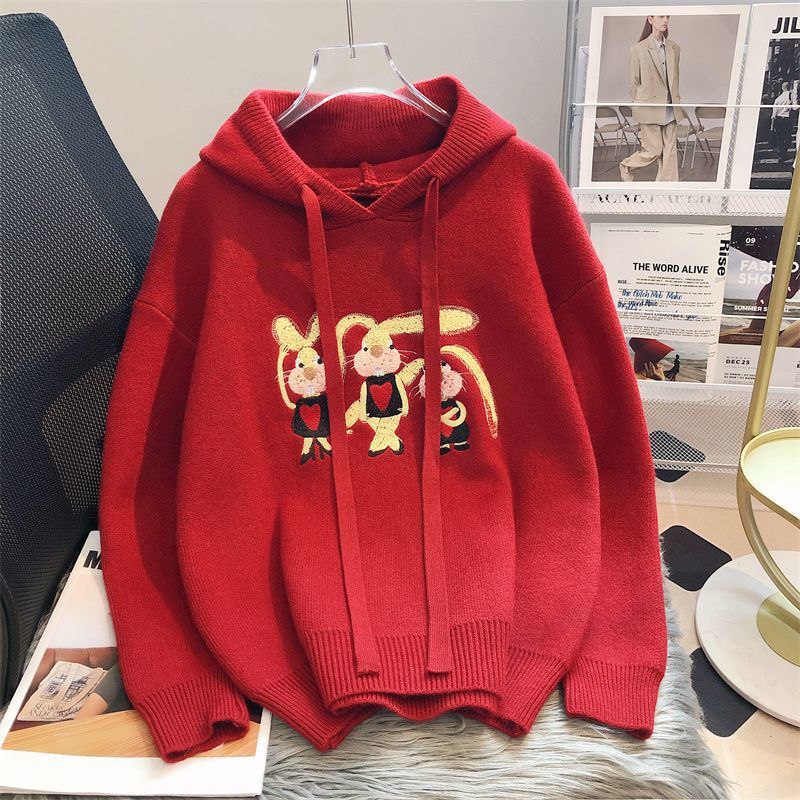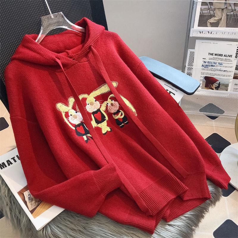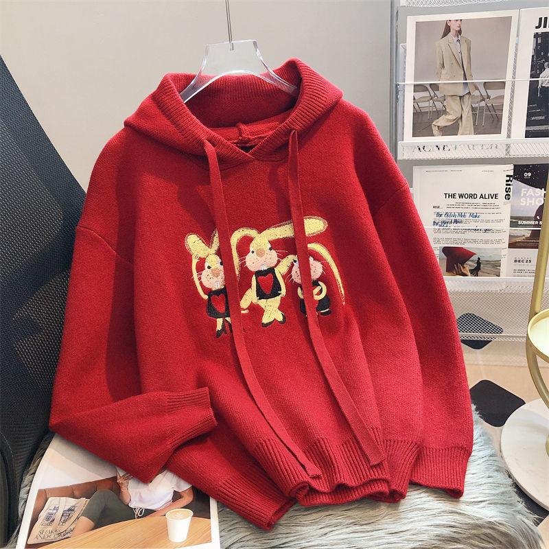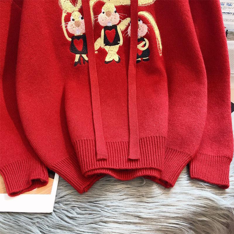 Suéter Rojo para Mujer con Capucha Otoño e Invierno de Alta Calidad Jersey Nuevo Suelto Dibujo Animado Conejo Ropa Exterior Suéter Tejido Top Engrosado