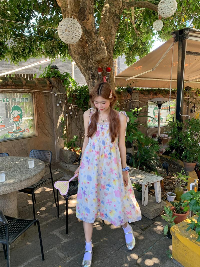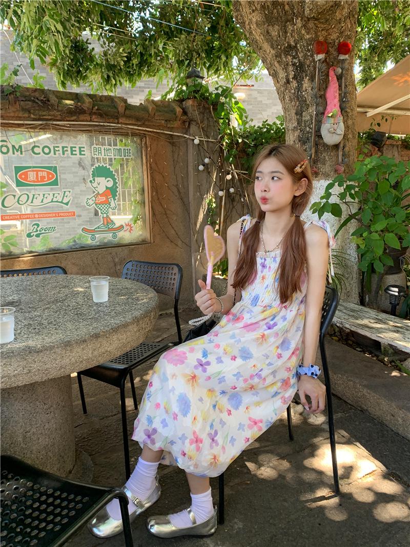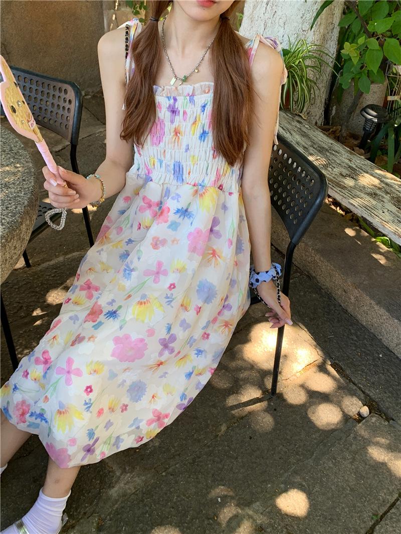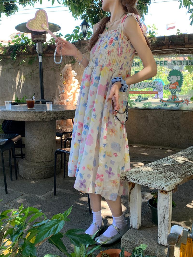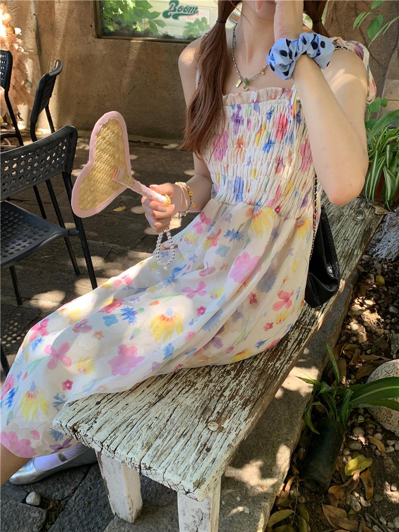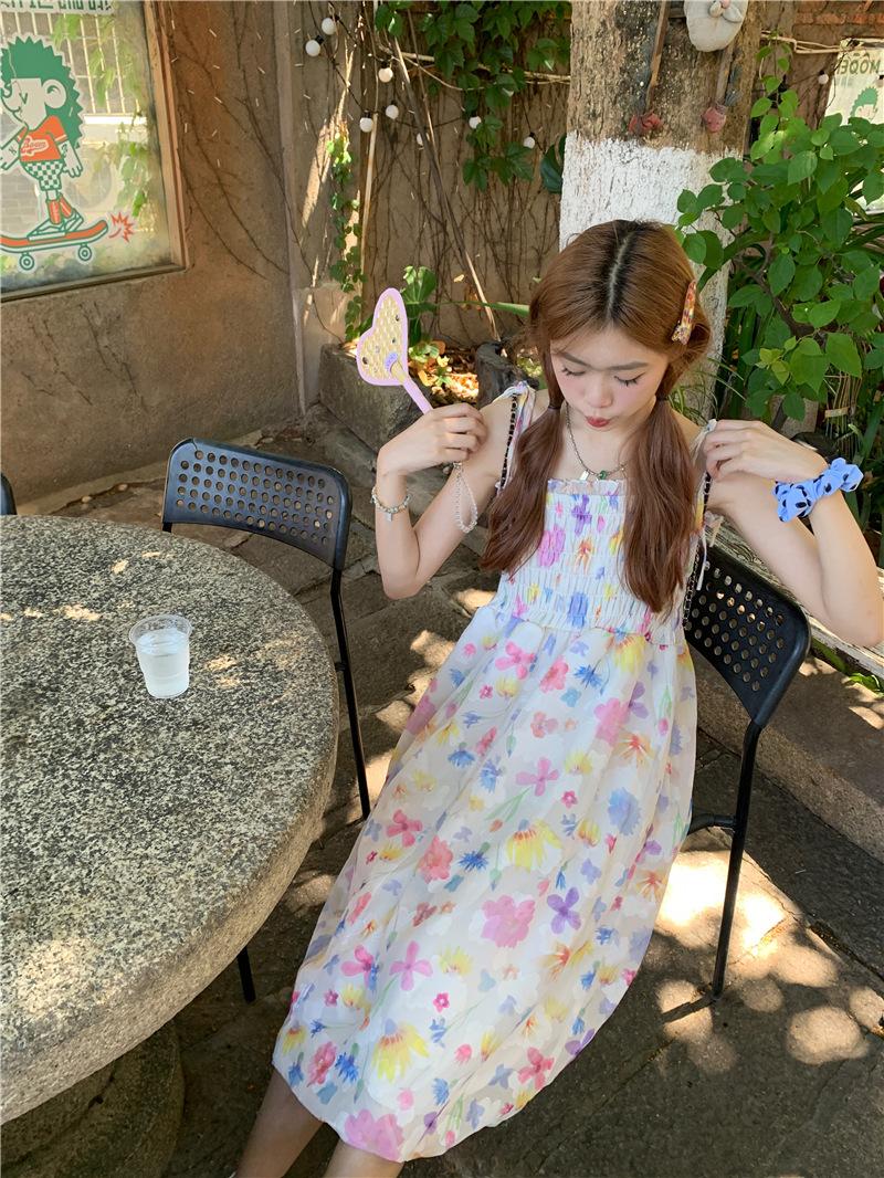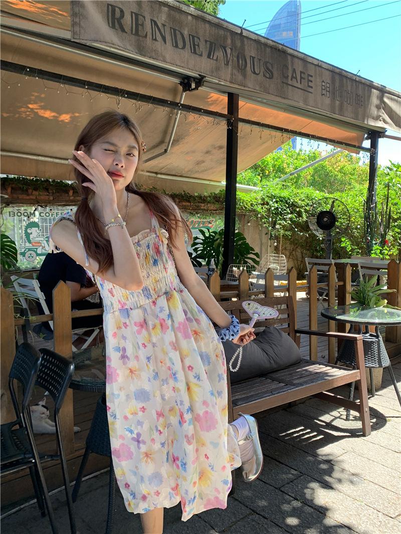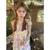 Vestido floral dulce y delicado con tirantes finos para mujer, verano, chica dulce picante, vacaciones, vestido línea A, vestido chic de largo medio