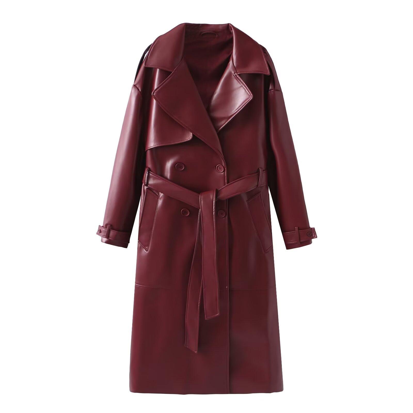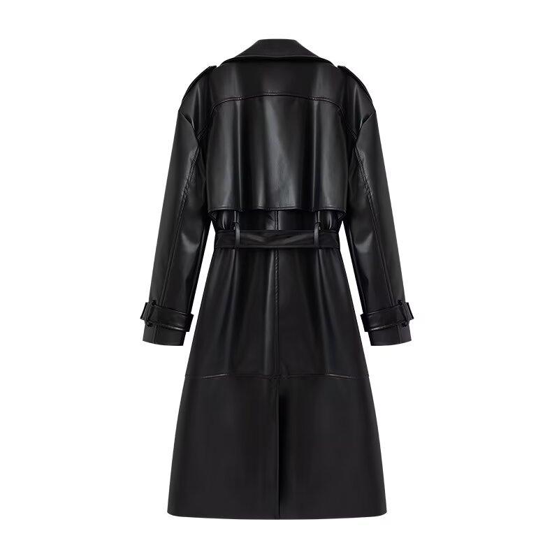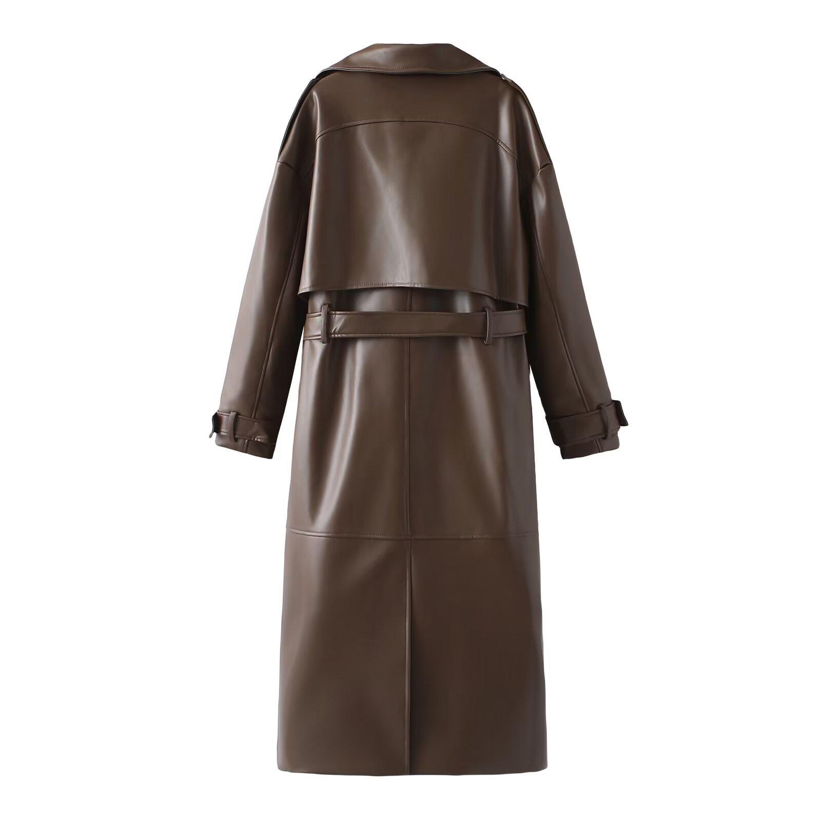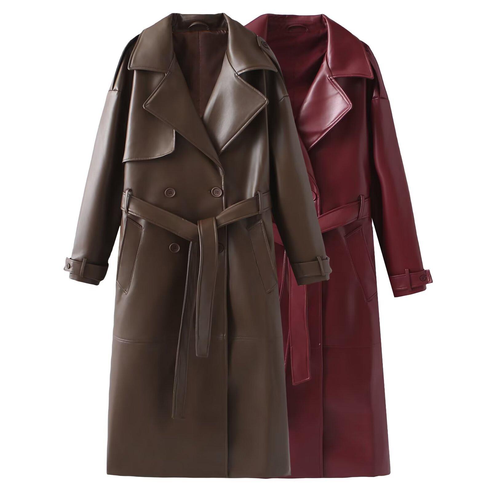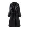 Abrigo Trench Clásico de PU de Color Sólido para Mujer, Largo Medio, con Cinturón, Solapa, Imitación Cuero, Ropa Exterior de Largo Medio para Otoño e Invierno, Transfronterizo Europeo y Americano