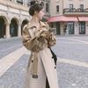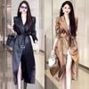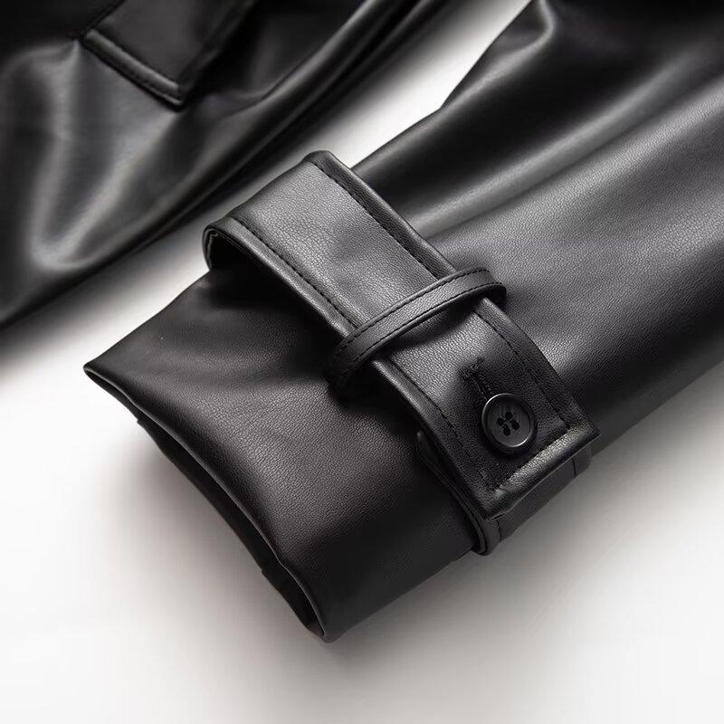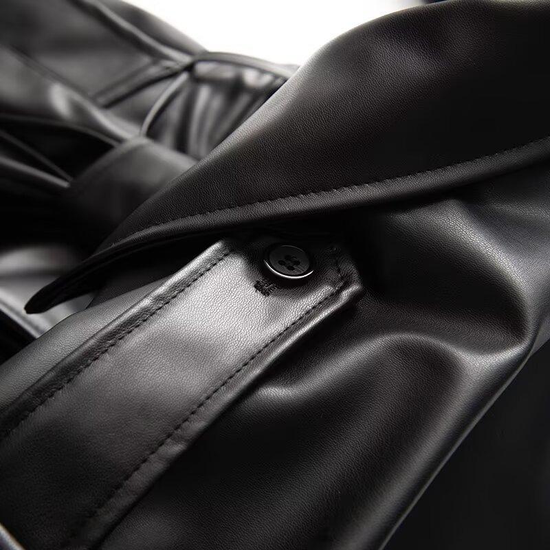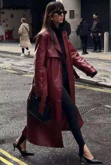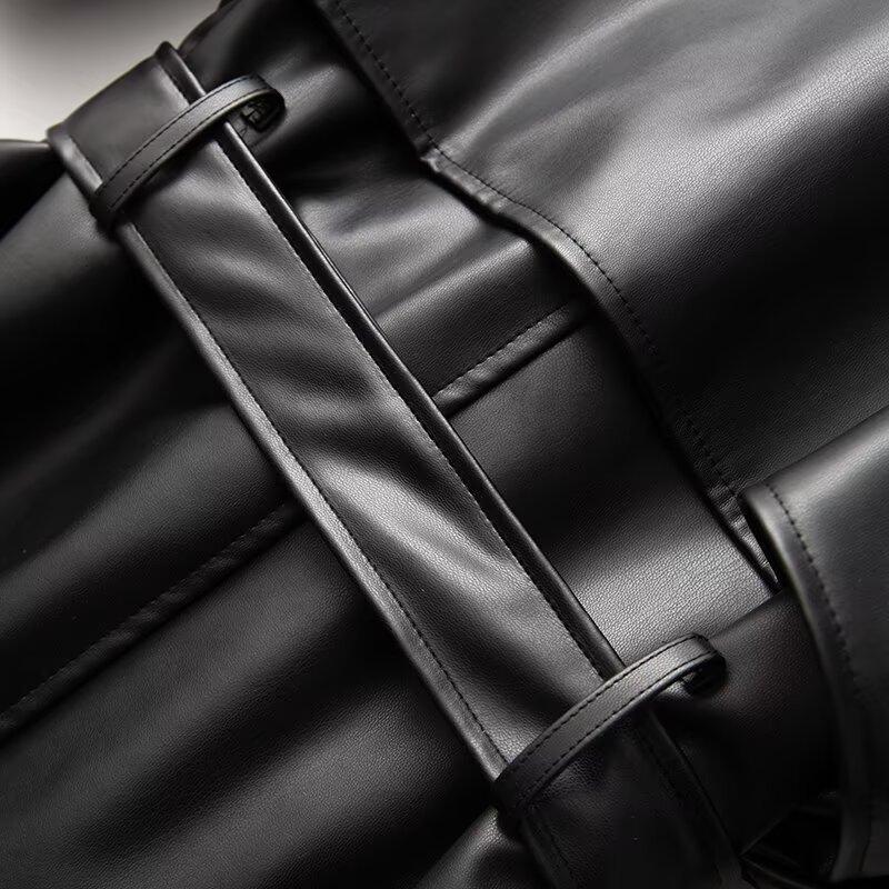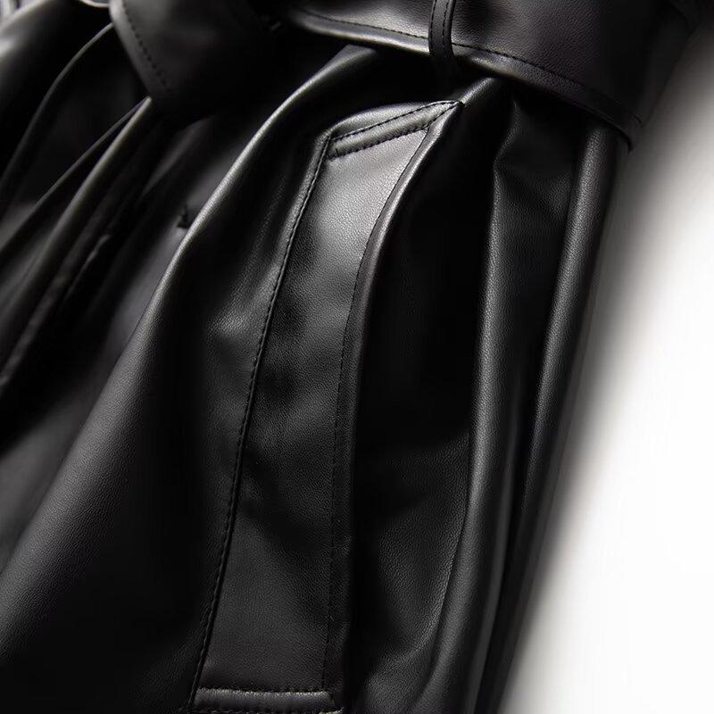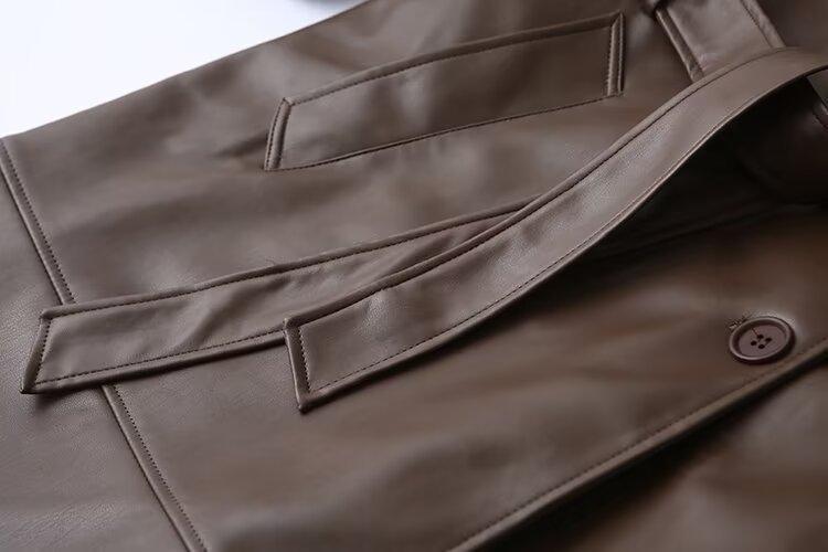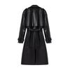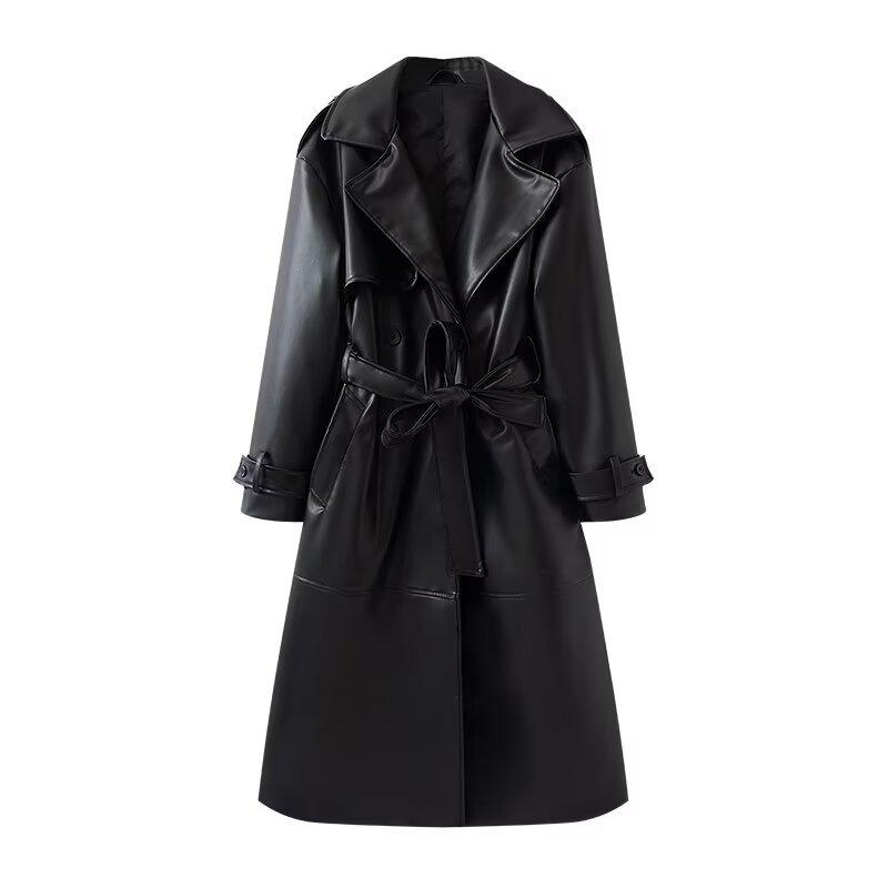 Abrigo Trench Clásico de PU de Color Sólido para Mujer, Largo Medio, con Cinturón, Solapa, Imitación Cuero, Ropa Exterior de Largo Medio para Otoño e Invierno, Transfronterizo Europeo y Americano