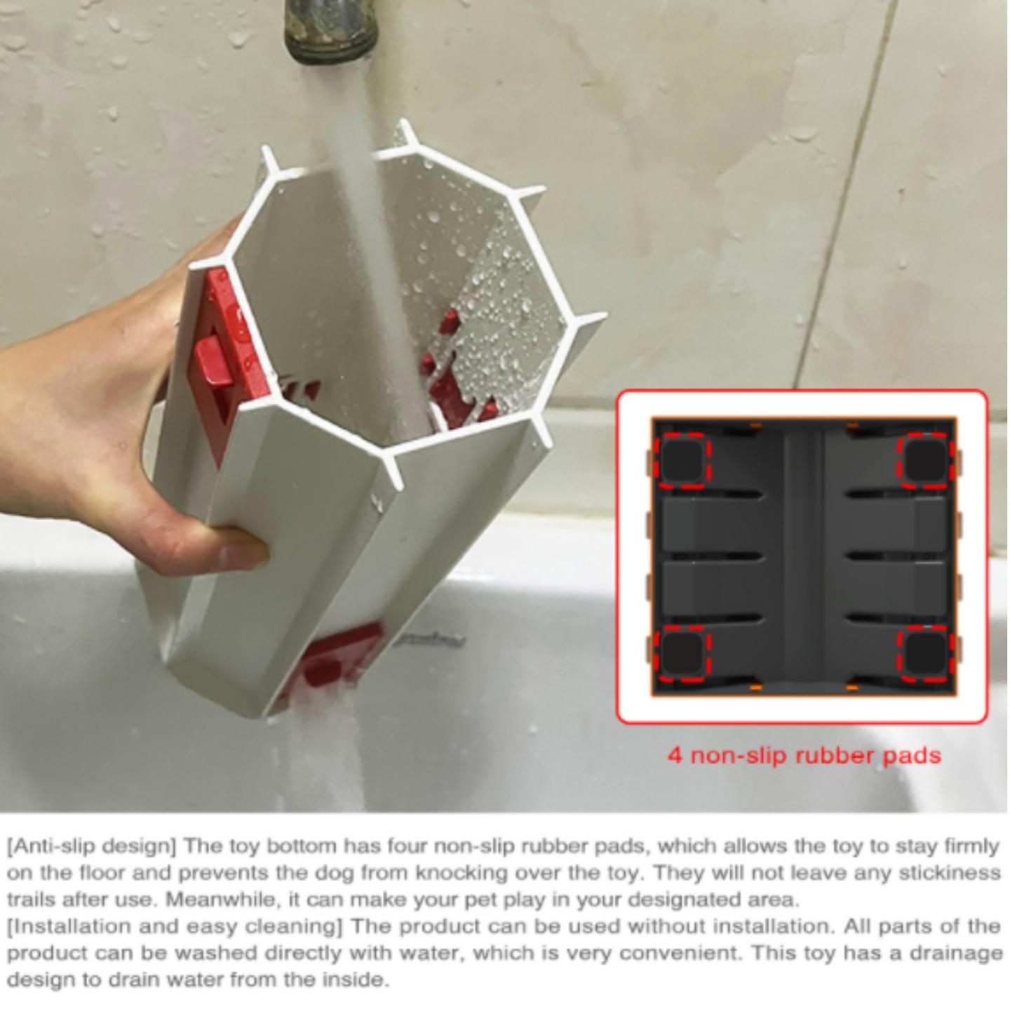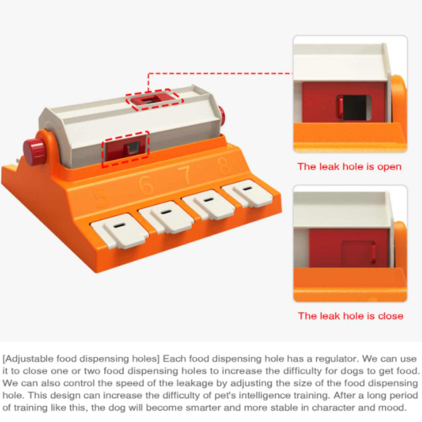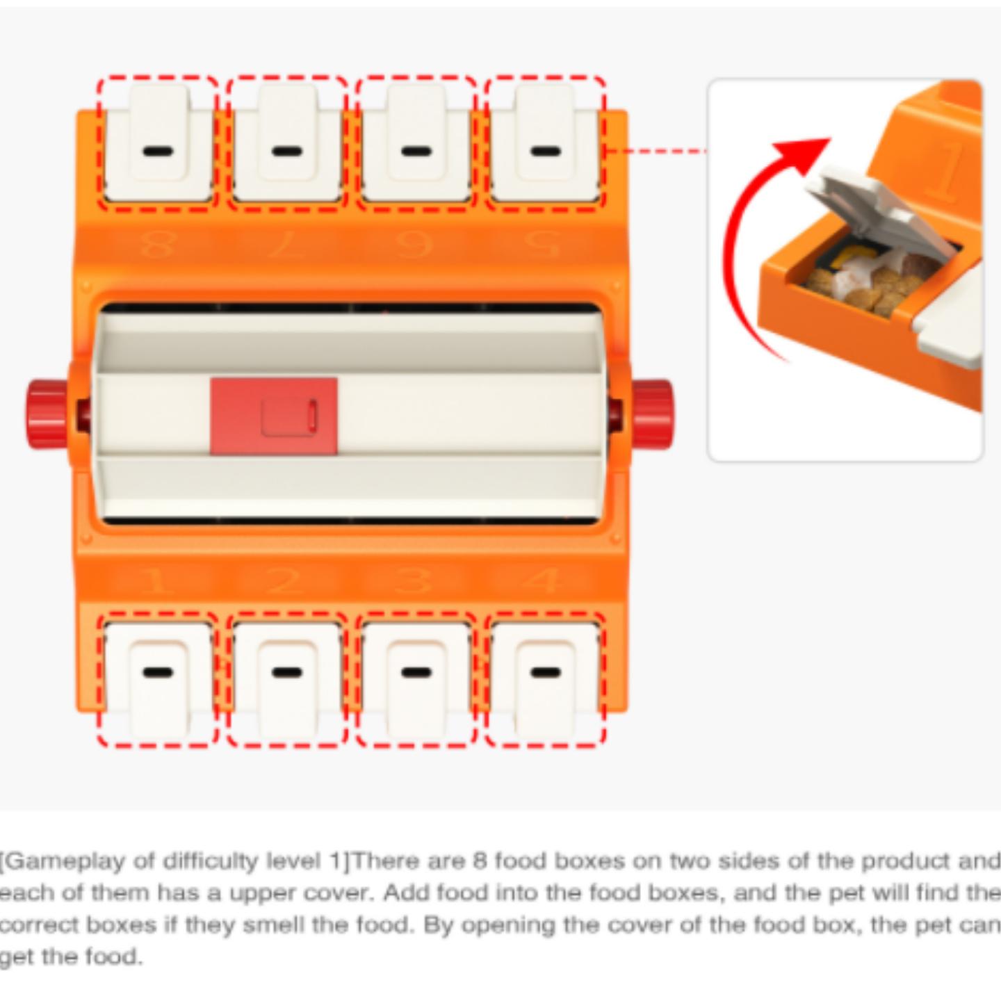 Dispositivo de alimentación inteligente tipo rodante. El rodillo superior puede contener 500g de snacks. El rodillo gira lentamente bajo la fuerza externa de la mascota, y las golosinas caen a través de 4 orificios de alimentación ajustables de diferentes velocidades y tamaños en los 8 comederos de abajo.. Hay una placa de cubierta sobre los comederos, y la mascota puede obtener recompensas abriendo la placa de cubierta.. Este producto puede ejercitar y mejorar la inteligencia de la mascota a través de múltiples etapas. Hace a la mascota más inteligente y la vida más agradable.