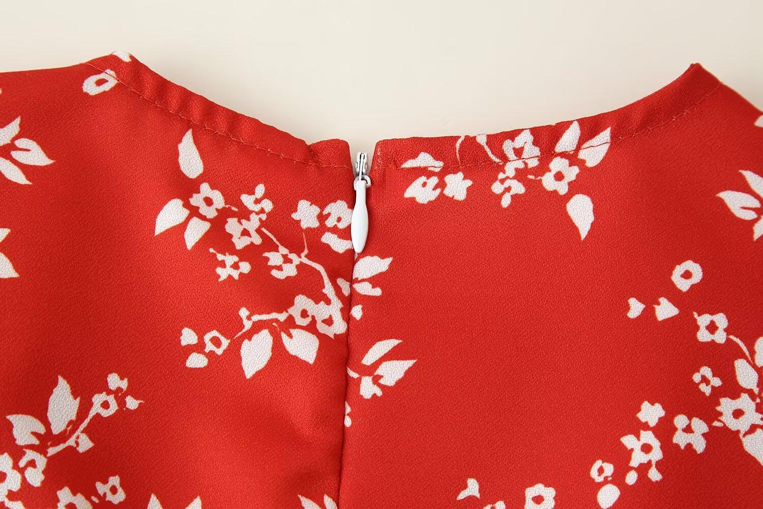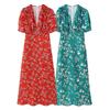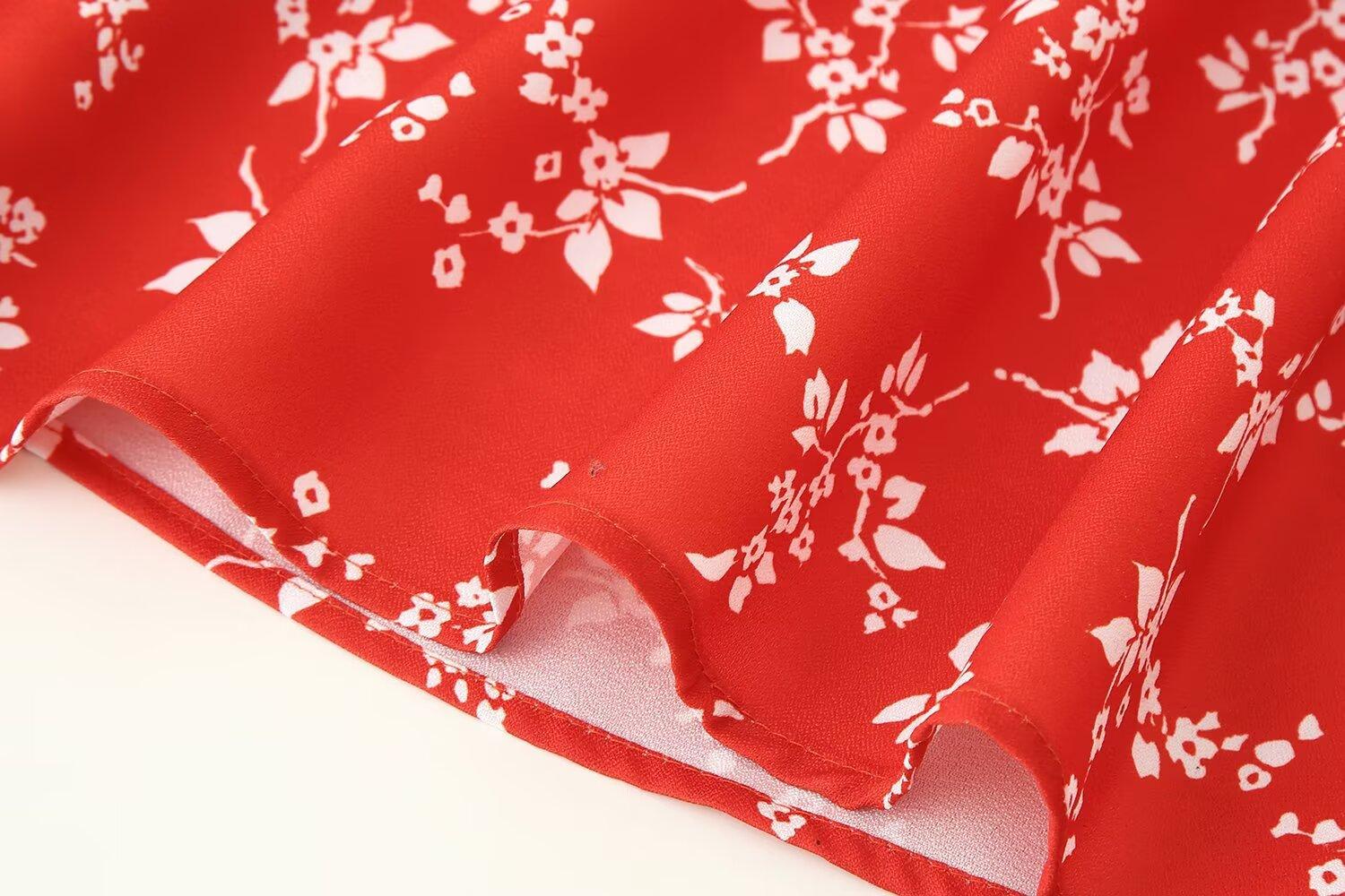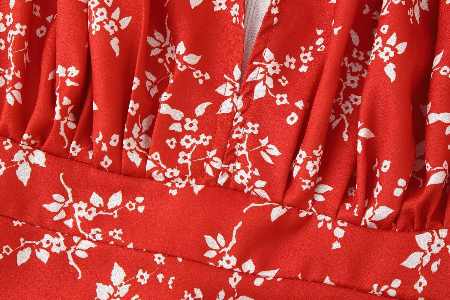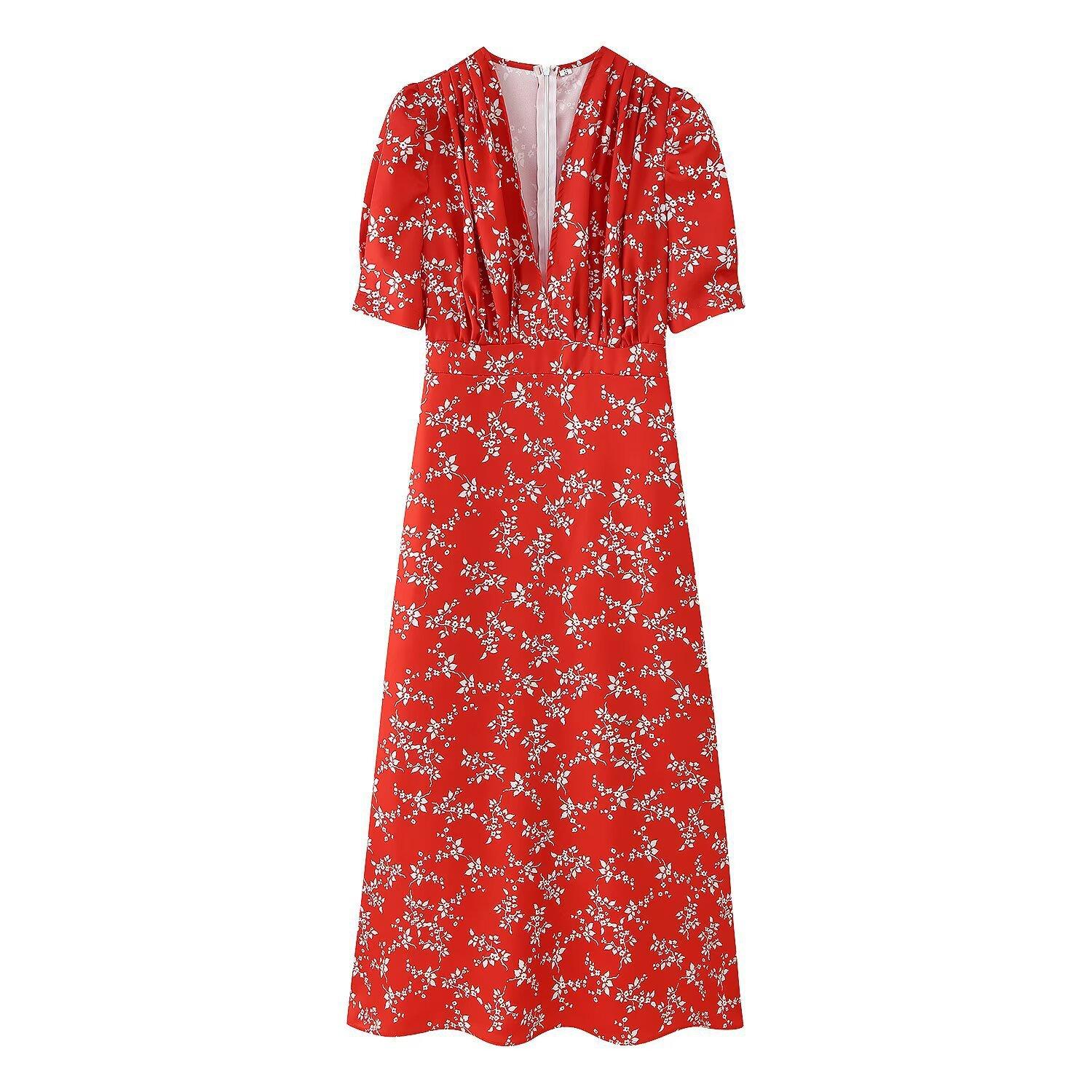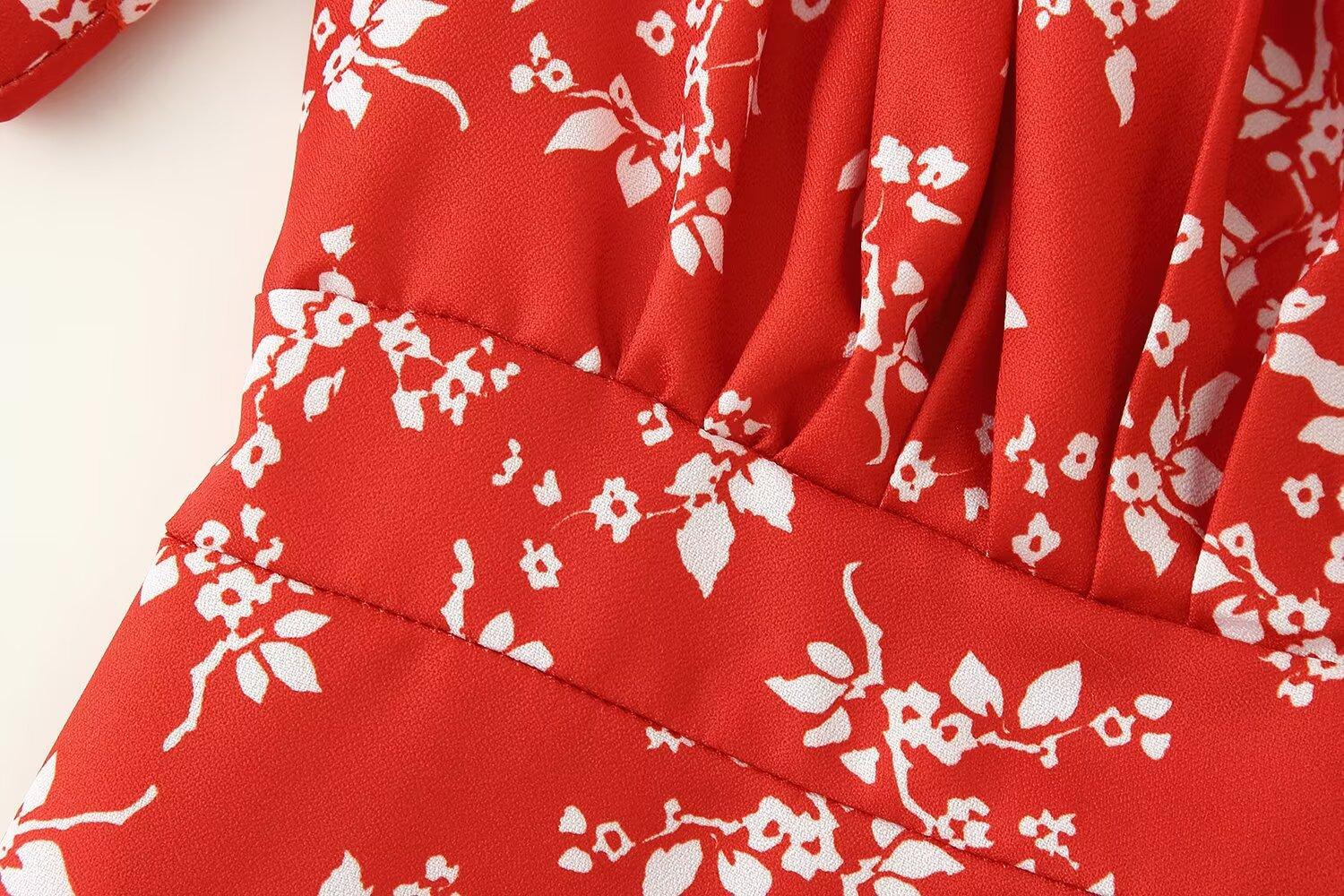 2025 Otoño Nuevo Ropa de Mujer Estilo Europeo y Americano Moda Simple Decoración Plisada Bicolor Vestido Estampado Cuello en V Rojo