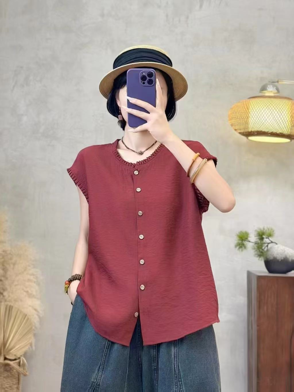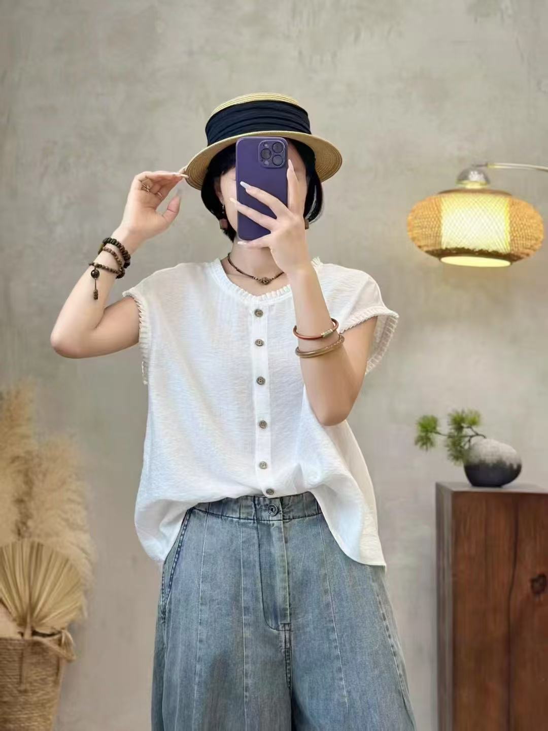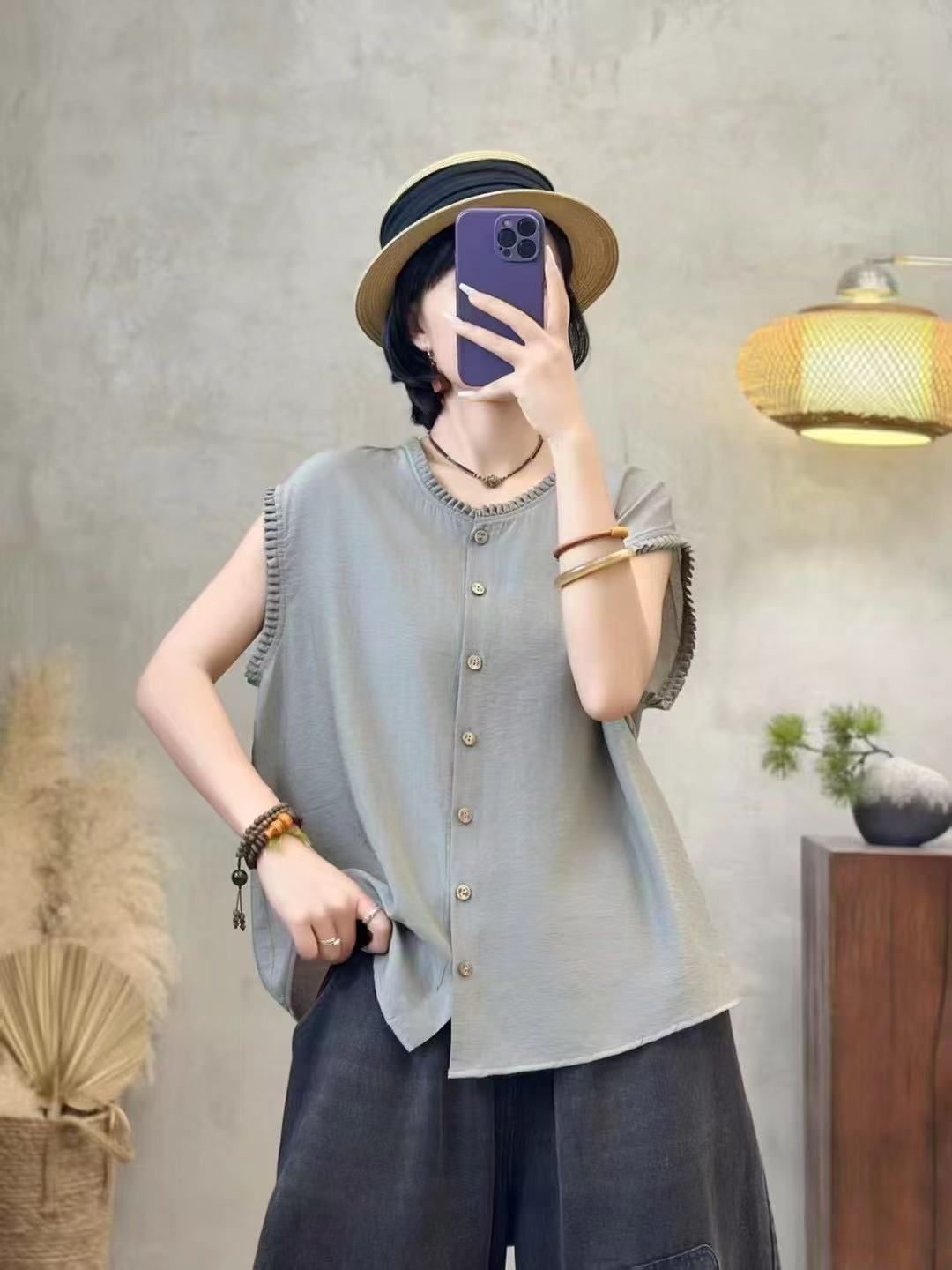 Verano 2025 Versión Coreana Suelta Artística Simple Tencel Lino Camisa sin Mangas Versátil Casual Cómoda Top de Mujer