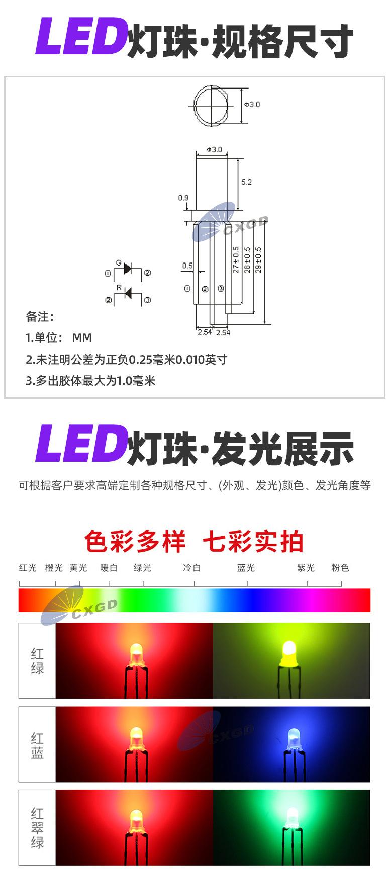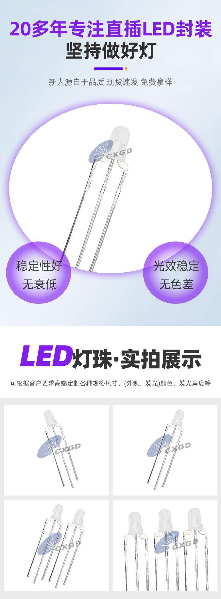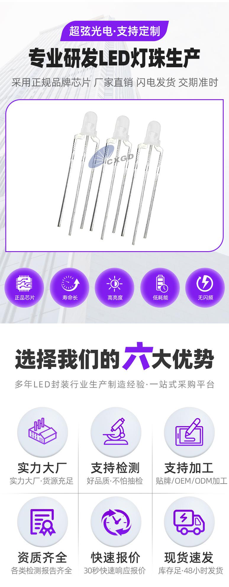 Cuentas de Luz LED de 360° de Ultra Alto Brillo Resistentes a Altas Temperaturas 0.5w Rojo Amarillo Azul Verde Blanco Blanco Cálido Fabricante ¥80.00 Compre ya | diodo emisor de luz blanco-púrpura de 3 mm 5 mm parte superior plana blanco-púrpura doble color alto brillo f3 cabeza redonda doble color ánodo común perlas de lámpara led ¥150.00 Compre ya | Cuentas de lámpara LED de 5 mm sin borde cóncavo rojo azul alto brillo translúcido lámpara enchufable f5 diodo emisor de luz ¥55.00 Compre ya | ||