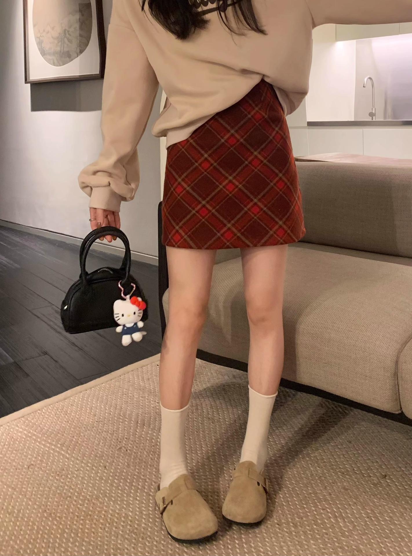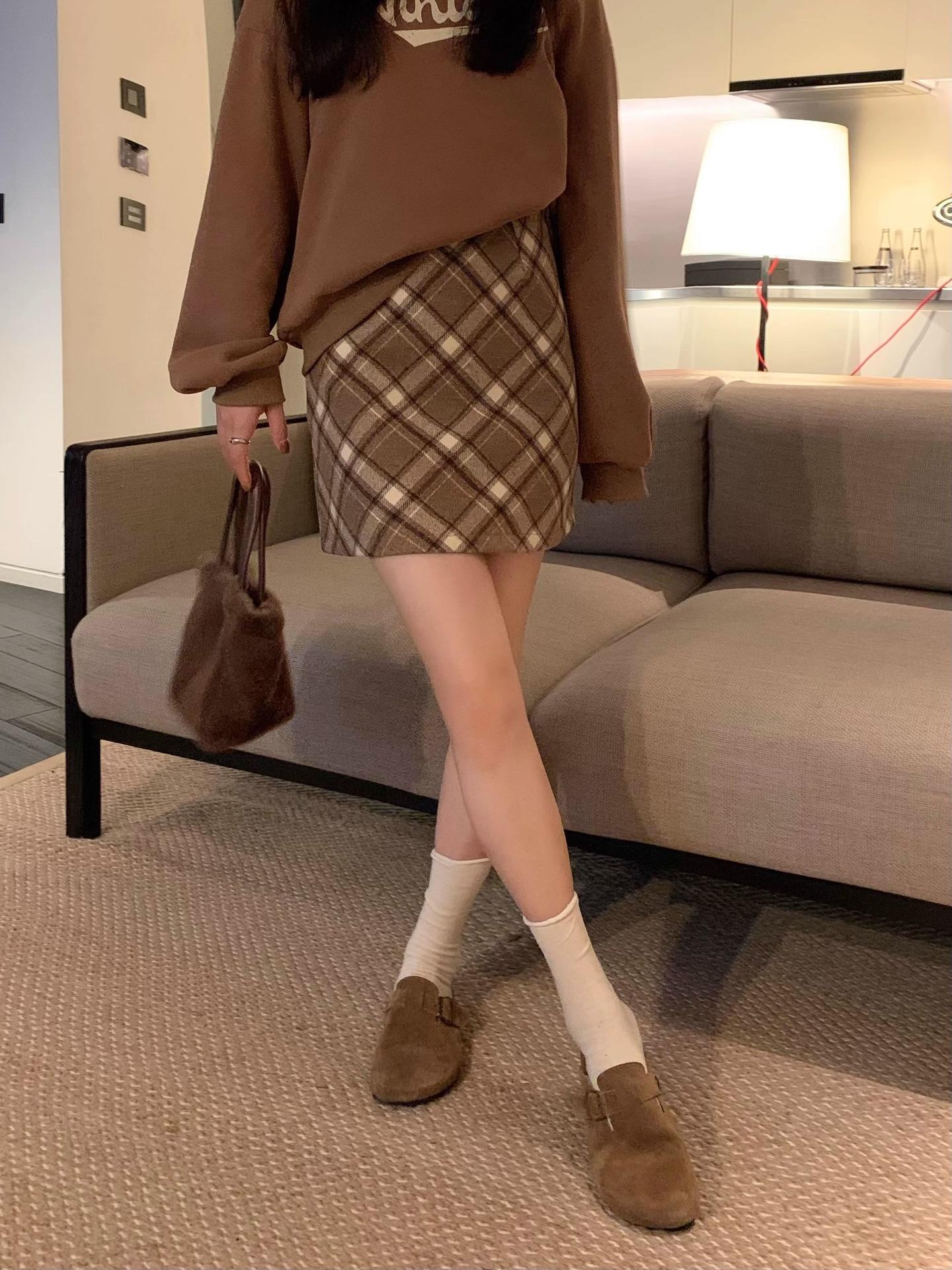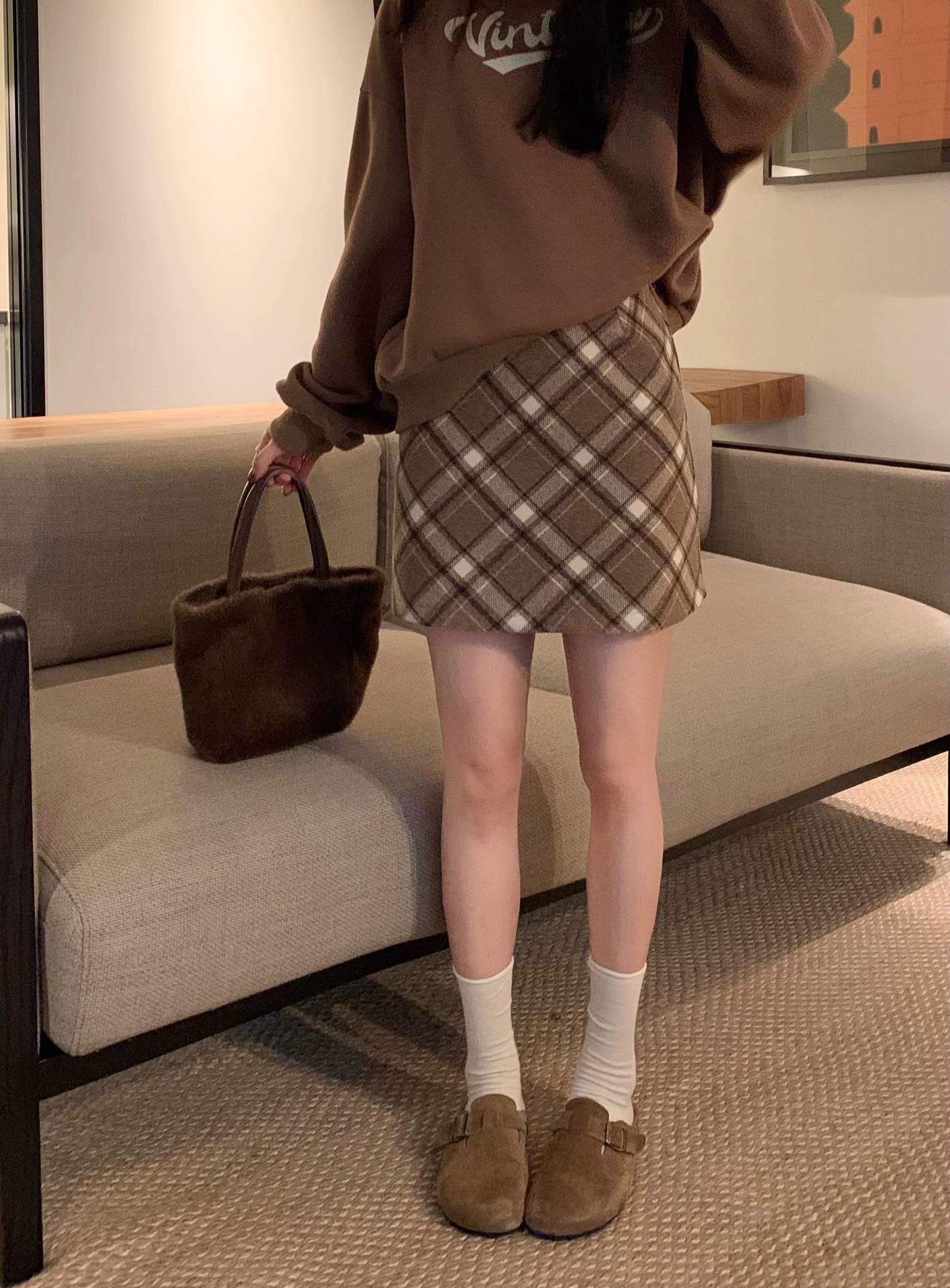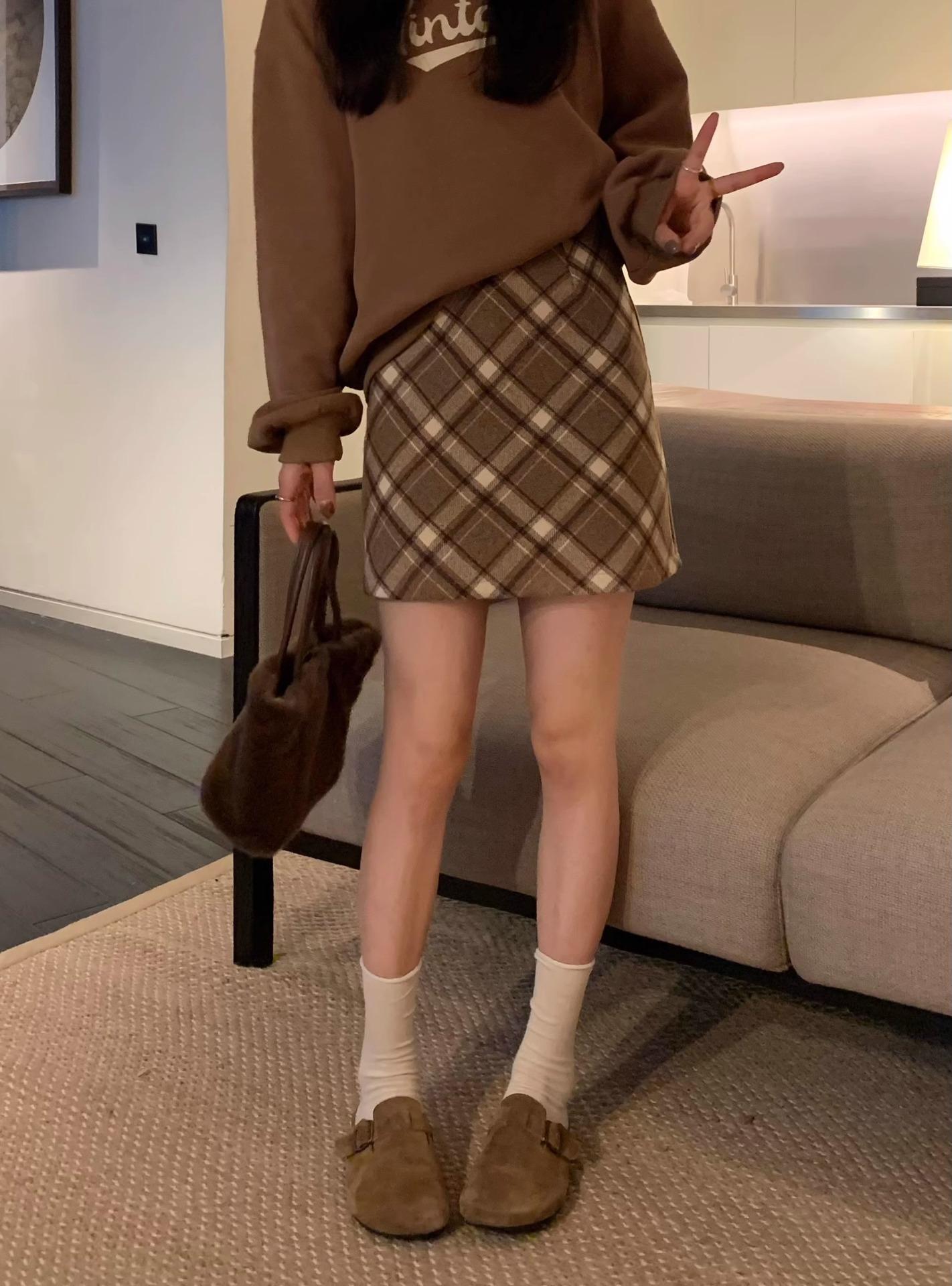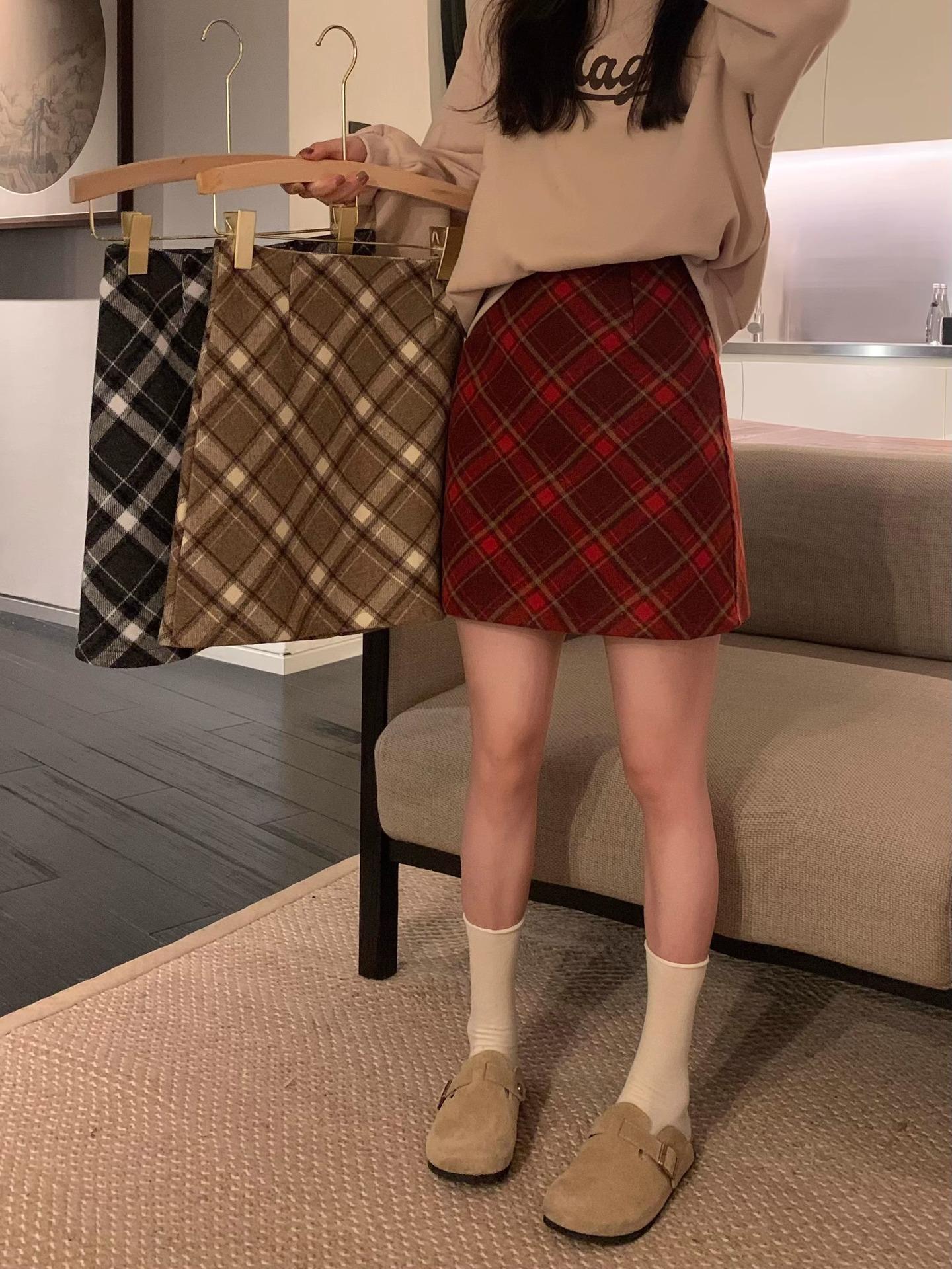 Falda a cuadros pequeña para mujer, otoño e invierno, nueva llegada, roja, de lana, falda de cadera, falda línea A, falda con patrón marrón
