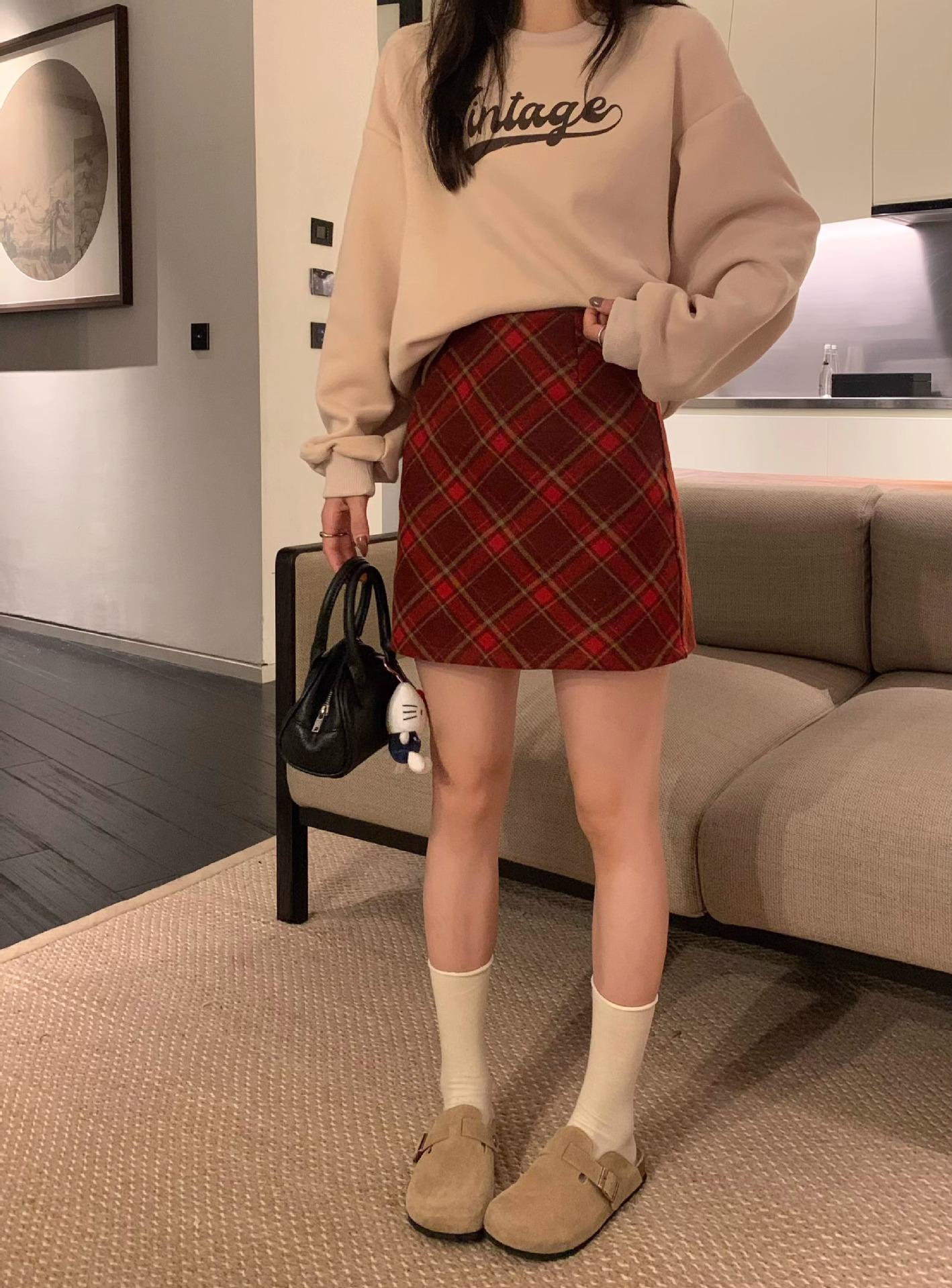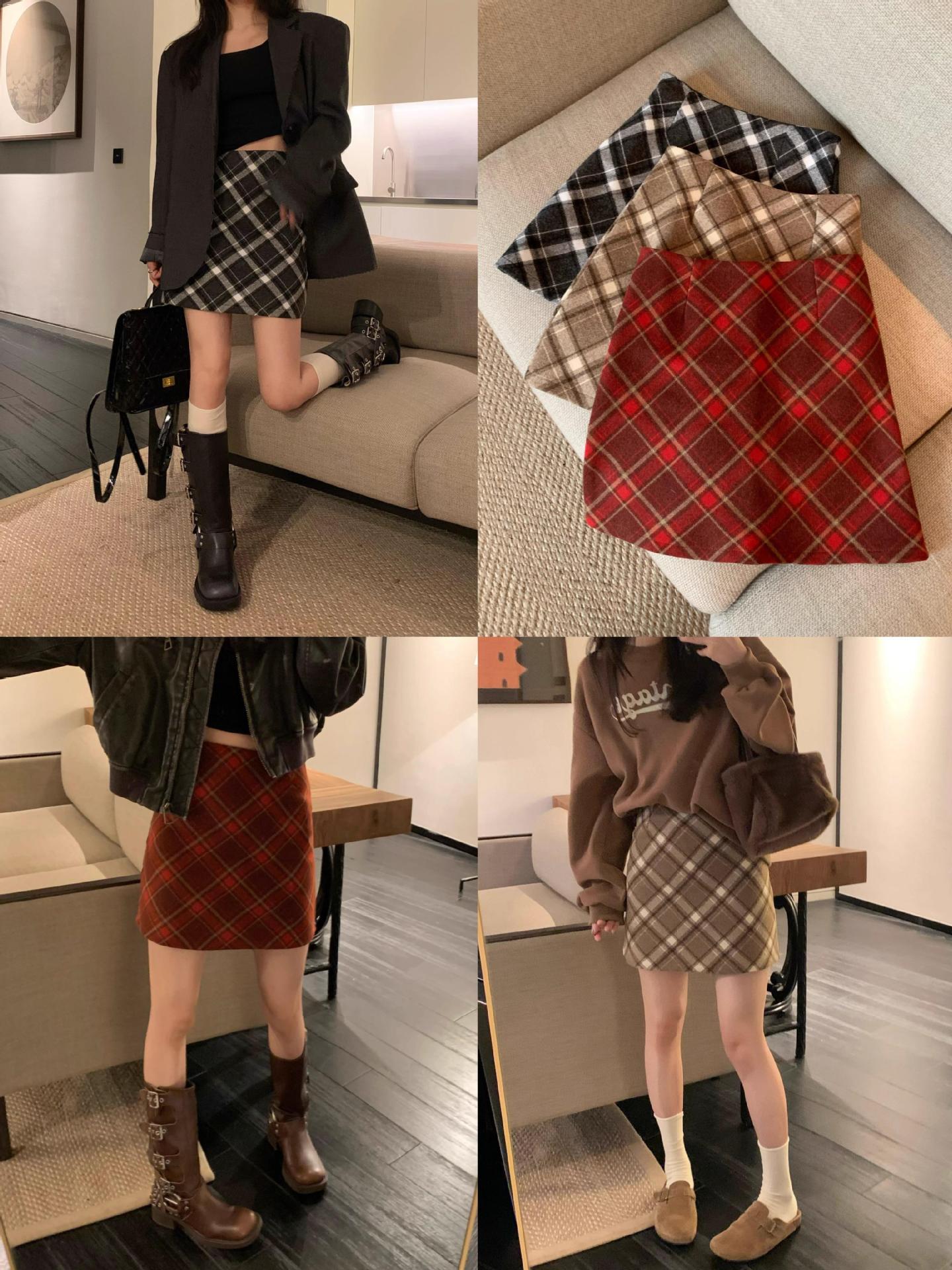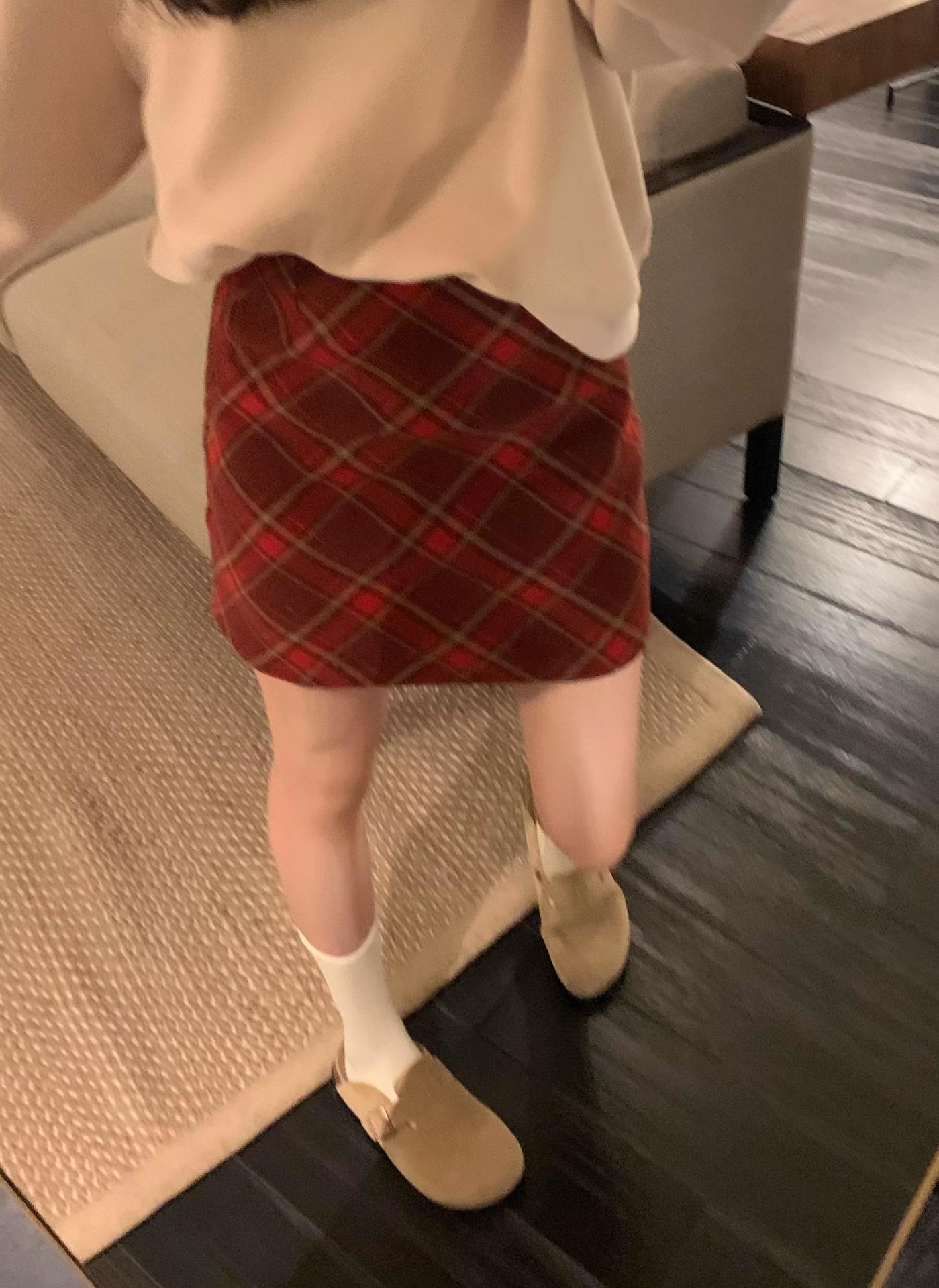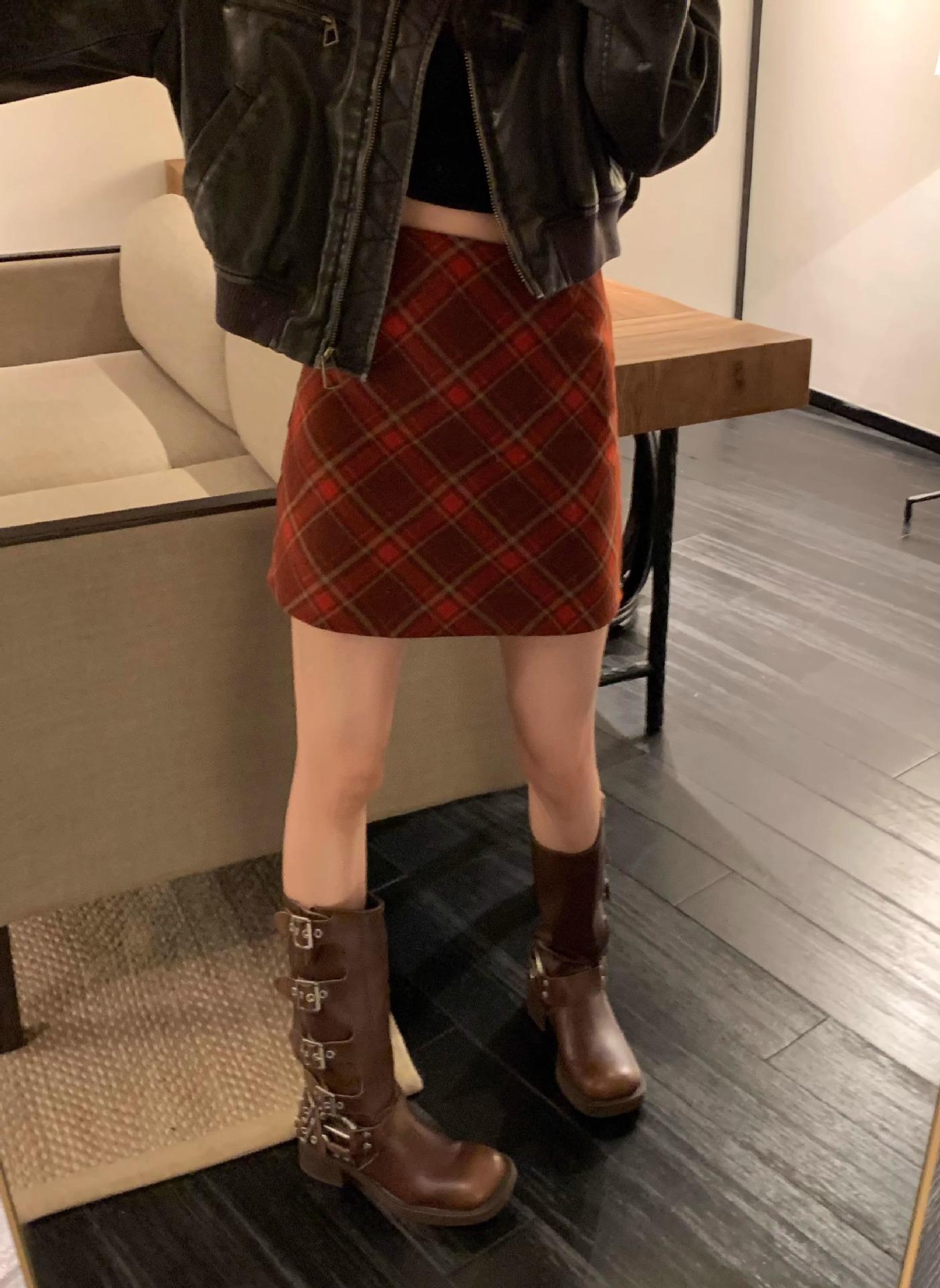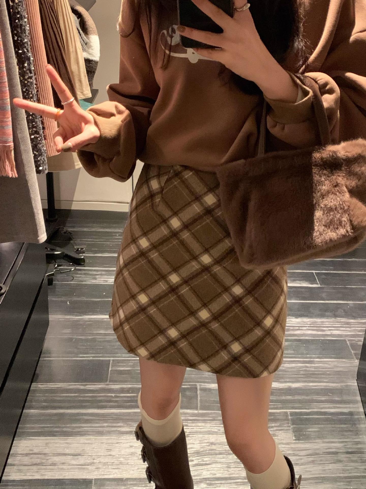 Falda a cuadros pequeña para mujer, otoño e invierno, nueva llegada, roja, de lana, falda de cadera, falda línea A, falda con patrón marrón