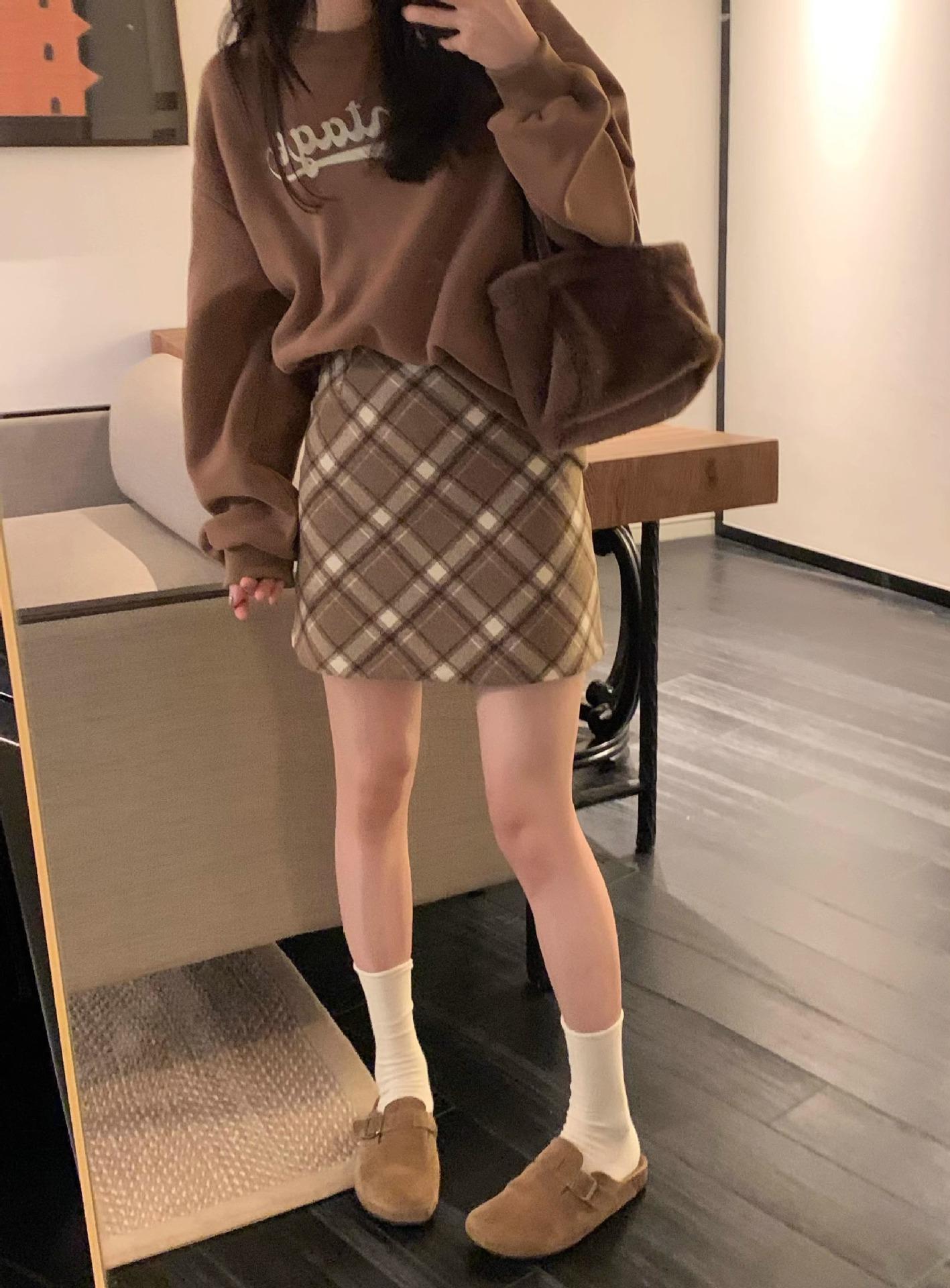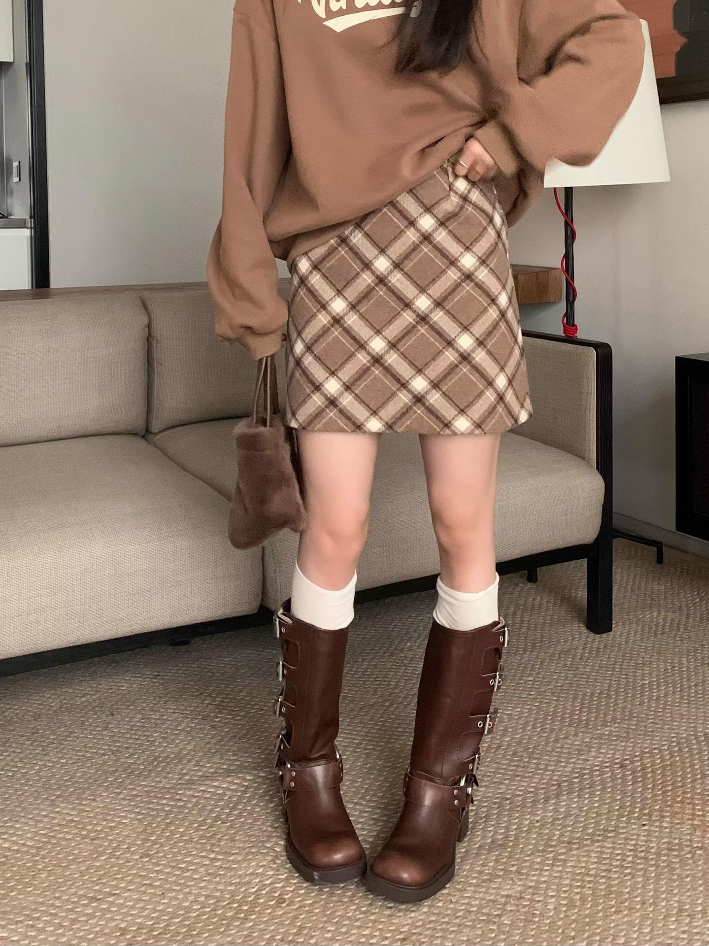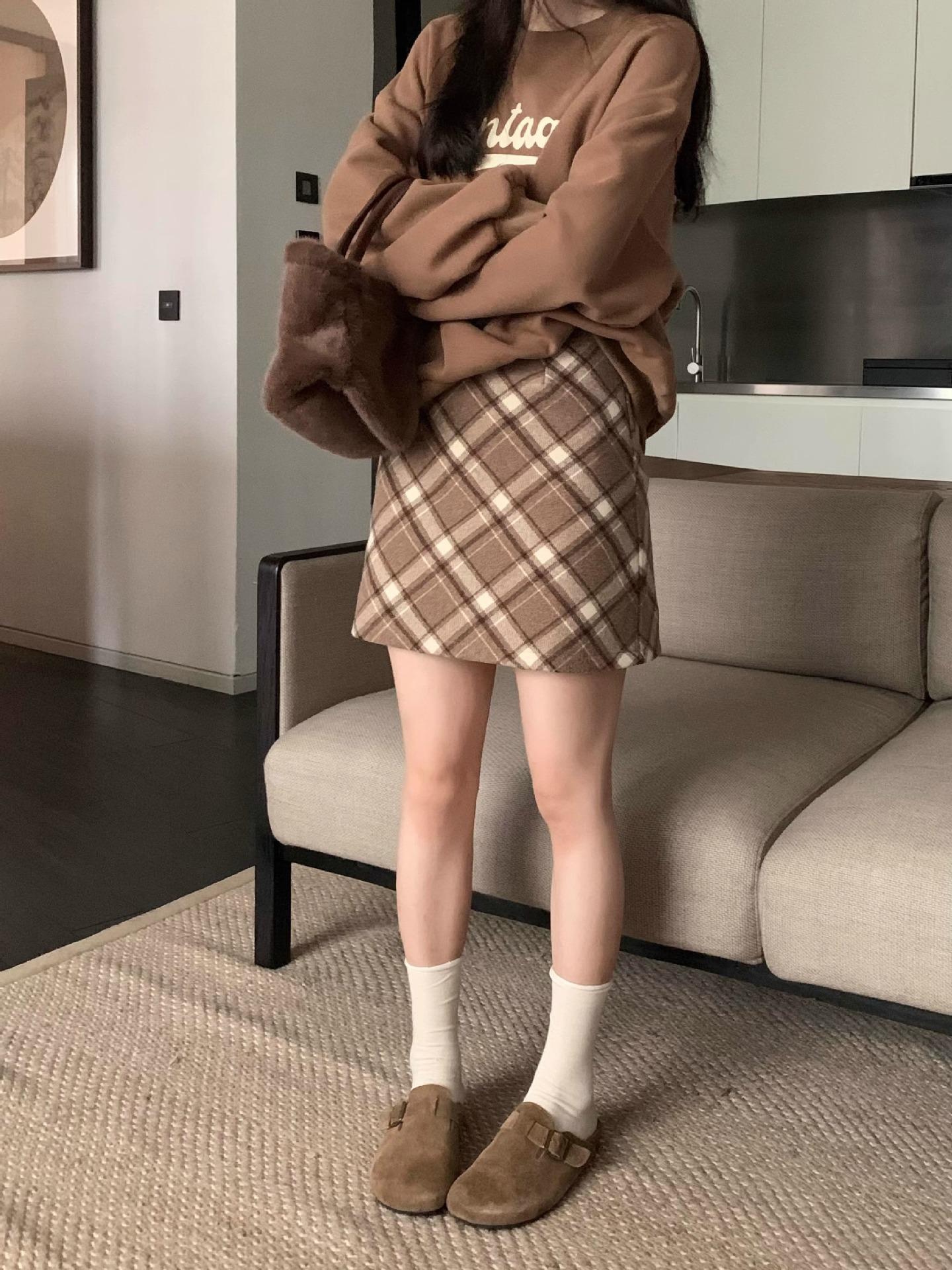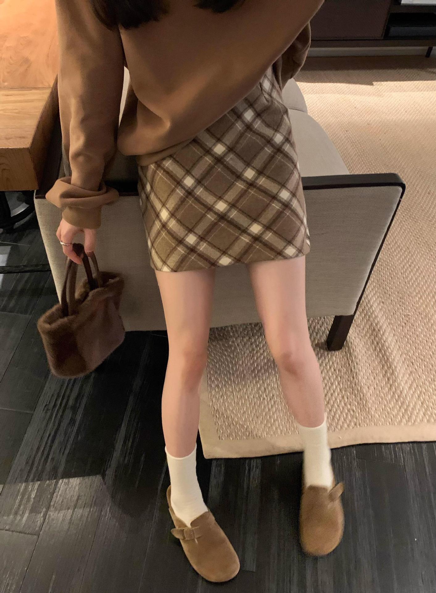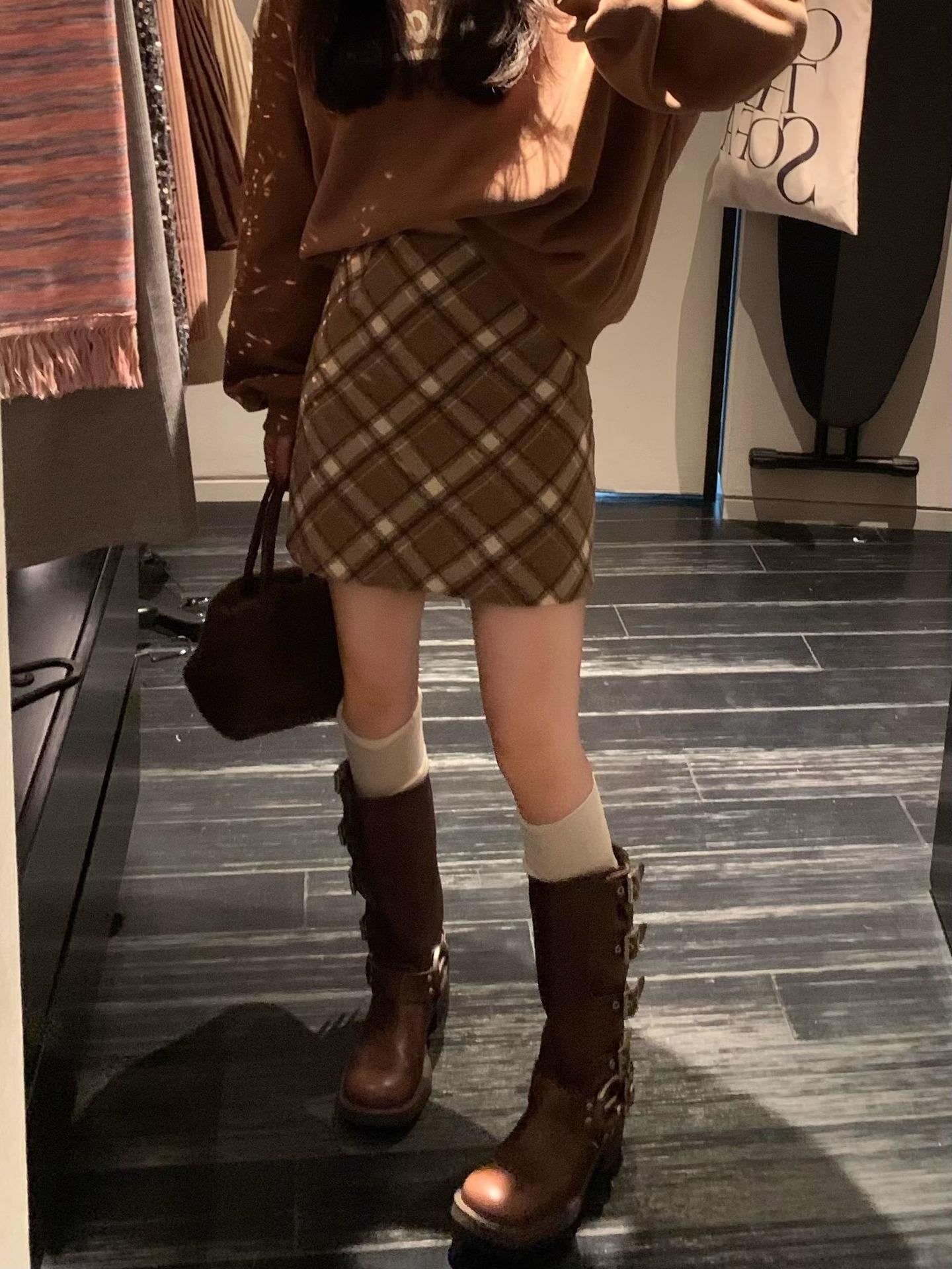 Falda a cuadros pequeña para mujer, otoño e invierno, nueva llegada, roja, de lana, falda de cadera, falda línea A, falda con patrón marrón