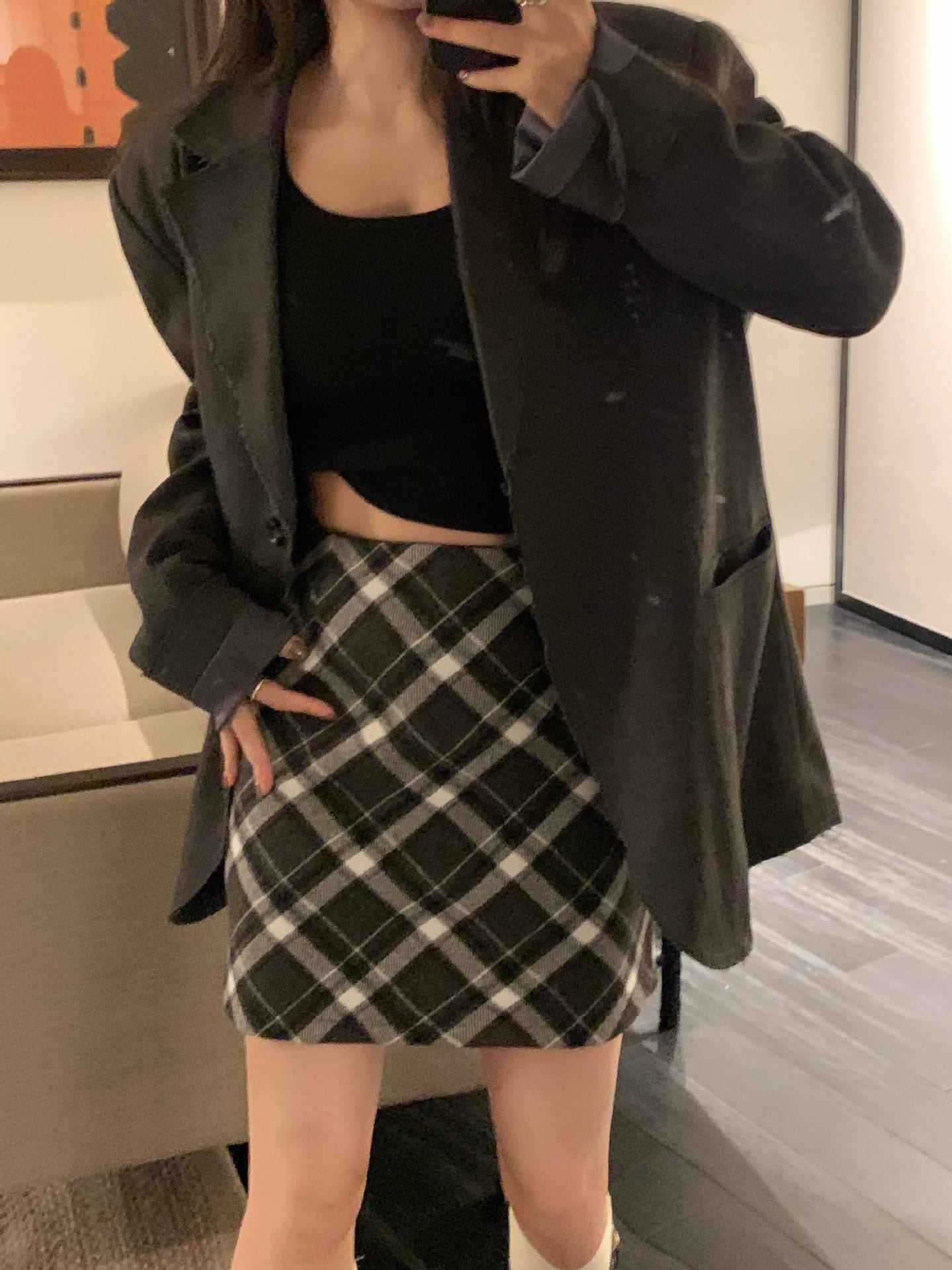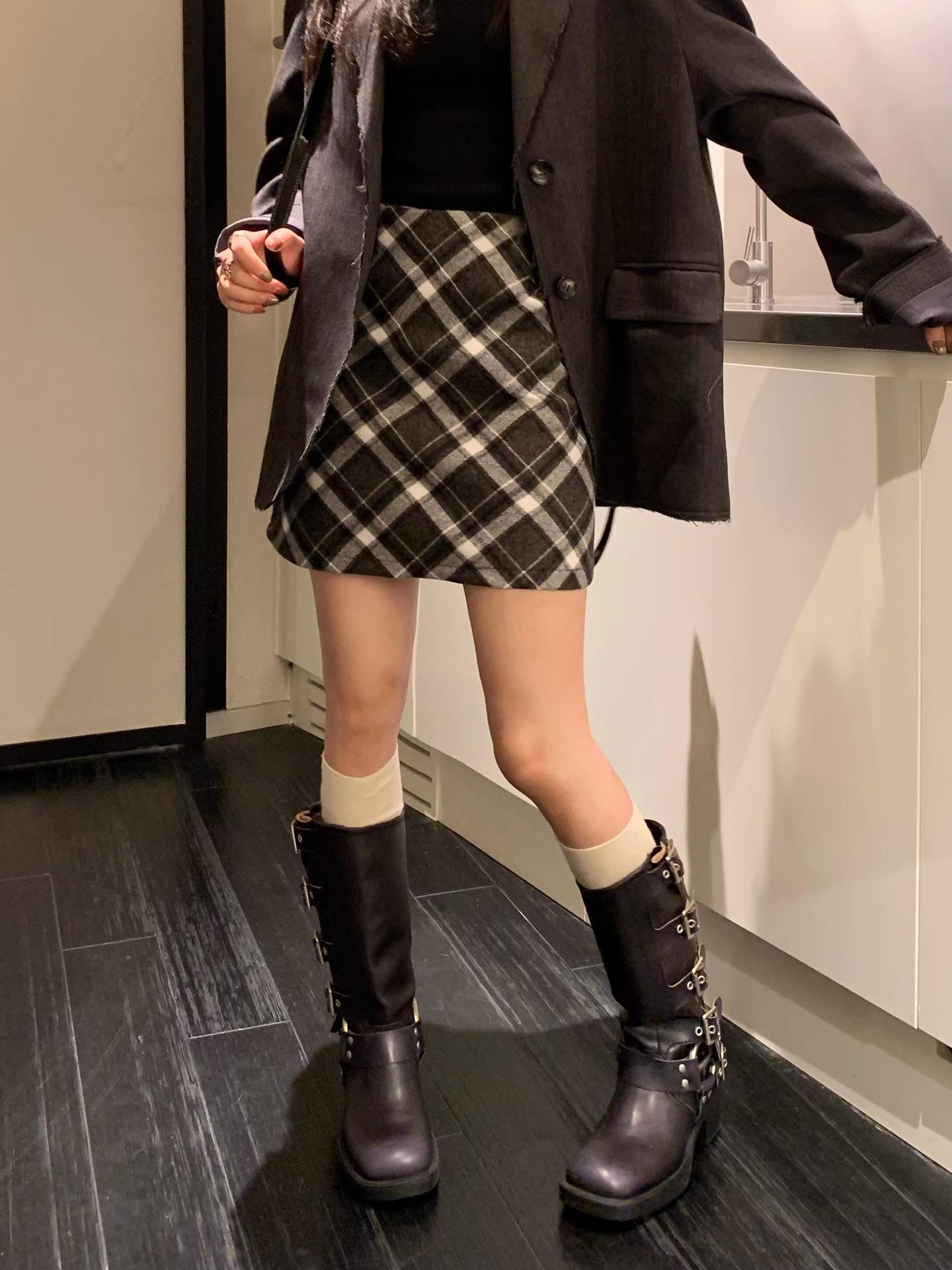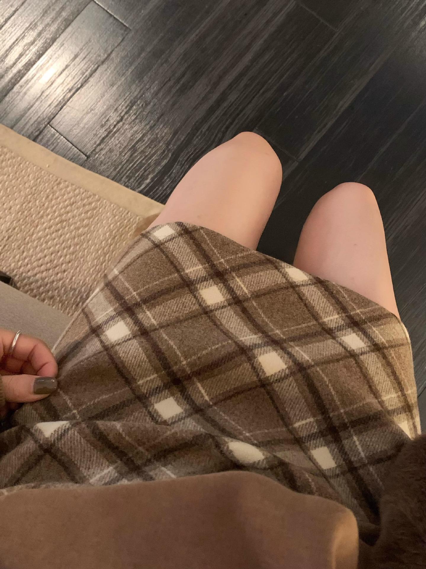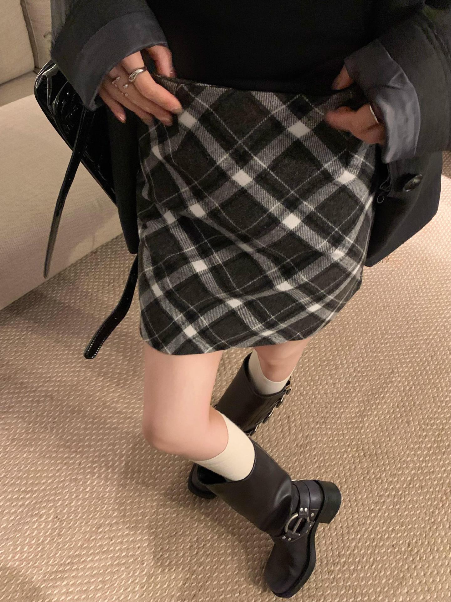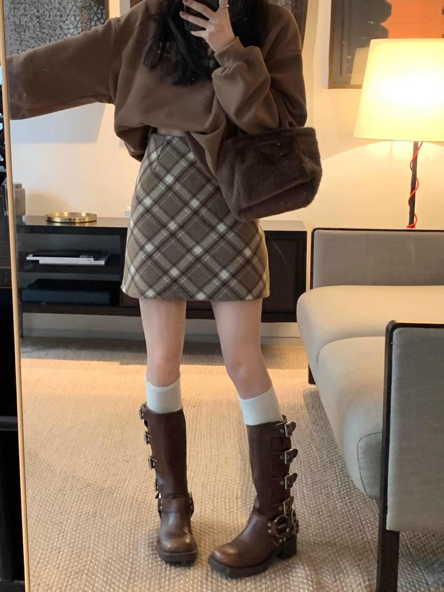 Falda a cuadros pequeña para mujer, otoño e invierno, nueva llegada, roja, de lana, falda de cadera, falda línea A, falda con patrón marrón