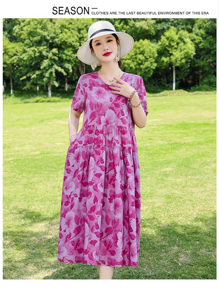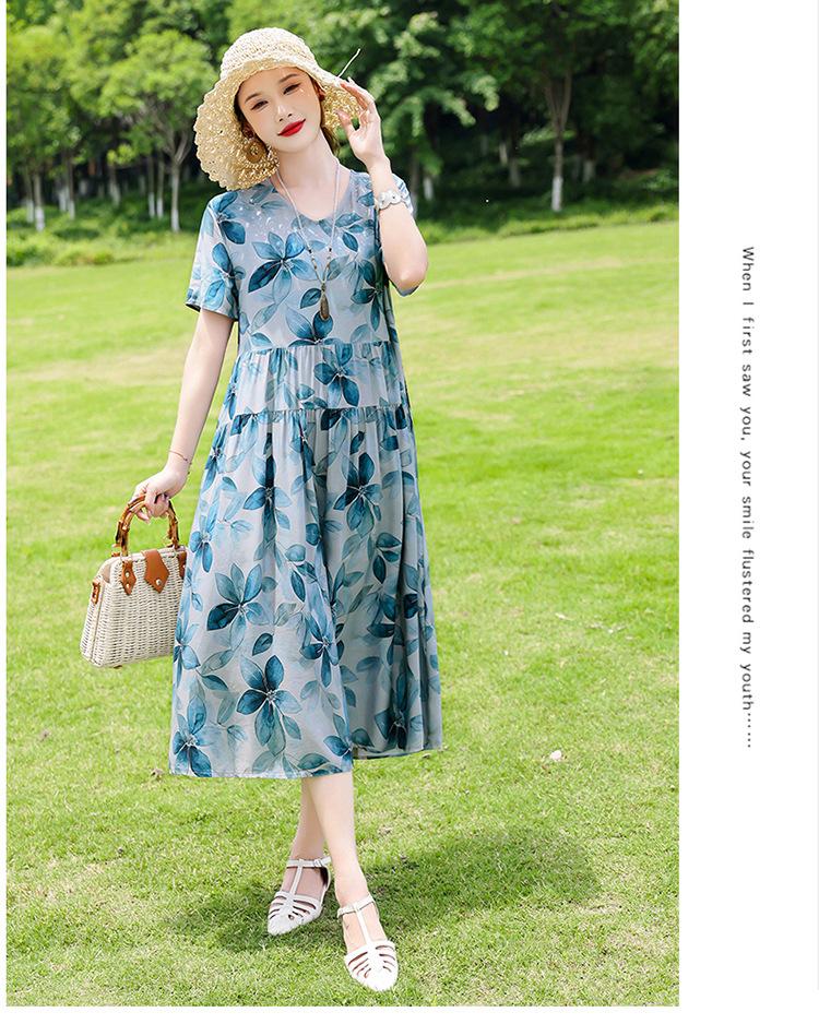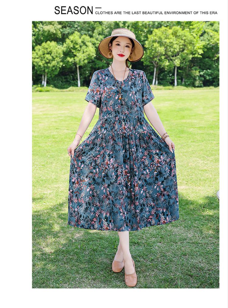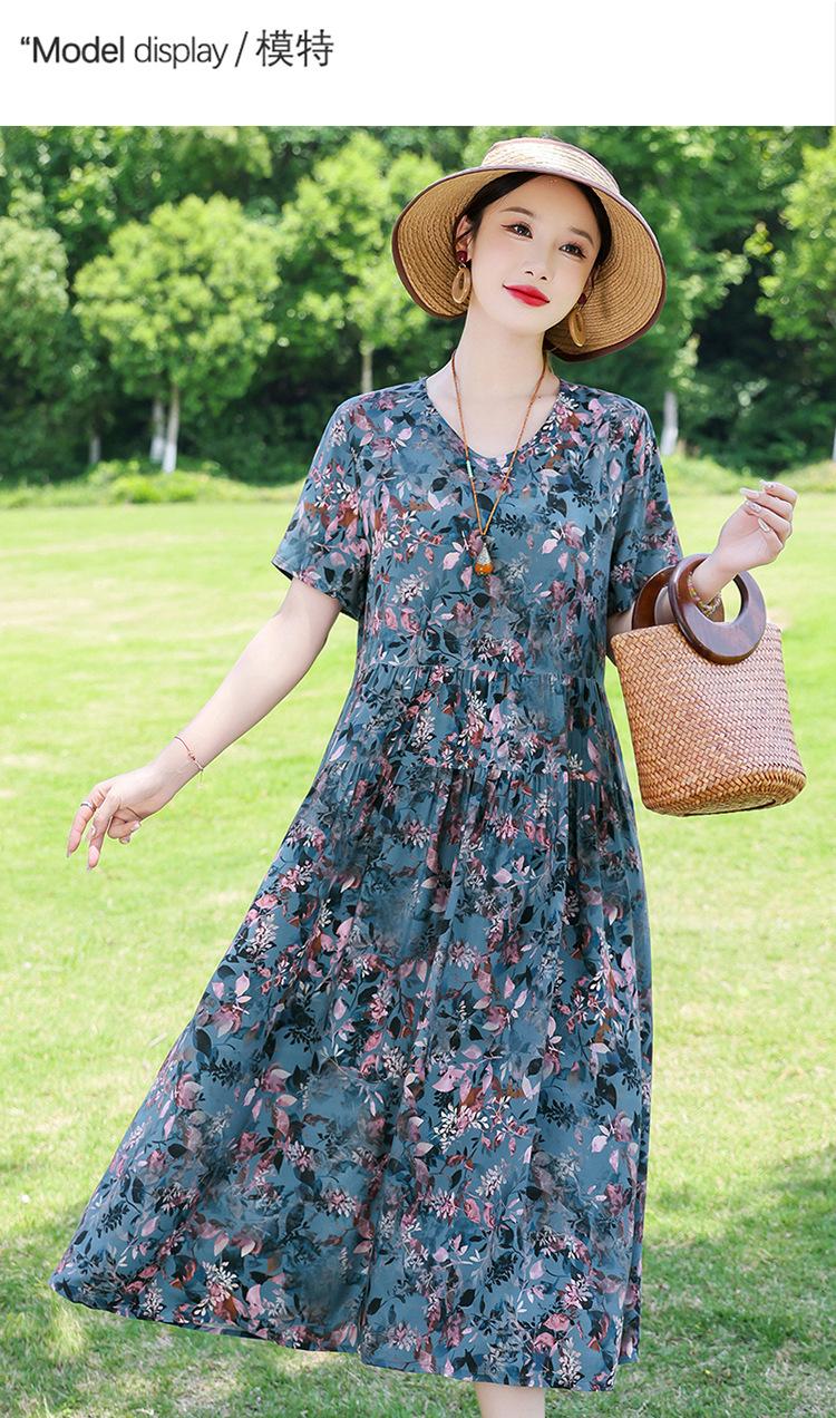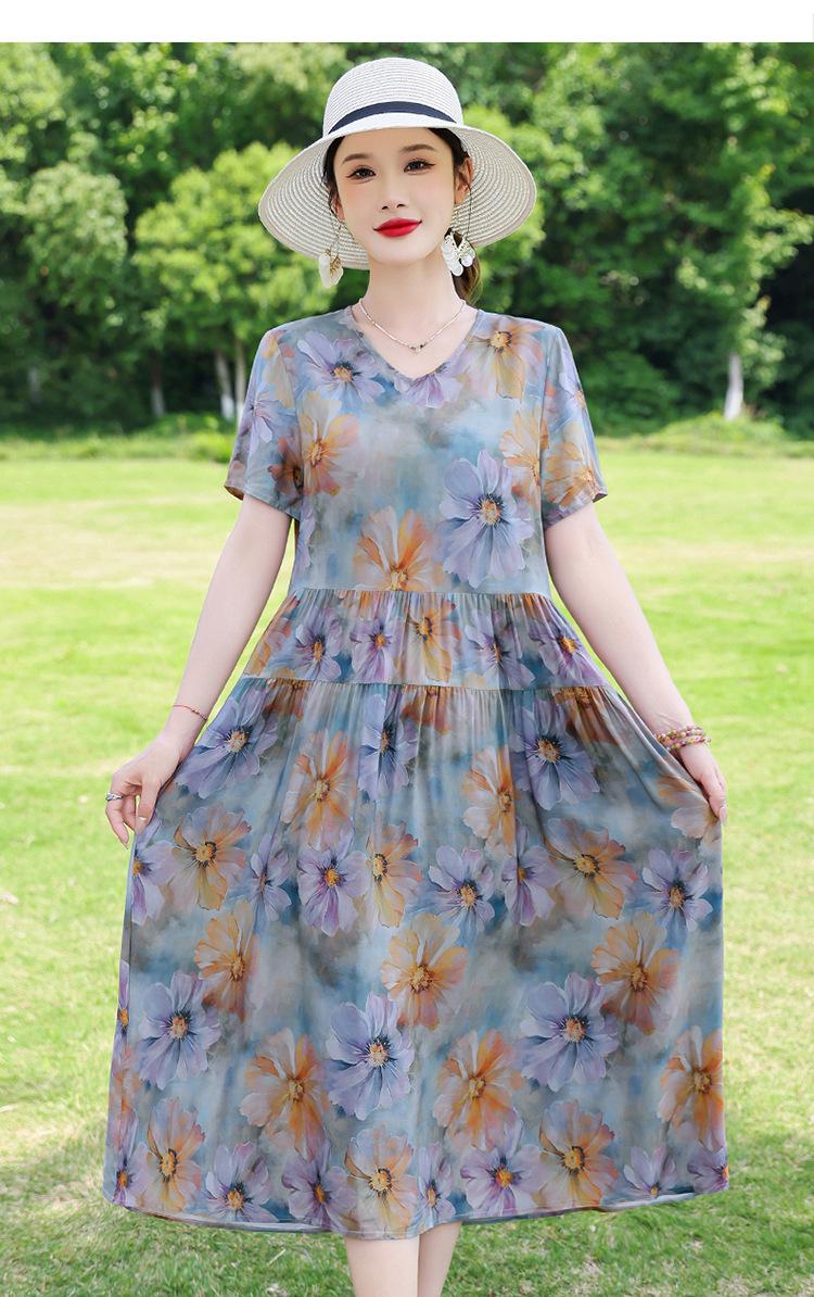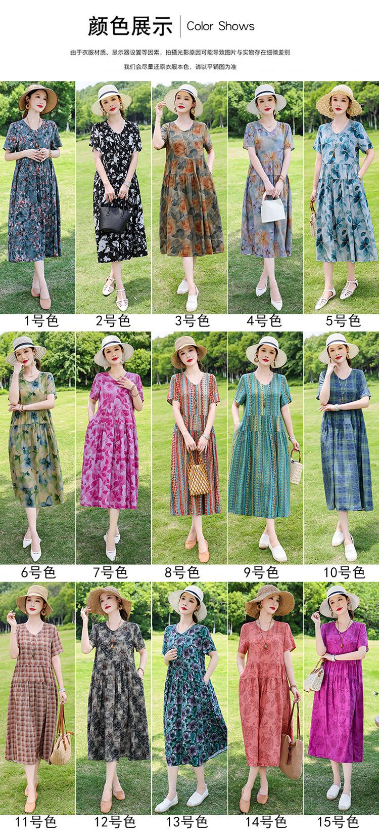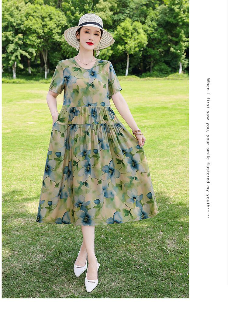 Vestido de Algodón Seda de Verano Nuevo para Mujer, Holgado y Ajustado, Madres de Mediana Edad y Mayores, Falda de Vuelo Amplio, Falda Larga con Temperamento