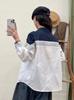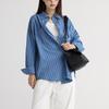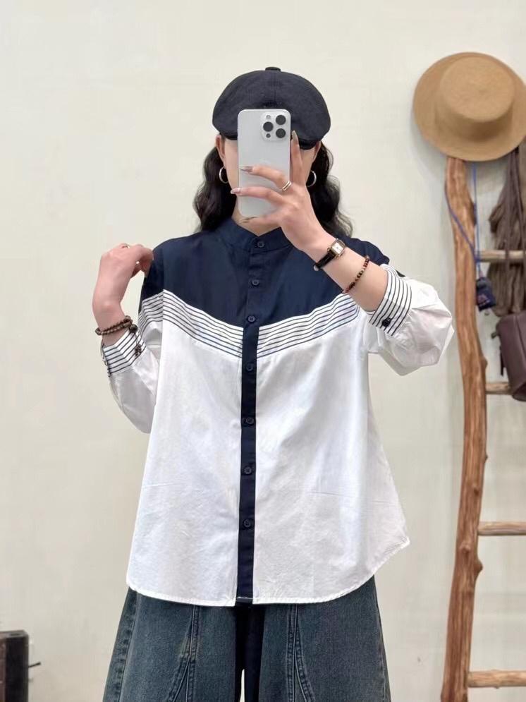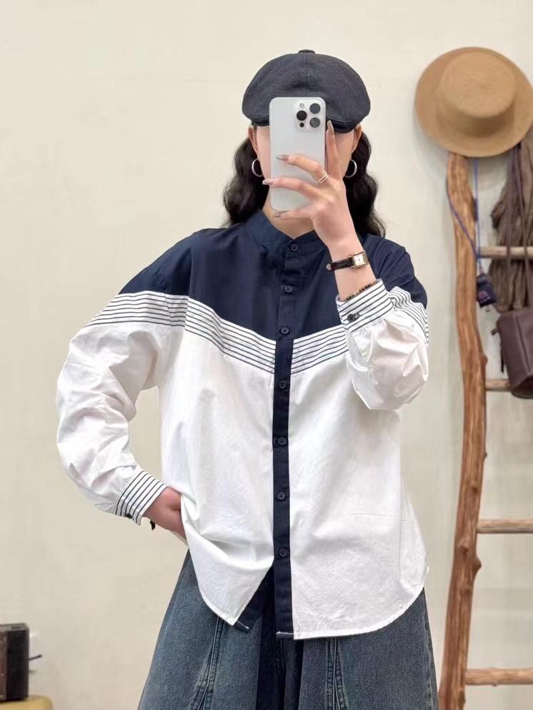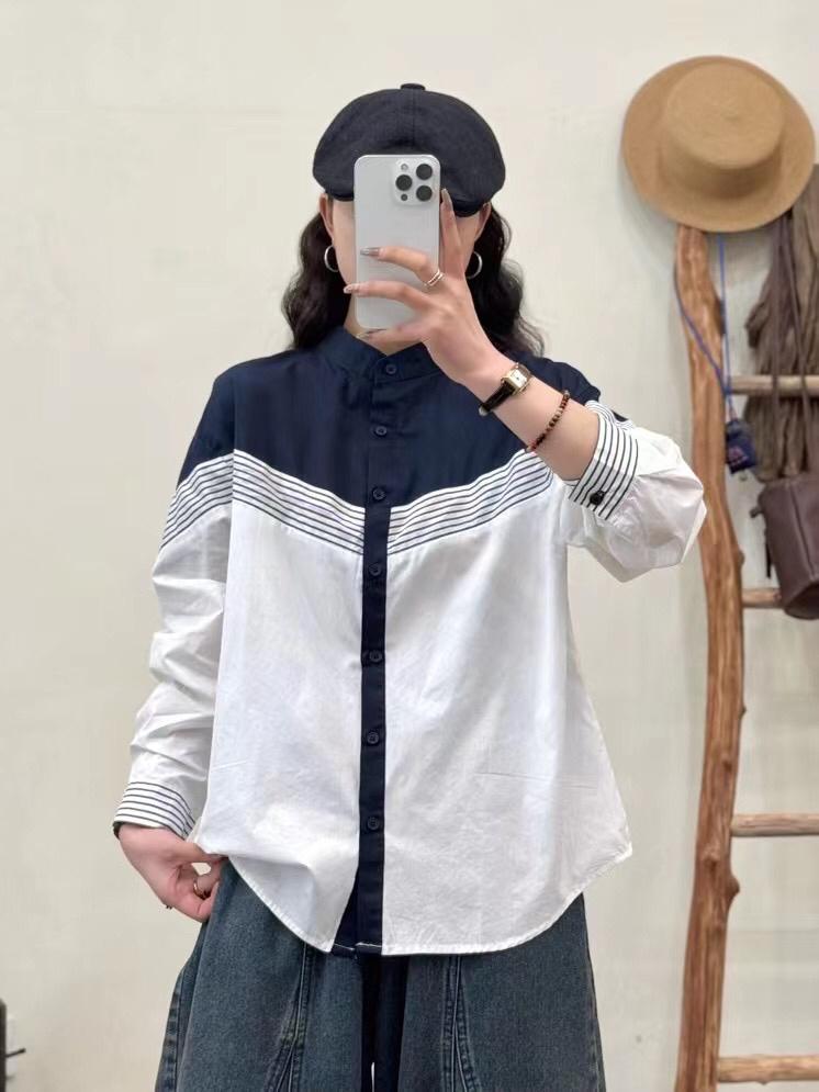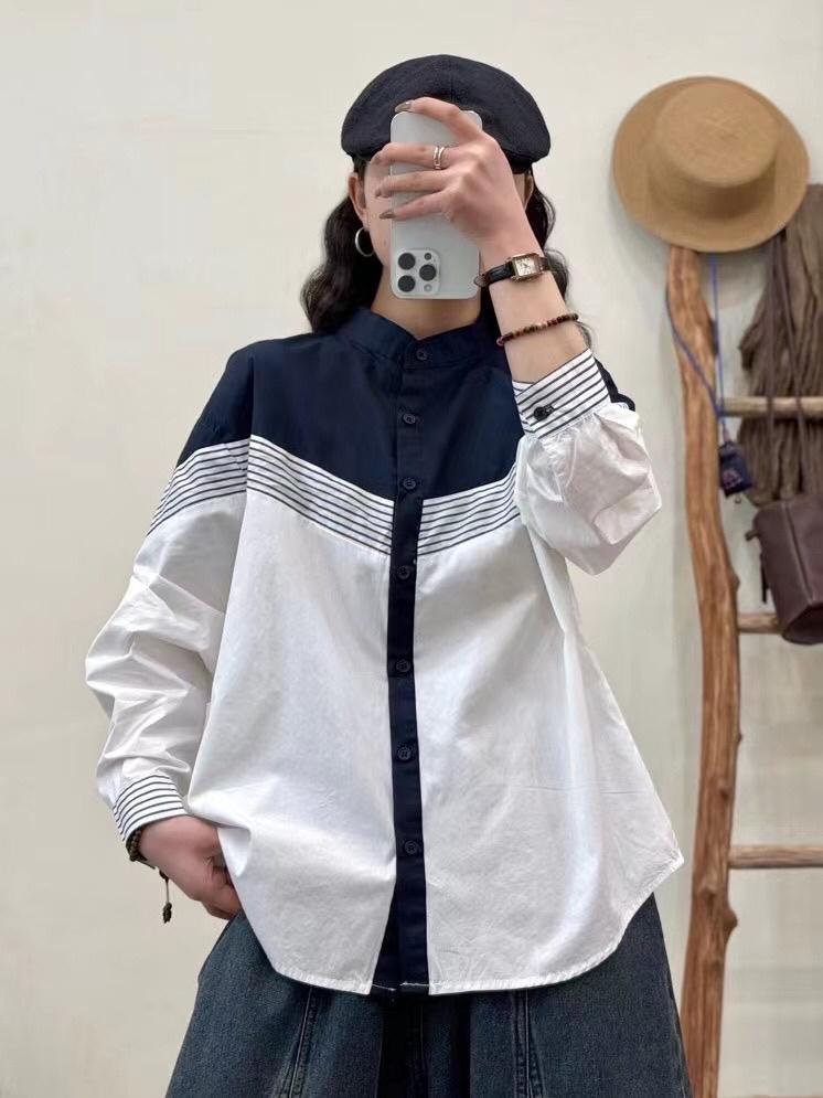Camisa a Rayas de Cuello Alto con Costuras en Color de Contraste Chaqueta de Diseño para Mujer Primavera y Verano Holgada Casual Elegante Algodón Puro Manga Larga