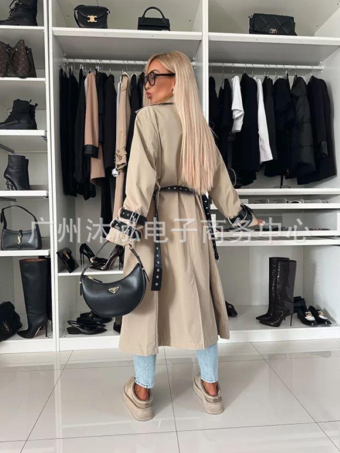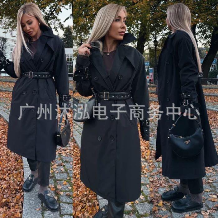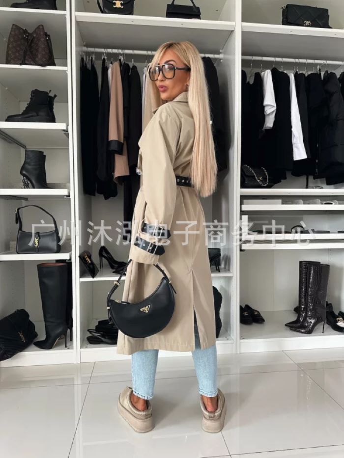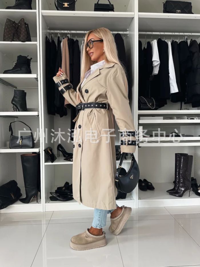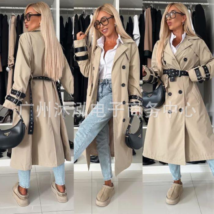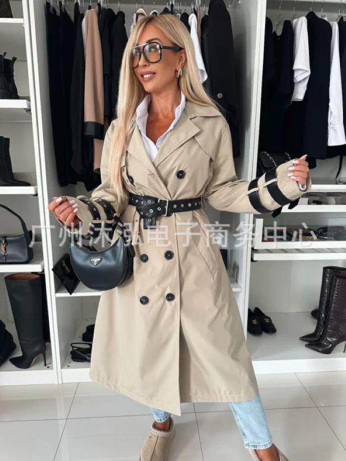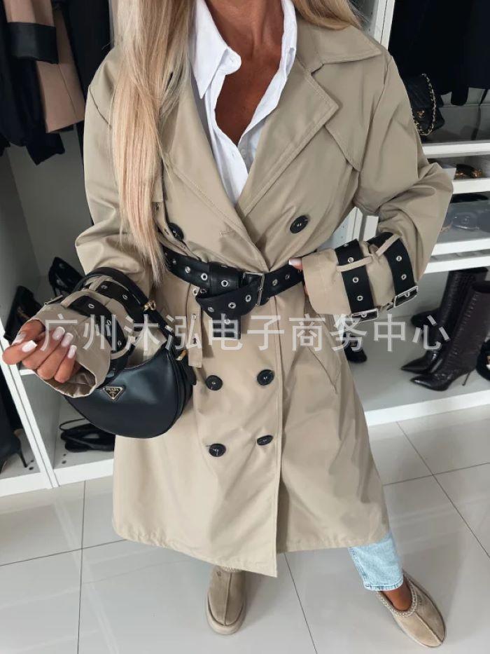 2025 Nuevo Cortavientos Cruzado Europeo y Americano de Largo Medio para Mujer Diseño de Estilo Británico Doble Botonadura con Cinturón