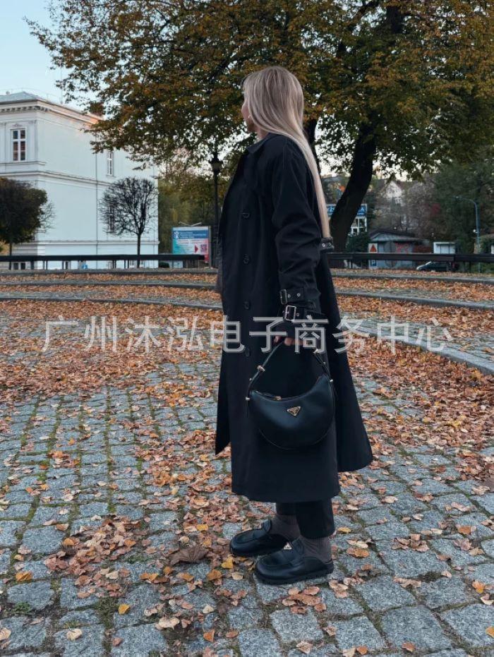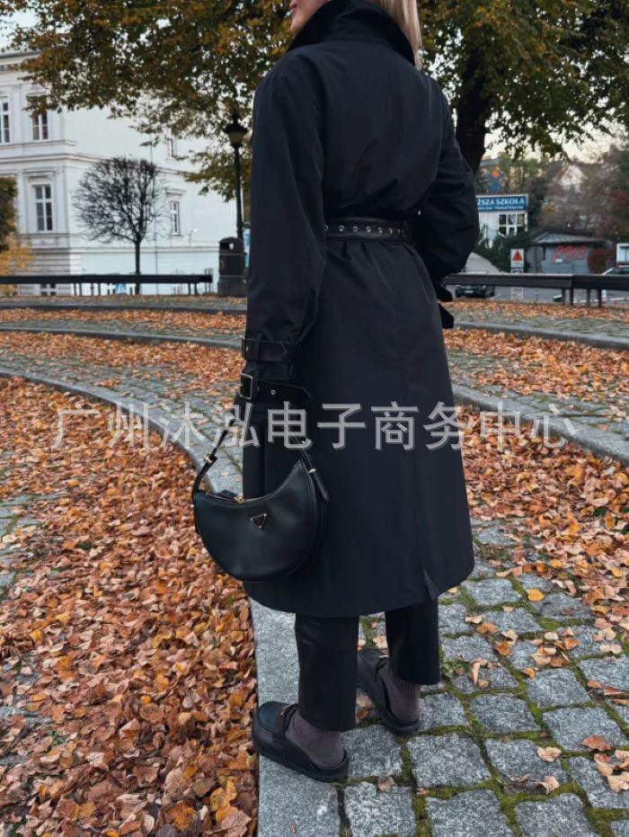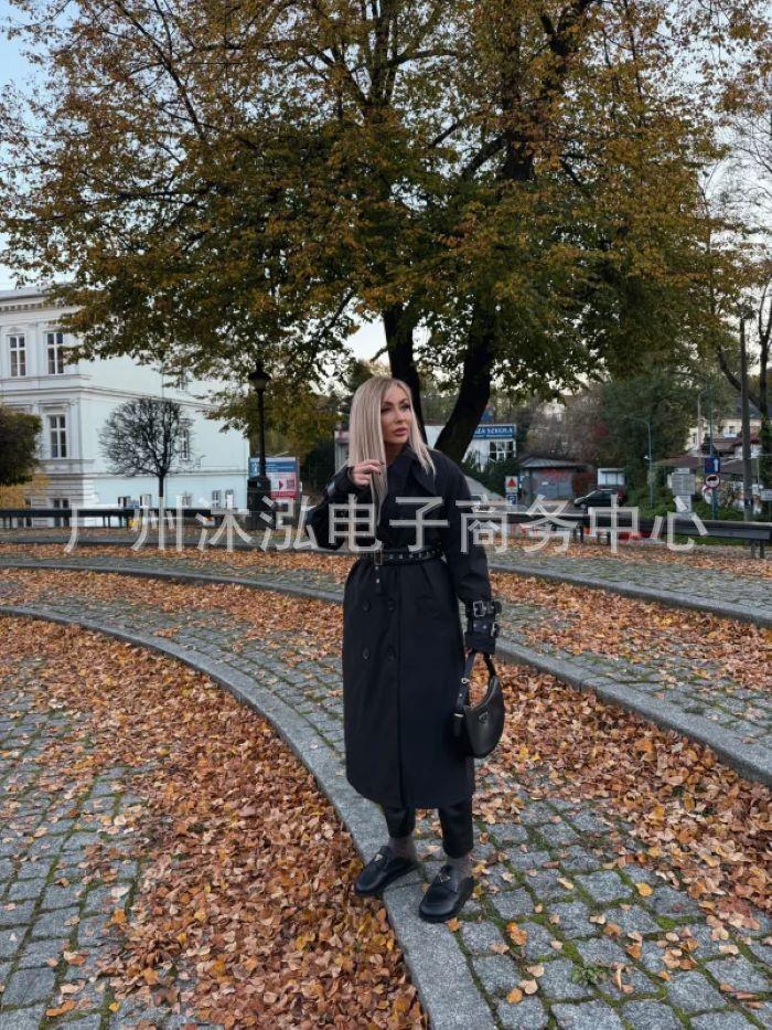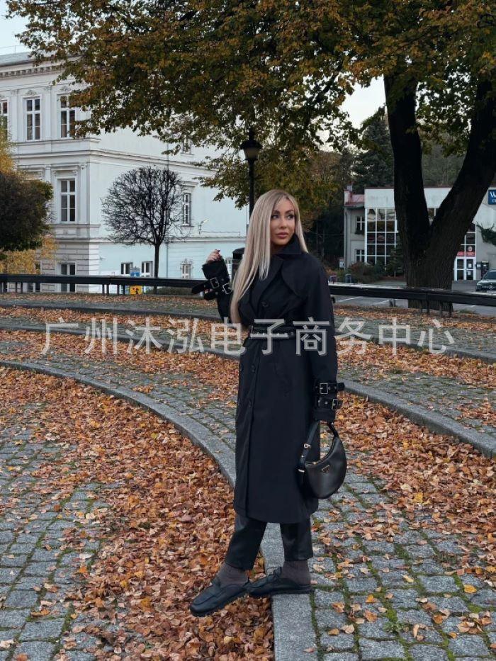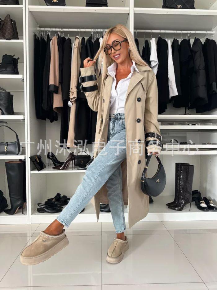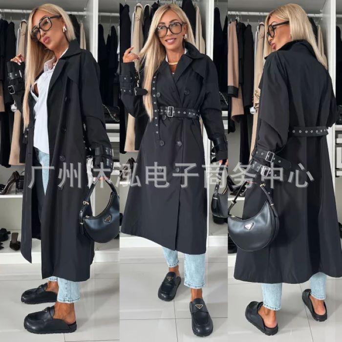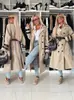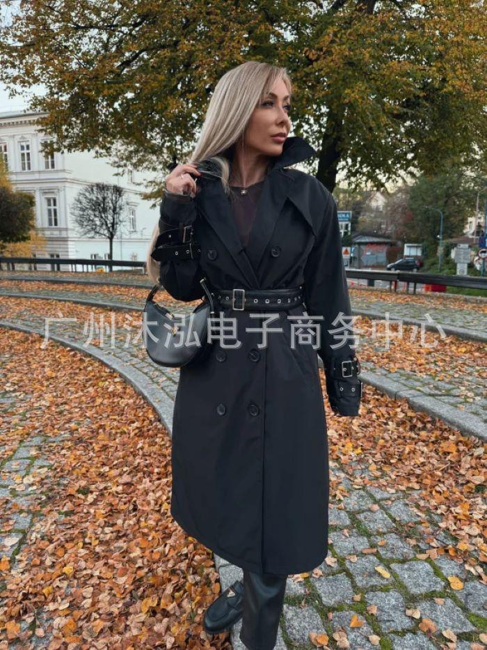 2025 Nuevo Cortavientos Cruzado Europeo y Americano de Largo Medio para Mujer Diseño de Estilo Británico Doble Botonadura con Cinturón
