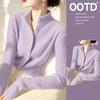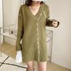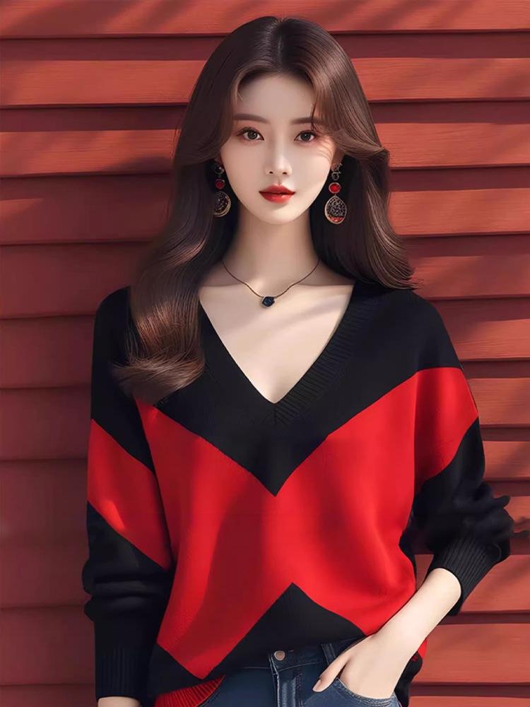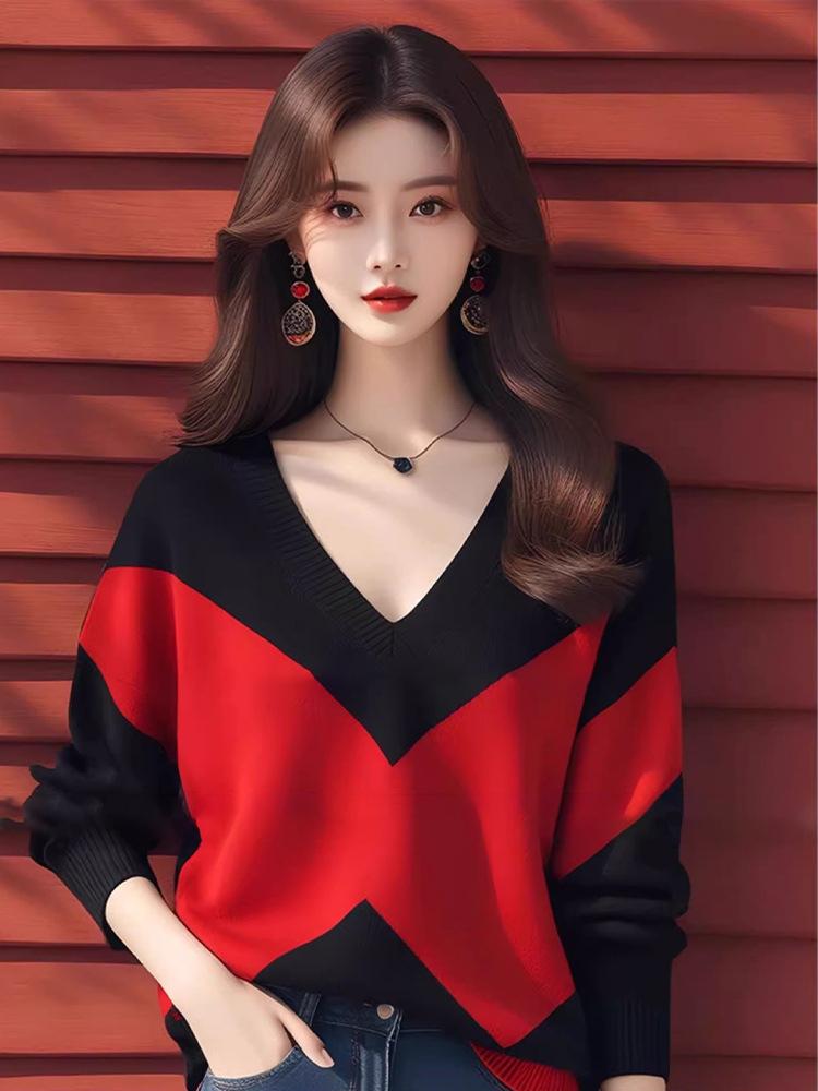 Suéter de punto de otoño e invierno único y exquisito estilo perezoso holgado con cuello en V para mujer, diseño de nicho con bloques de color absolutamente hermoso