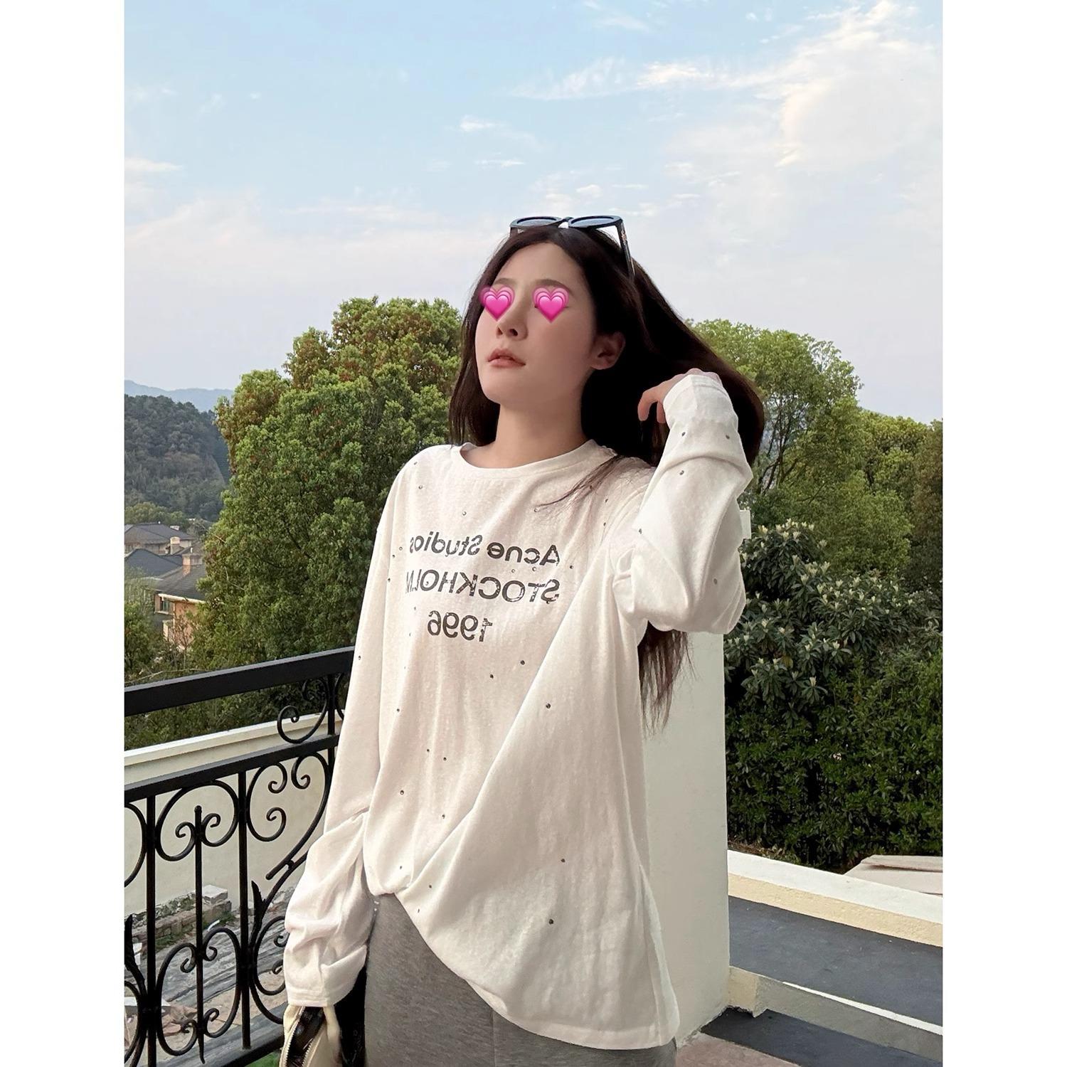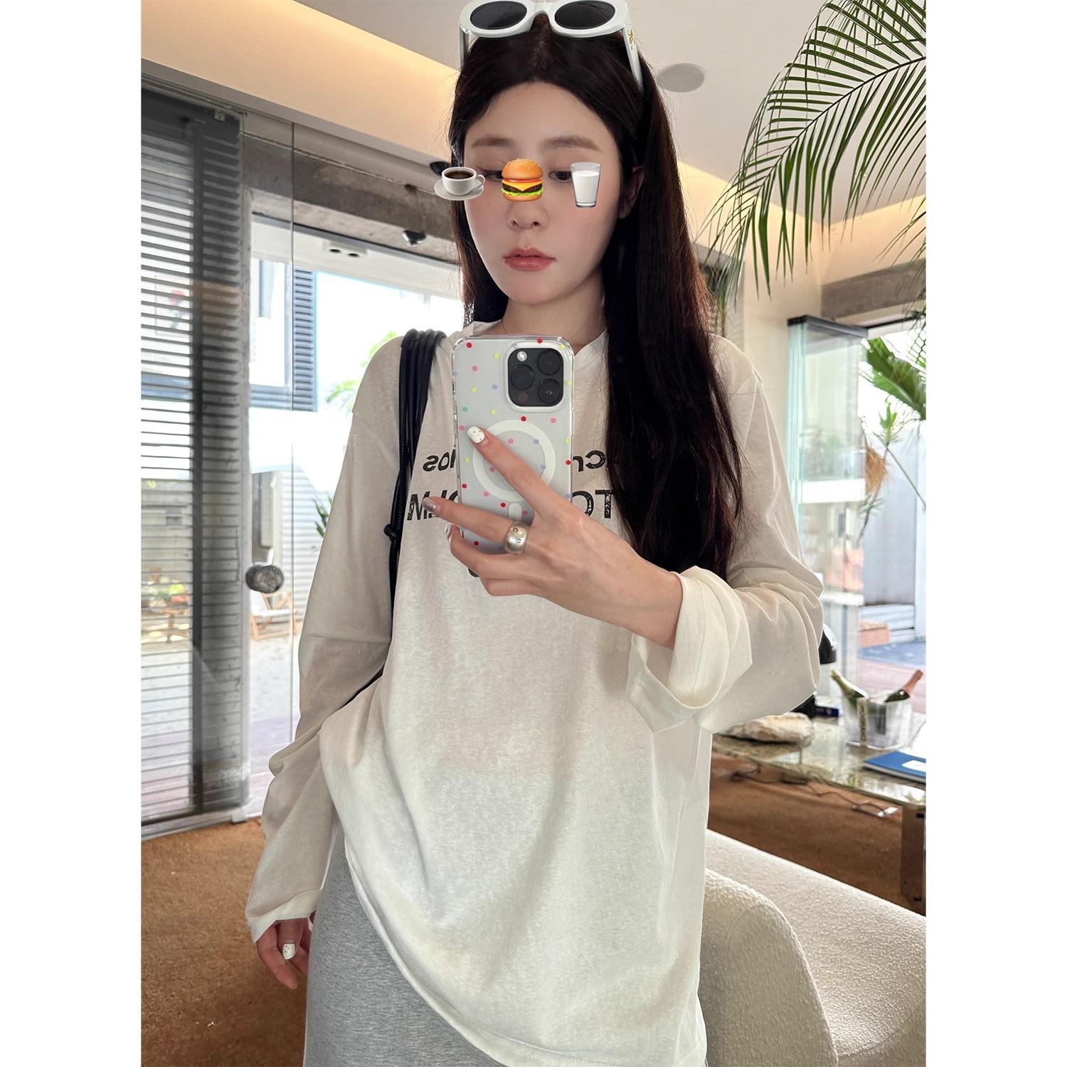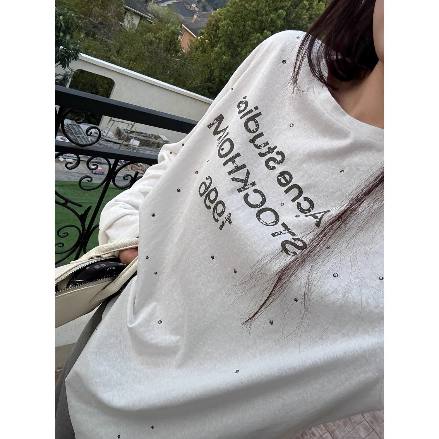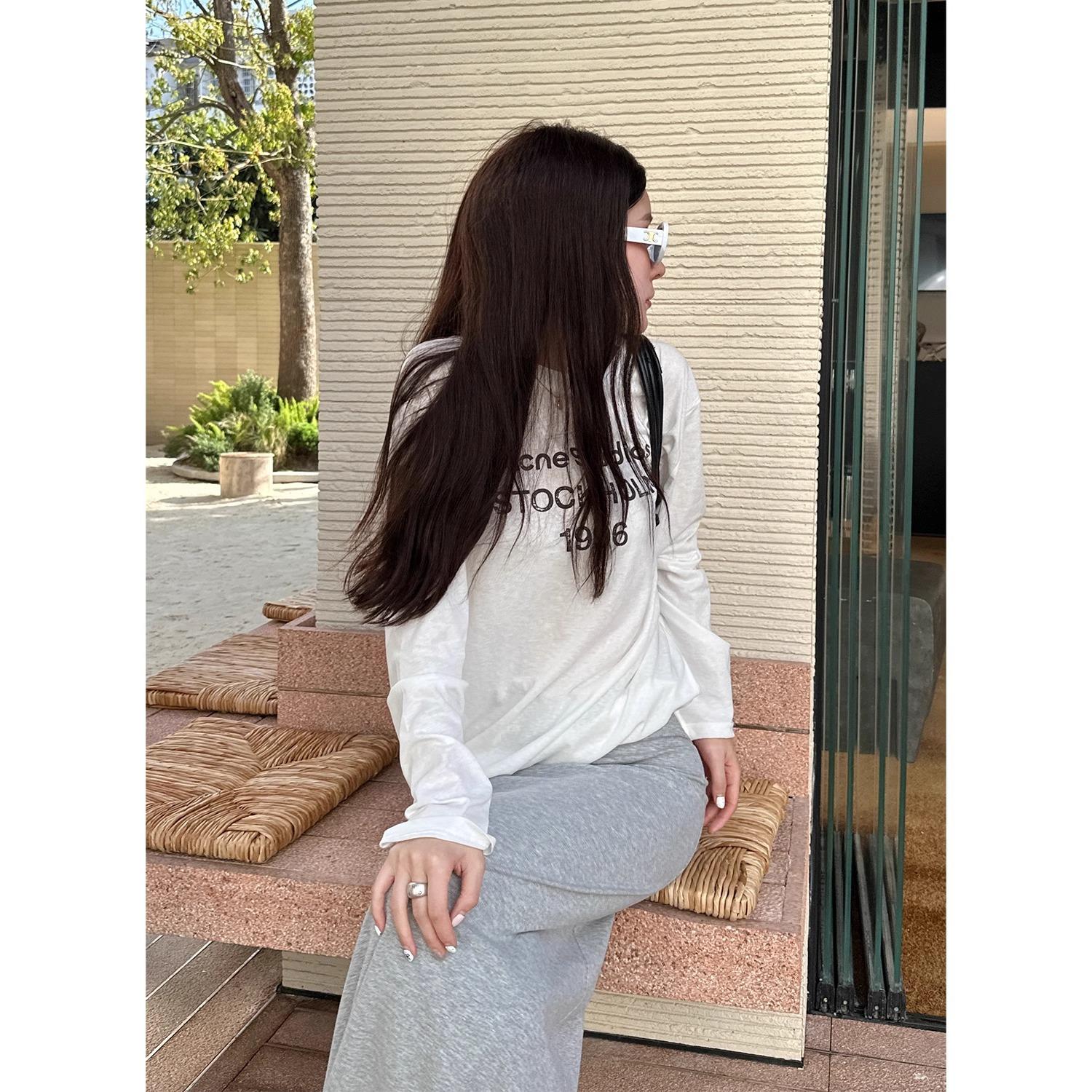 Playera de Manga Larga con Letras Estampadas Retro Americano, Top Versátil Casual Holgado para Mujer para Primavera y Verano, Manga Larga Básica