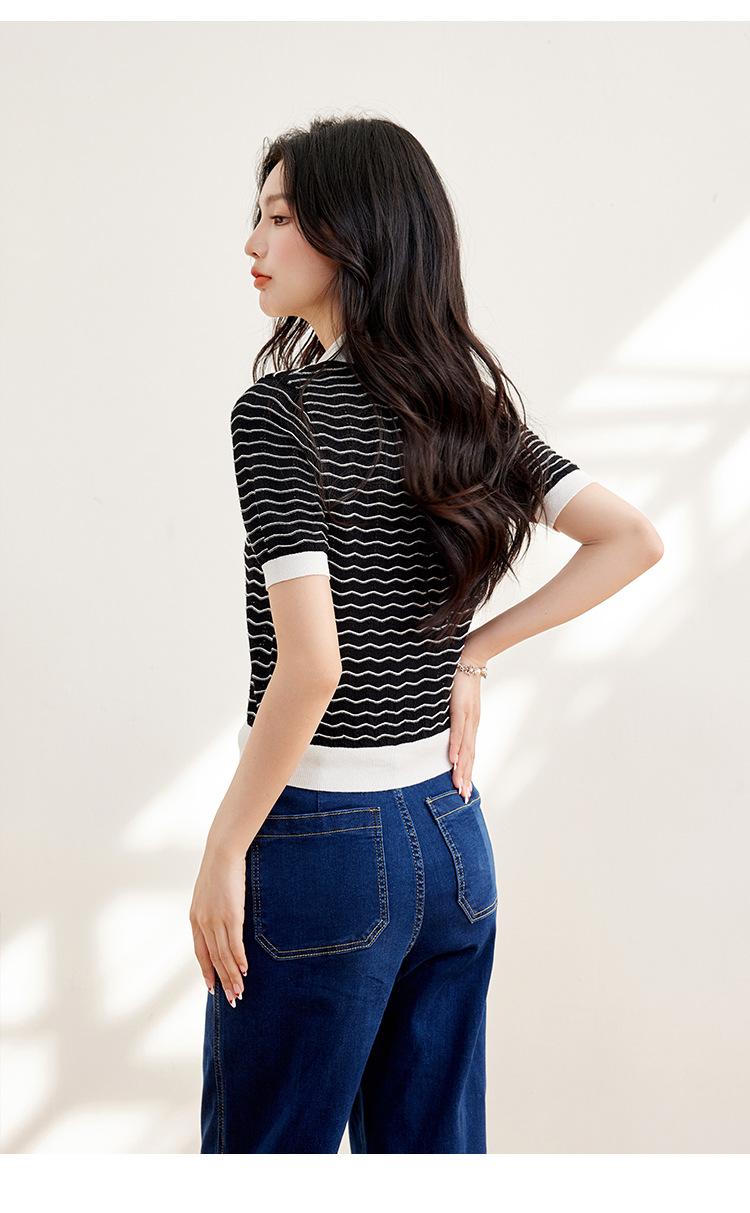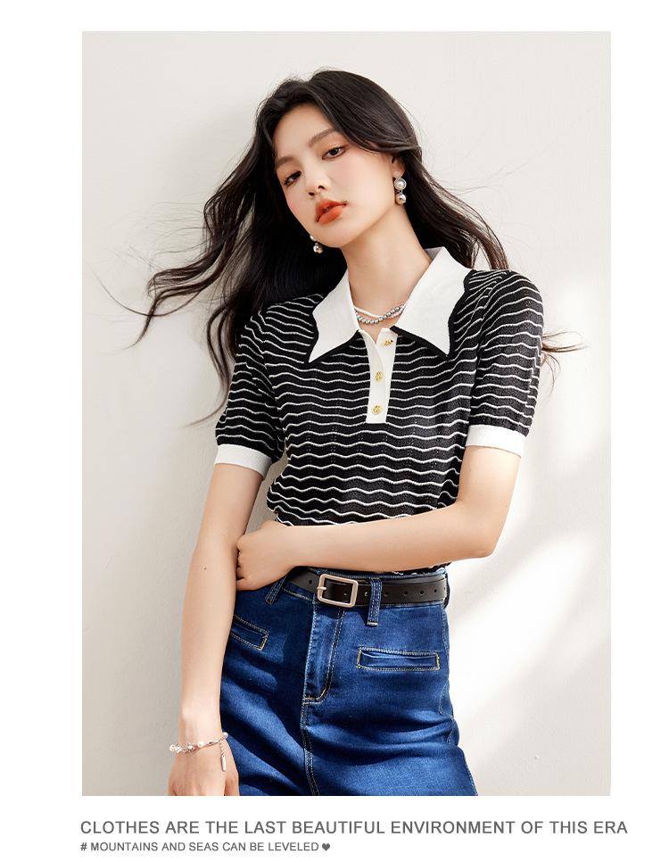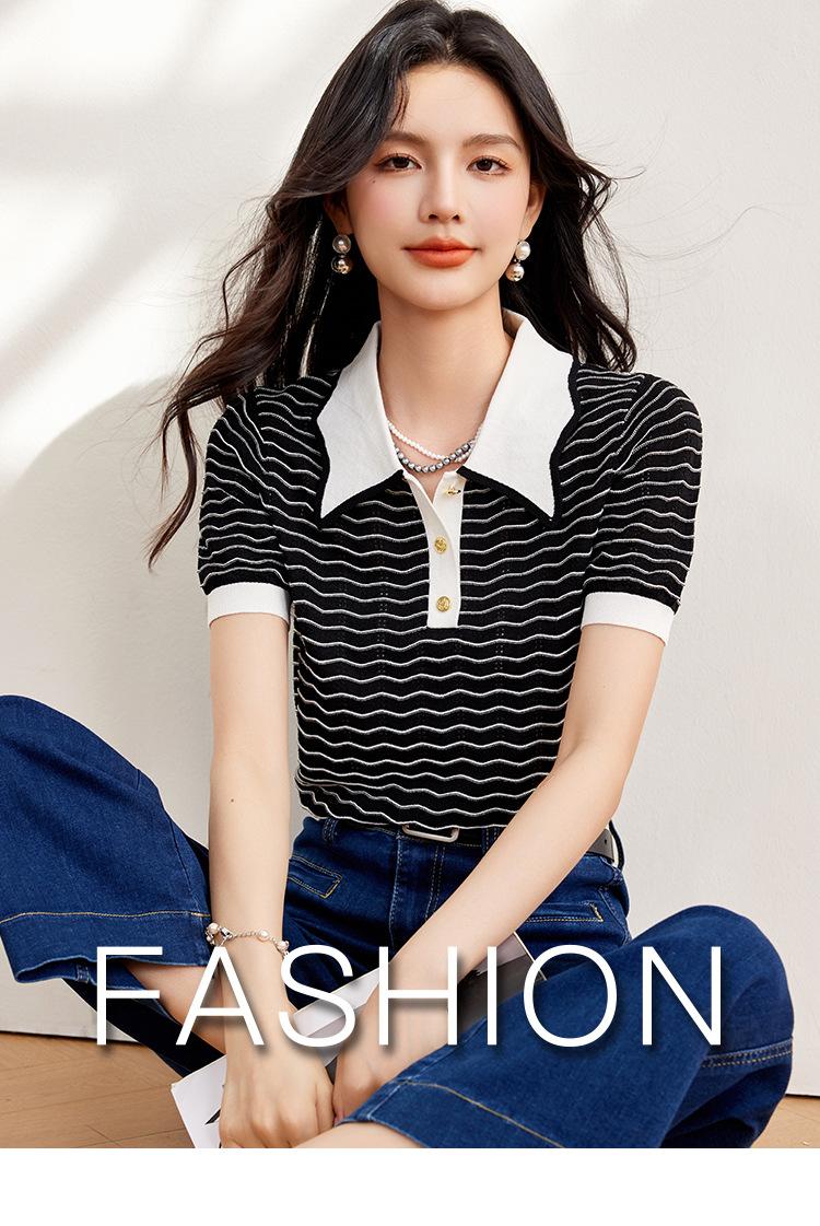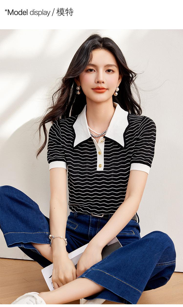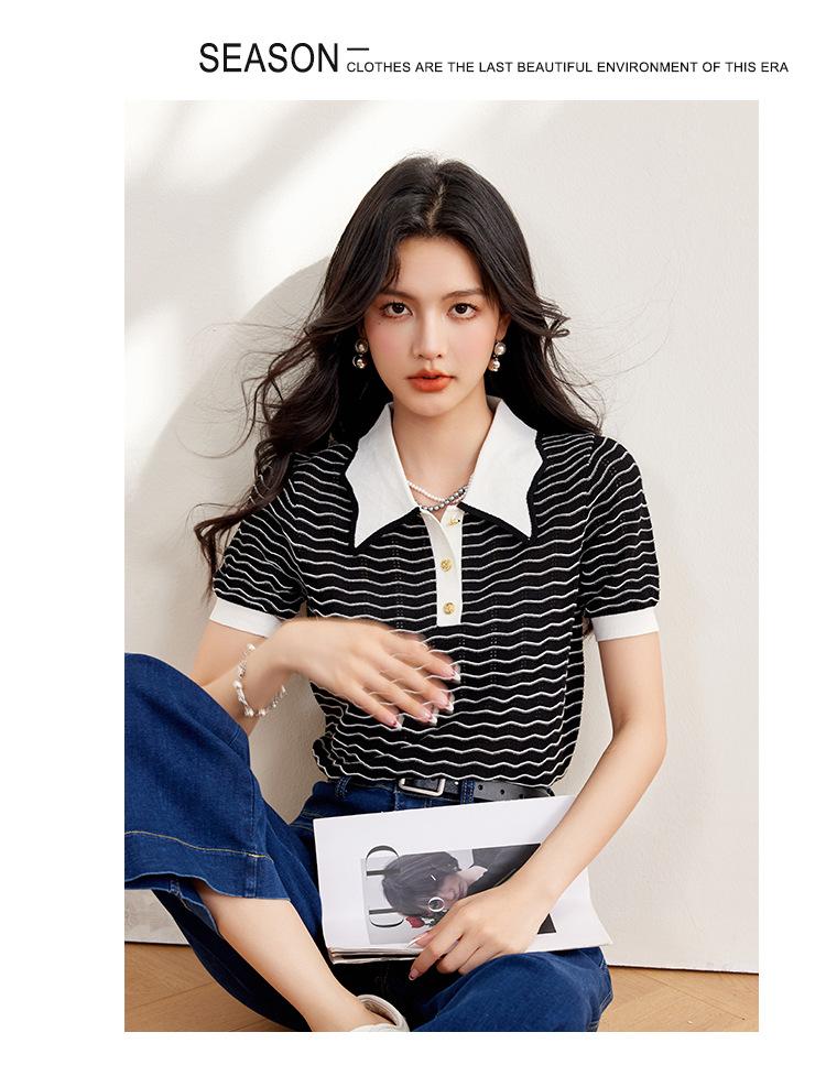 Verano Dulce y Adelgazante Nuevo Estilo Suéter Rayado con Solapa Empalmada Femenino Slim Top de Manga Corta Ropa de Moda para Mujer