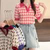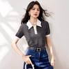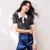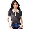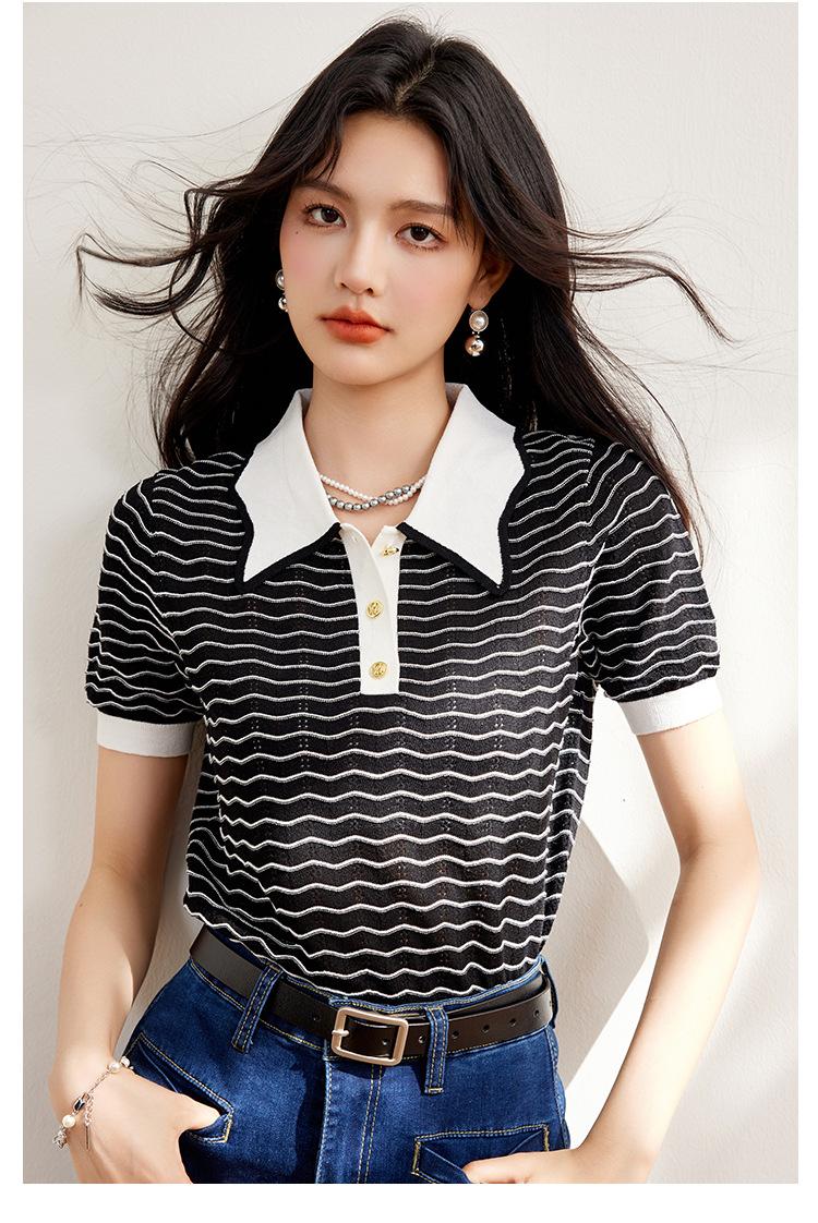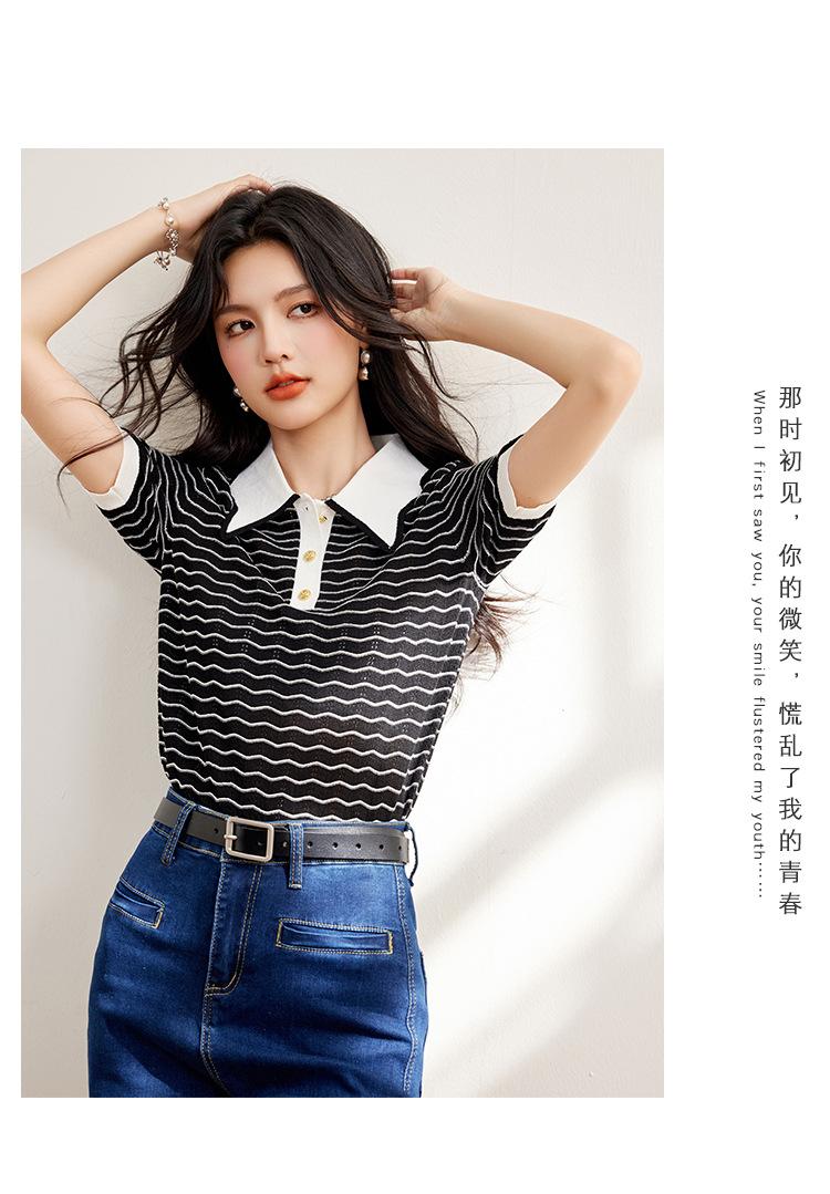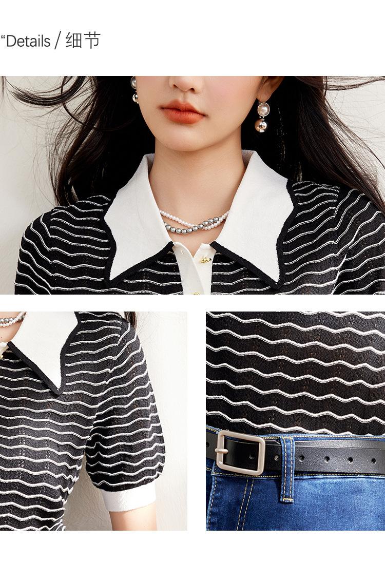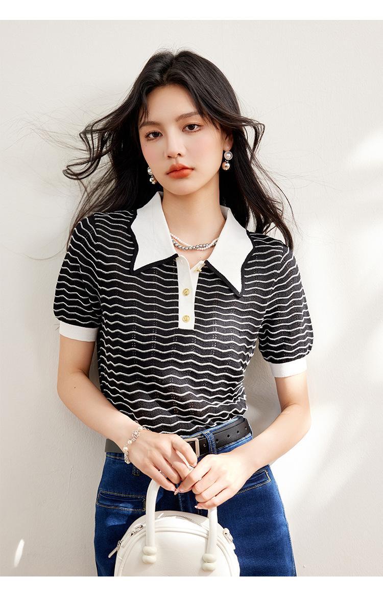 Verano Dulce y Adelgazante Nuevo Estilo Suéter Rayado con Solapa Empalmada Femenino Slim Top de Manga Corta Ropa de Moda para Mujer