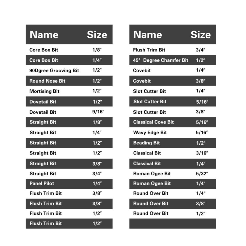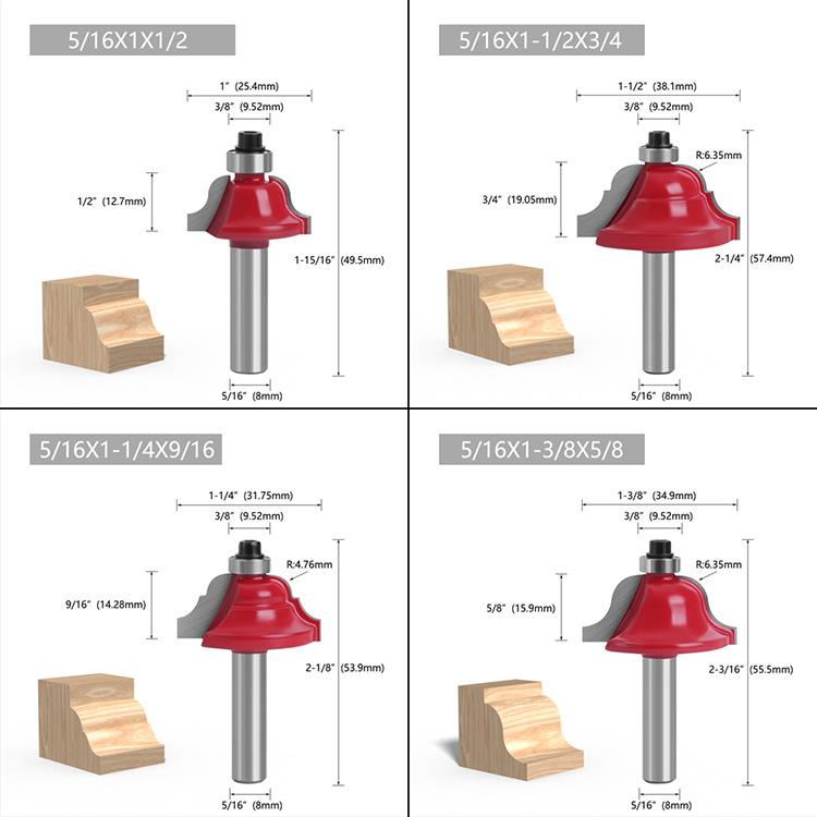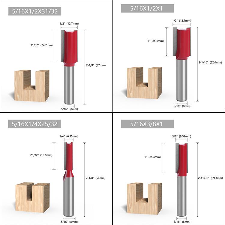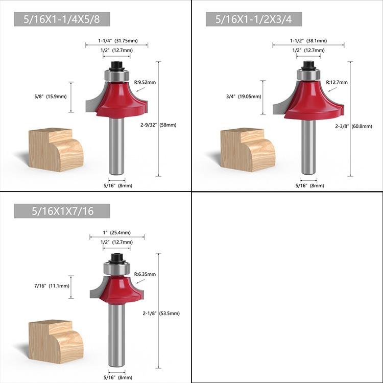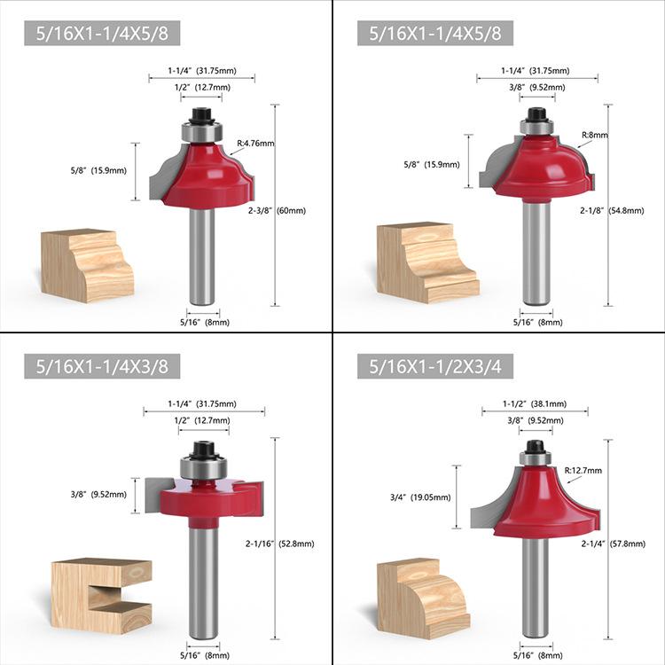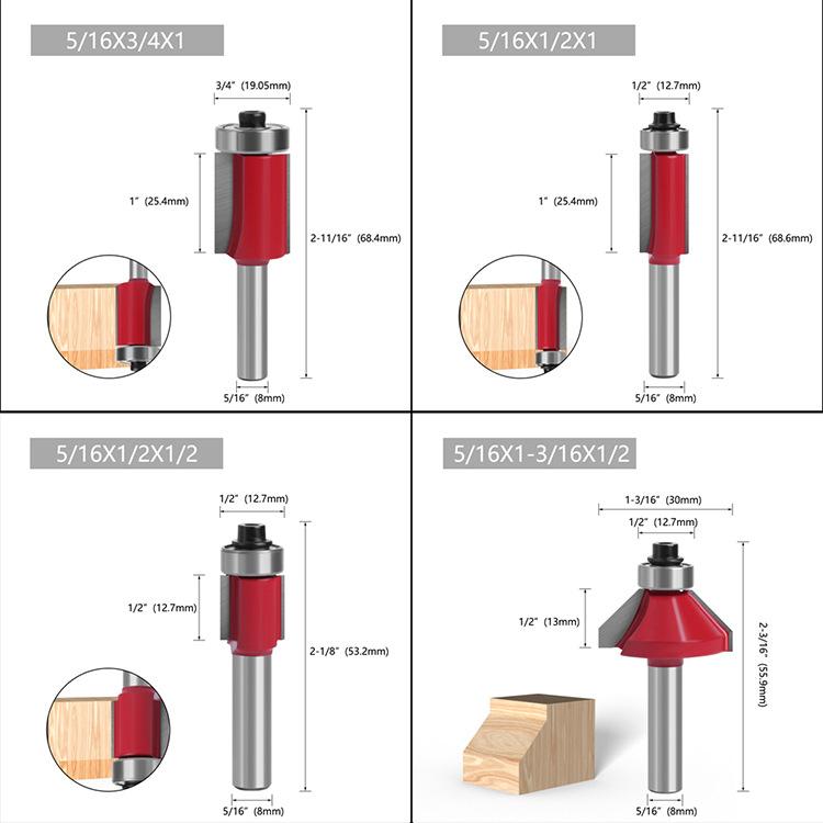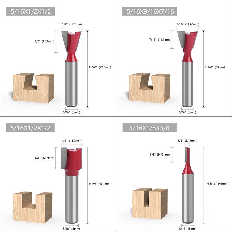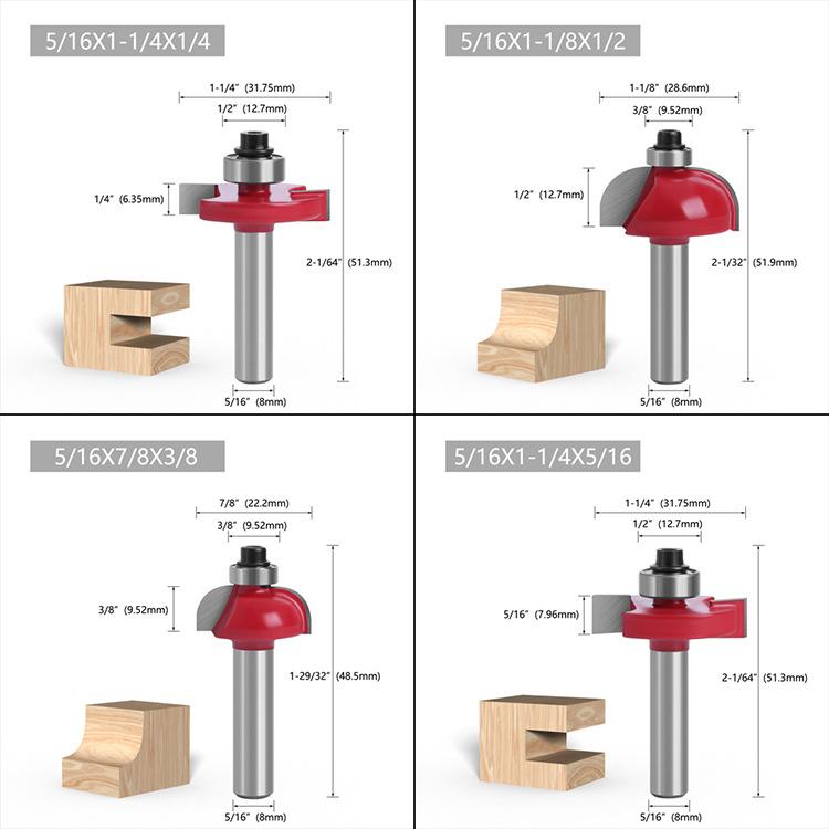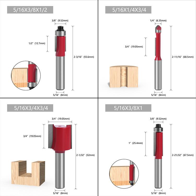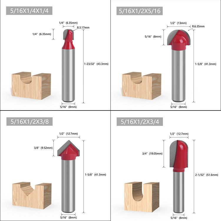 Los mangos de las fresas para carpintería son: 3 mm, 6 mm, 1/4" (6,35 mm), 8 mm, 12 mm, 1/2" (12,7 mm)