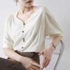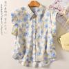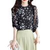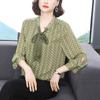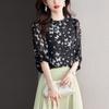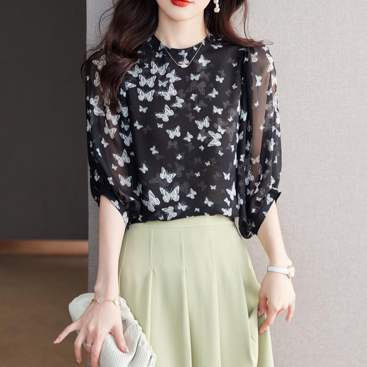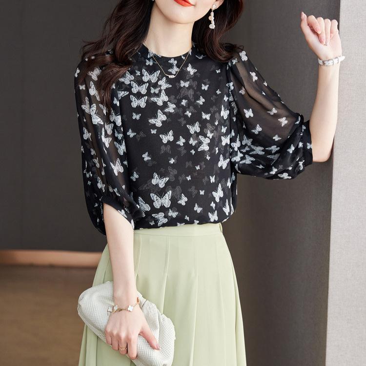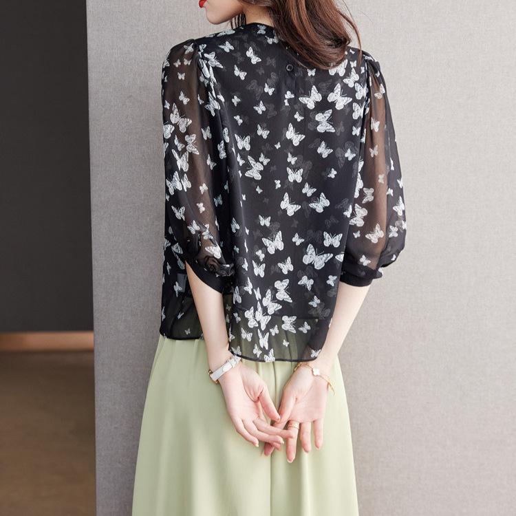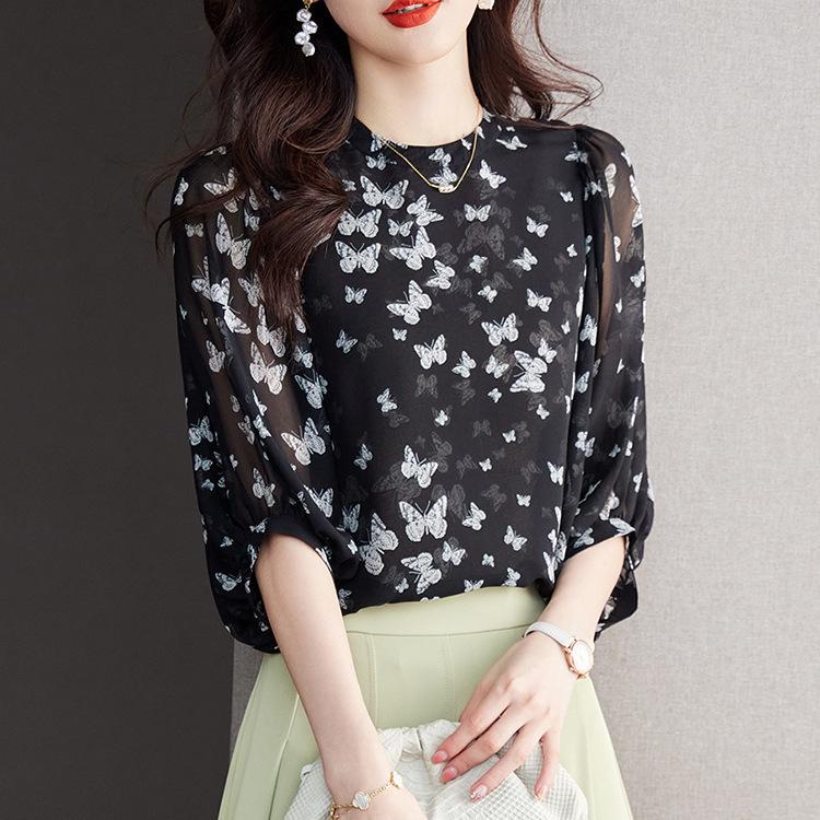 Camisa Pequeña de Chifón Estampado para Mujer Manga Siete Puntos Verano Nueva Llegada Estilo Lujo Ligero Reductor de Edad Chic Hermosa Top Cubre Vientre