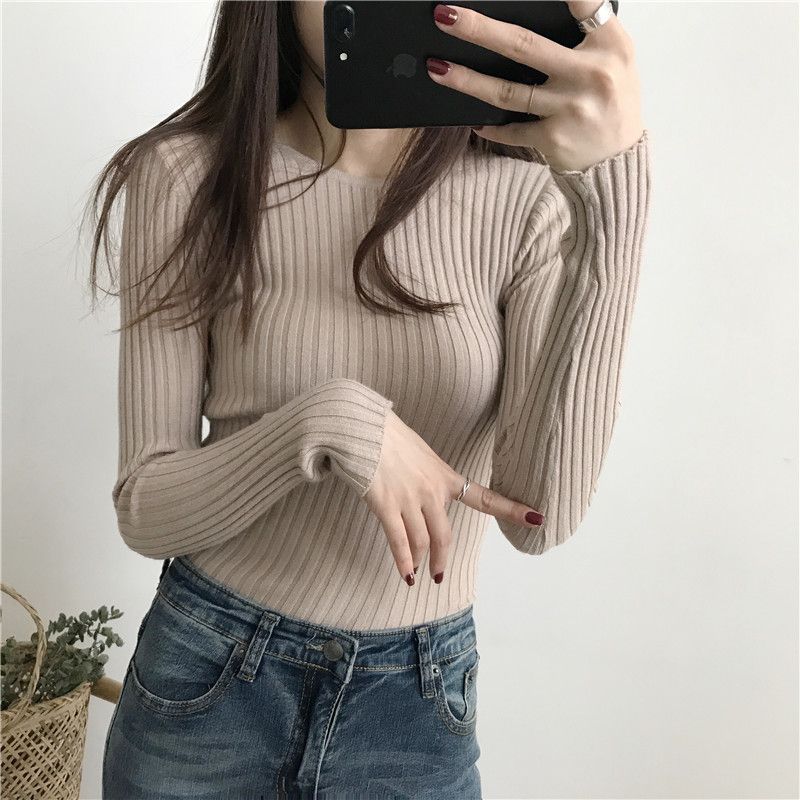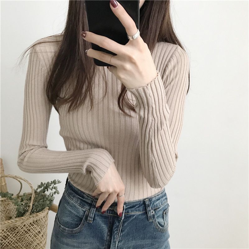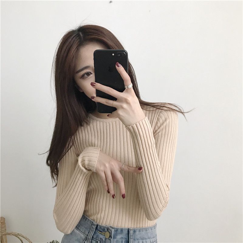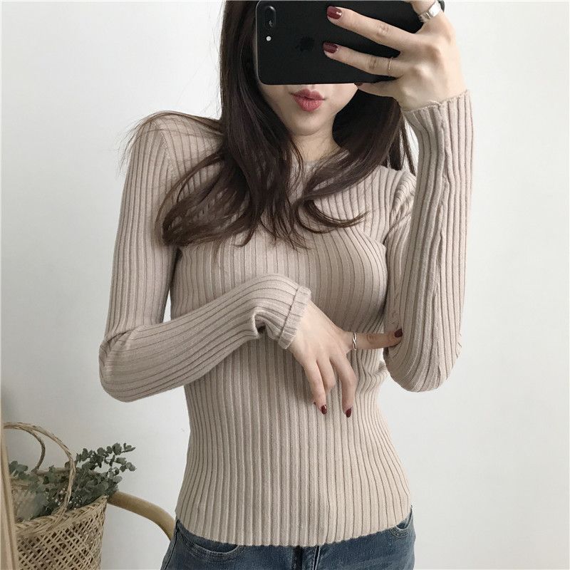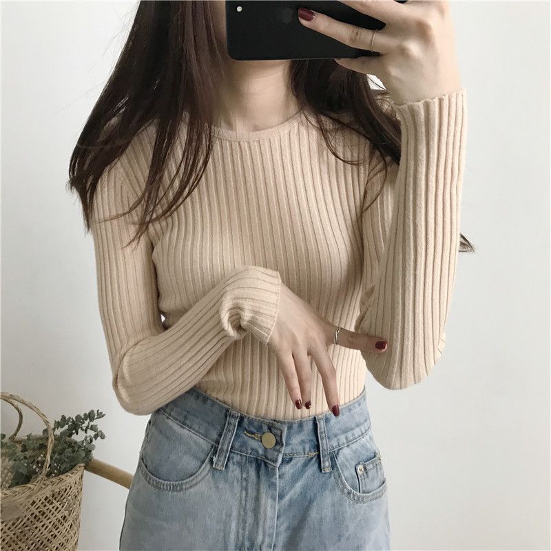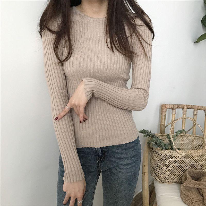 0029#Nuevo Top de Punto Base de Manga Larga Adelgazante Estilo Coreano Slim Fit para Mujer Ropa Interior Ropa Exterior Versátil