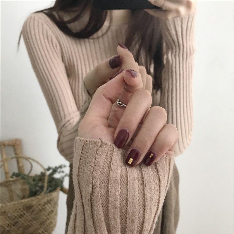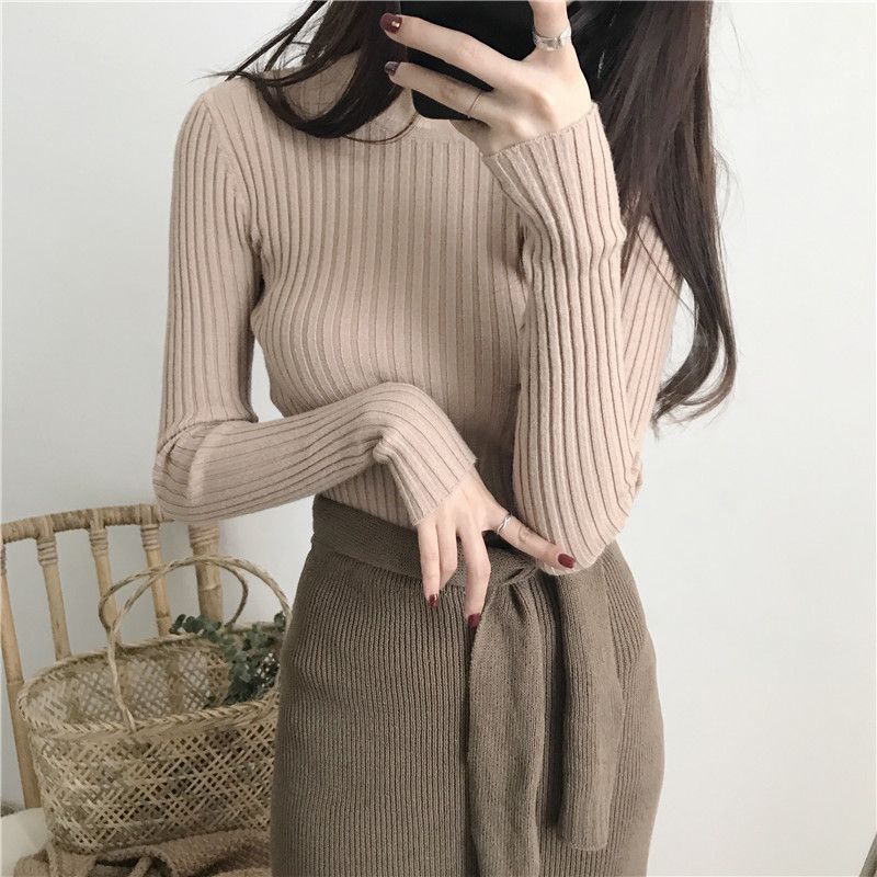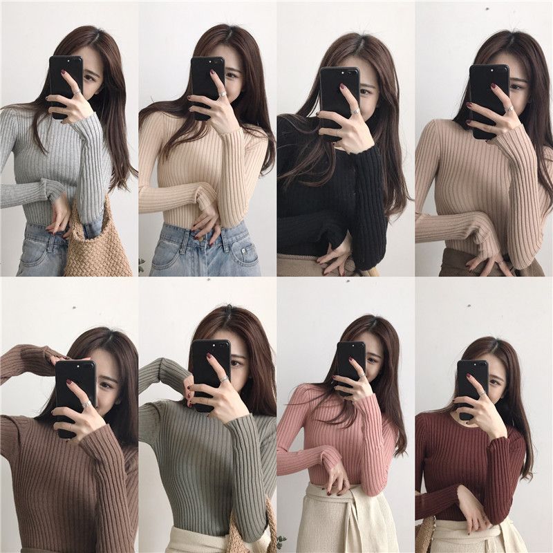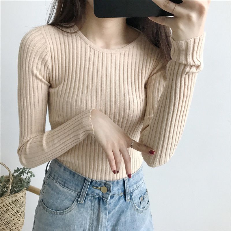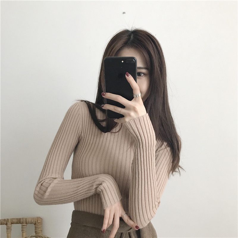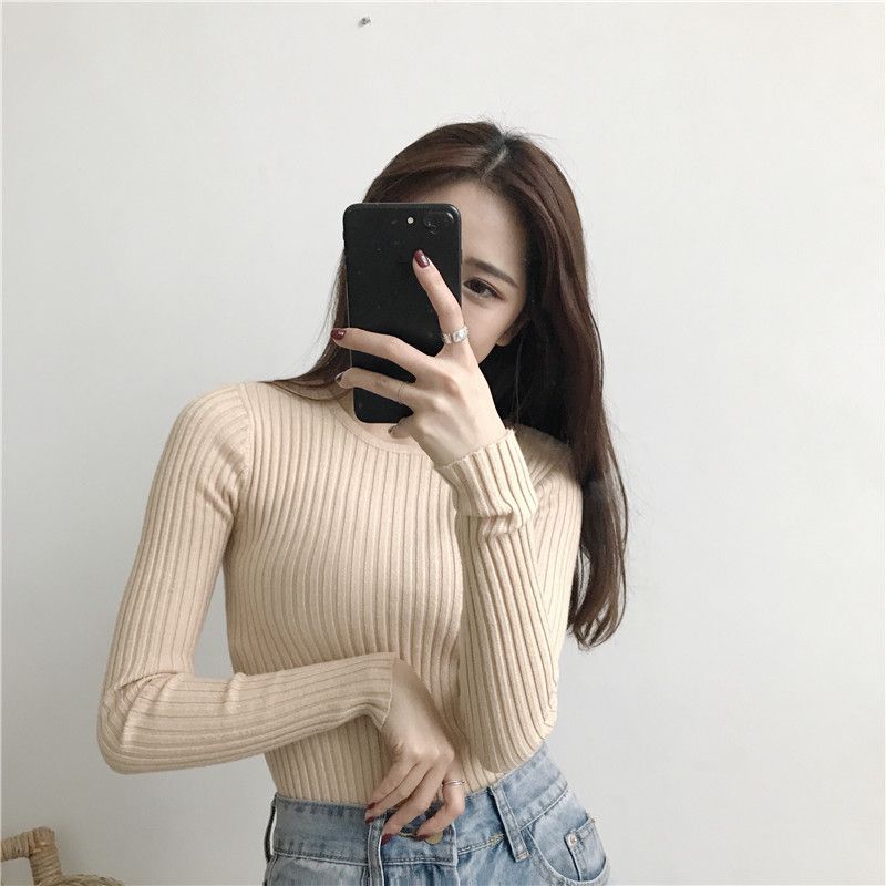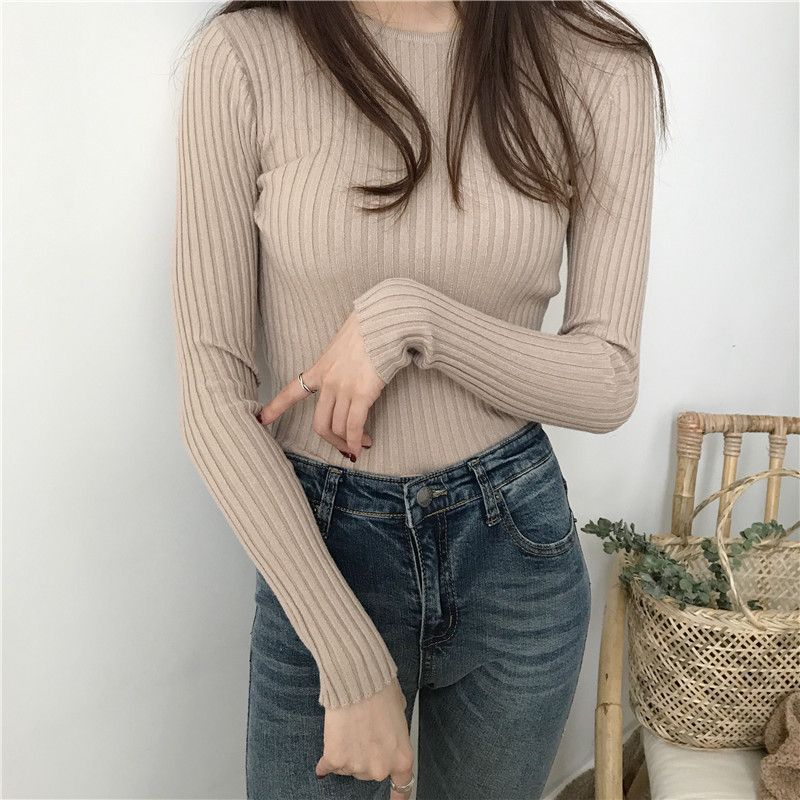 0029#Nuevo Top de Punto Base de Manga Larga Adelgazante Estilo Coreano Slim Fit para Mujer Ropa Interior Ropa Exterior Versátil