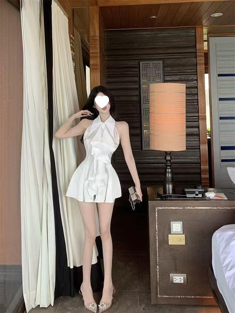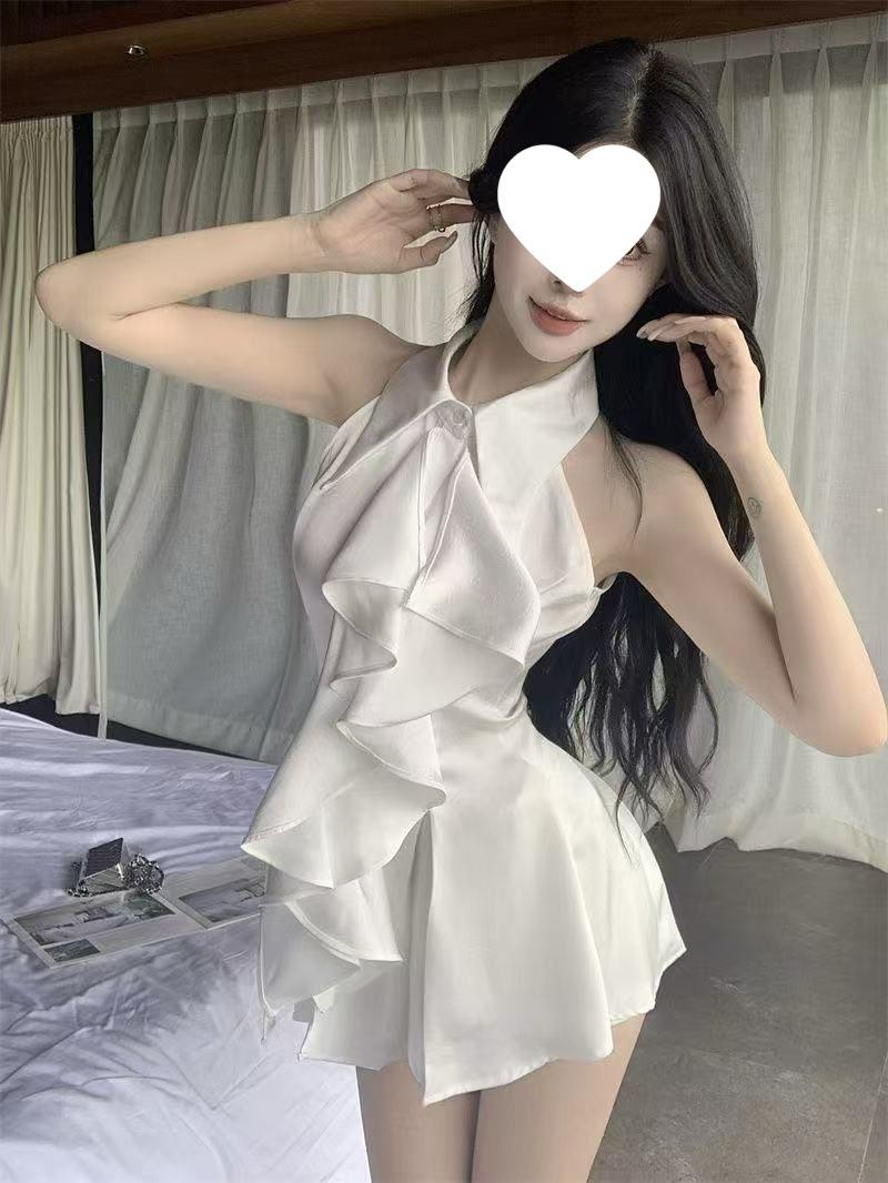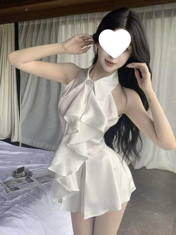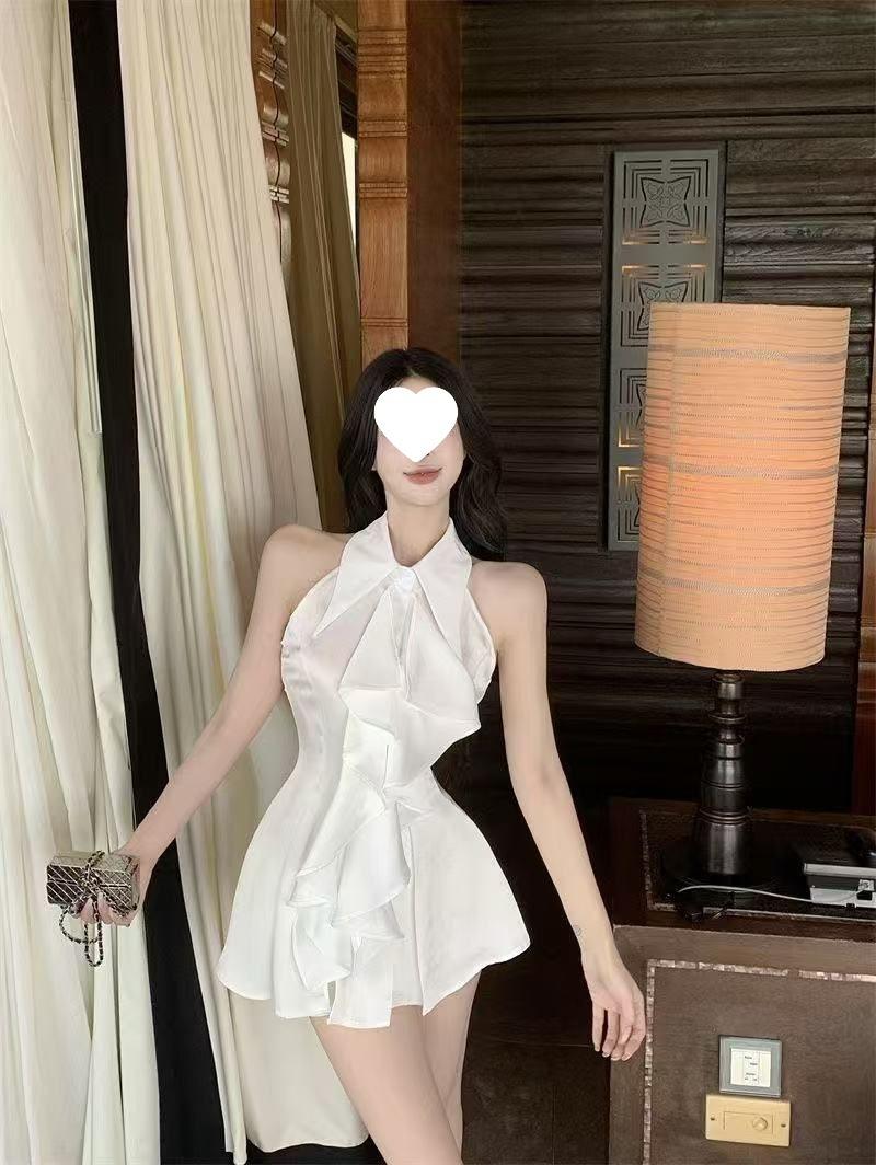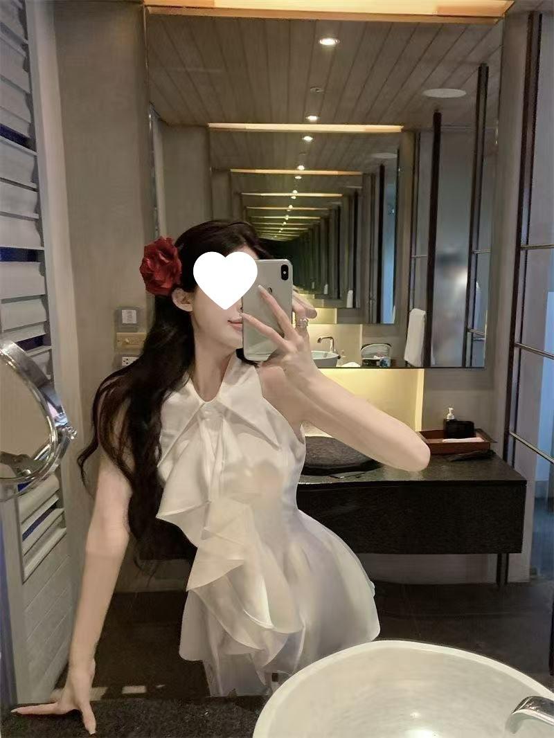 Blusa Top de Estilo Suave Dulce con Volantes Sin Mangas para Mujer Verano Temperamento Francés Largo Medio Ajustado a la Cintura Adelgazante Vestido Camisero