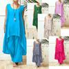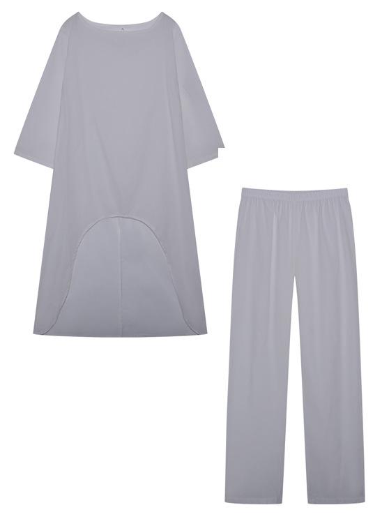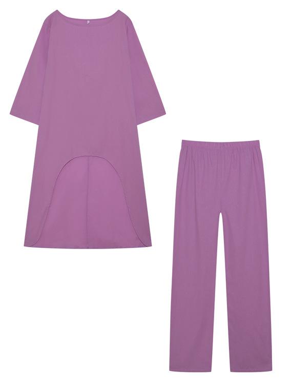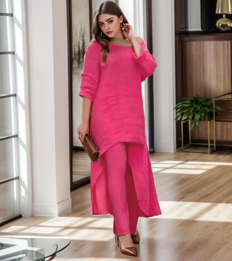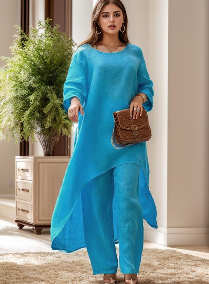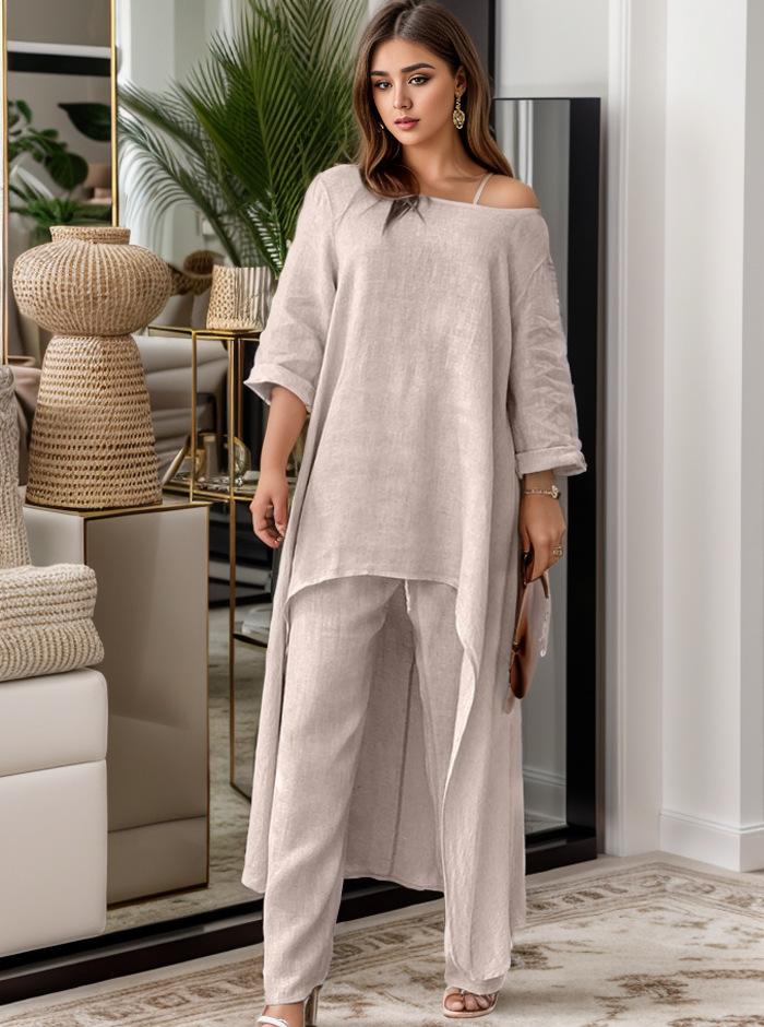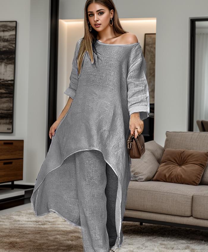 Traje casual de moda europeo y americano para mujer 2023 de algodón y lino talla grande manga larga irregular de dos piezas pantalones de pierna ancha 9848