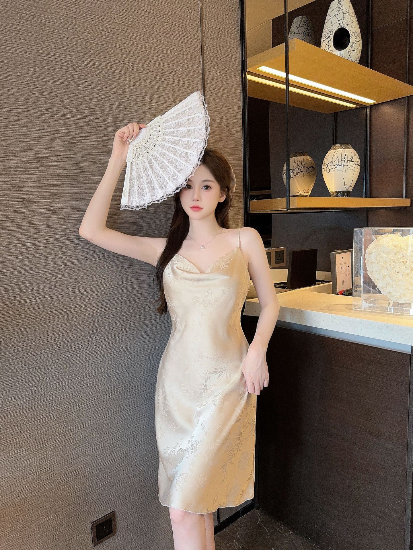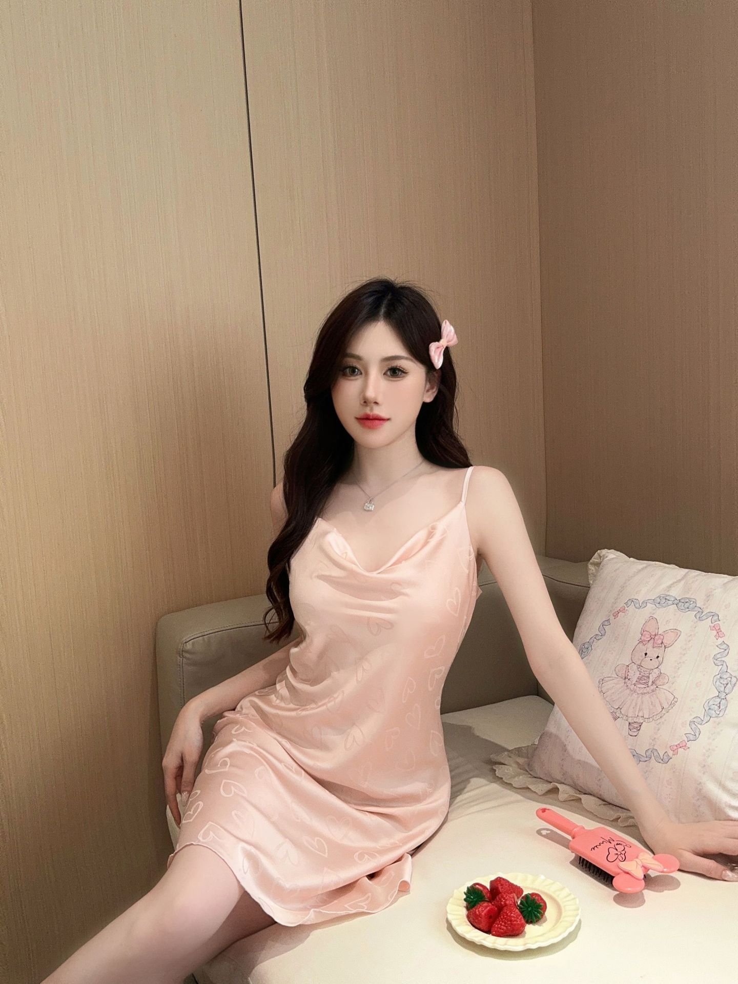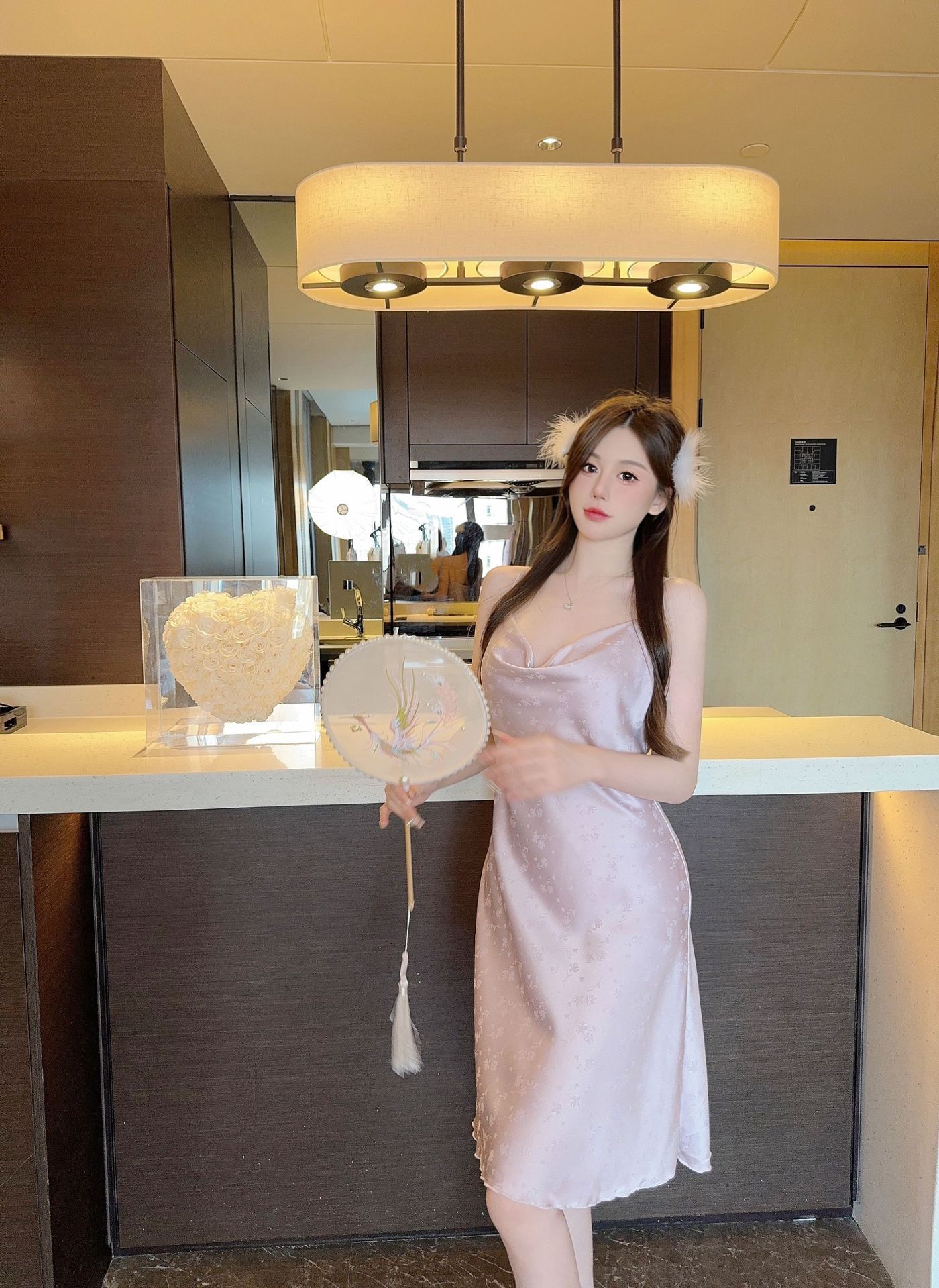 Pijama Sexy, Camisón Femenino de Verano con Tirantes, Pijama Jacquard de Seda Hielo y Nieve, Falda de Seda de Alta Gama, Sensación Fresca