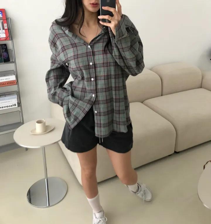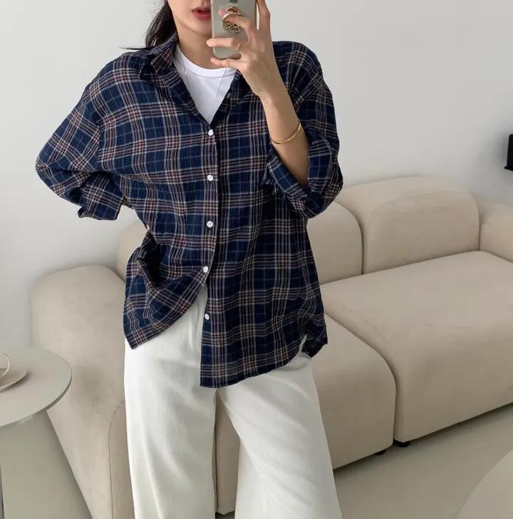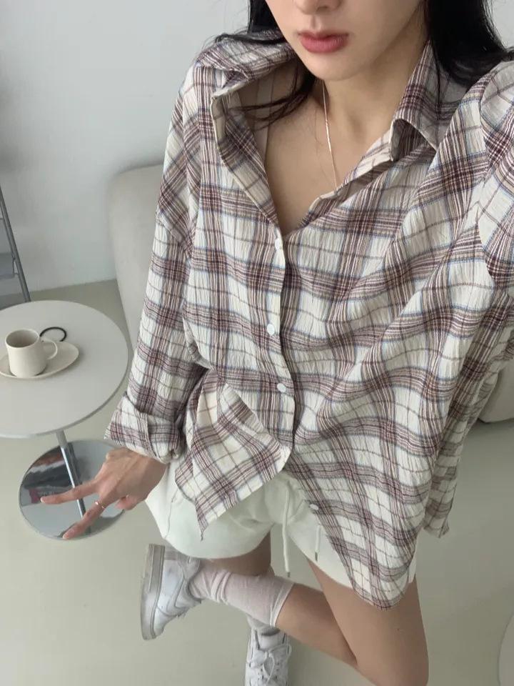 Camisa Holgada Versátil a Cuadros Chic Estilo Coreano 2025 Otoño Nuevo Retro Perfil Grande Top de Manga Larga