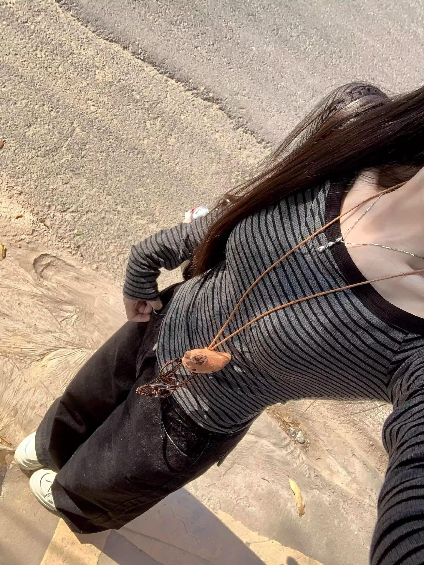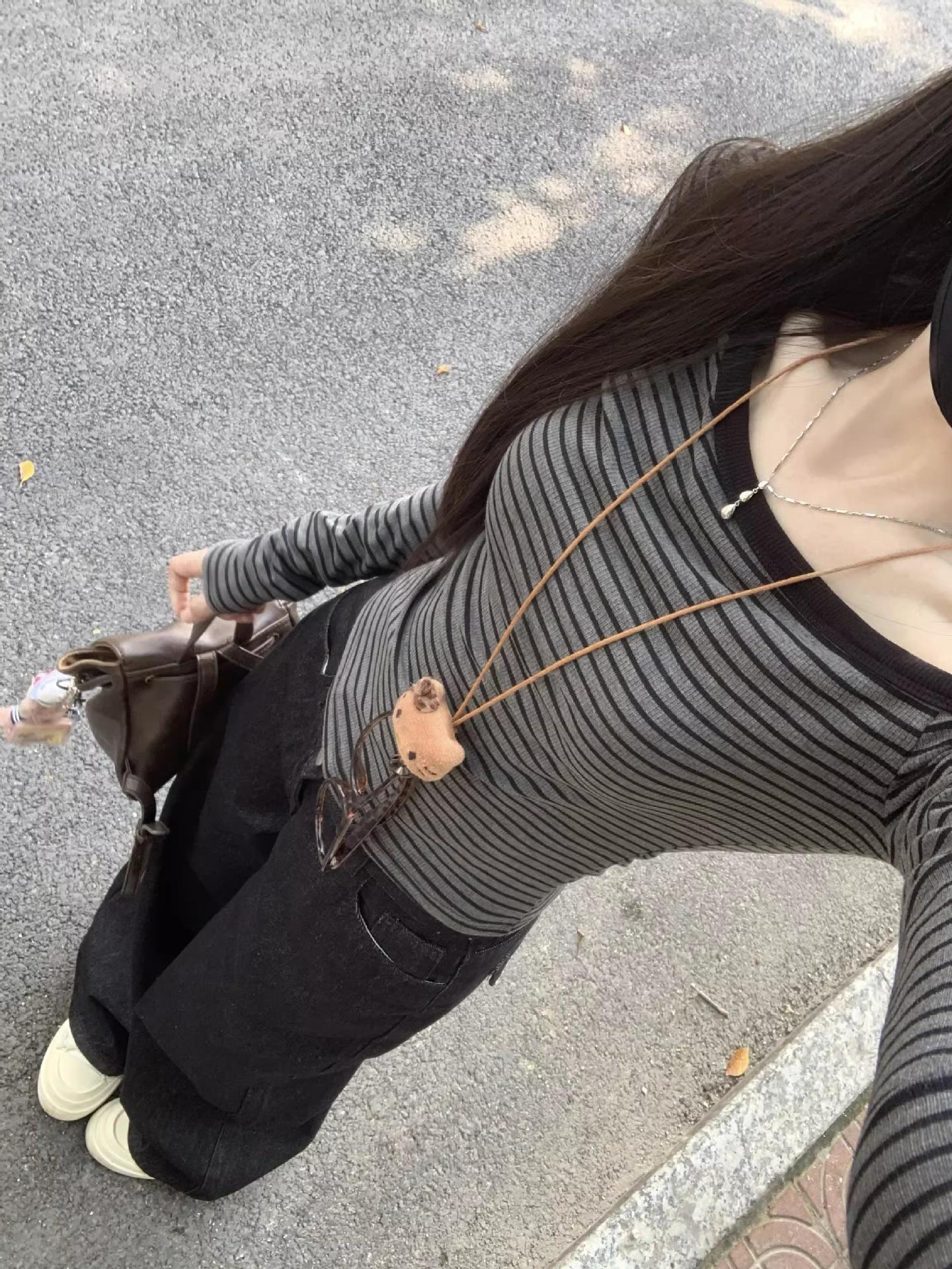 Top de Hombro para Mujer 2025 para Primavera Nuevo Principios de Primavera Estilo Coreano Chic Chic Camiseta Base Tejida a Rayas