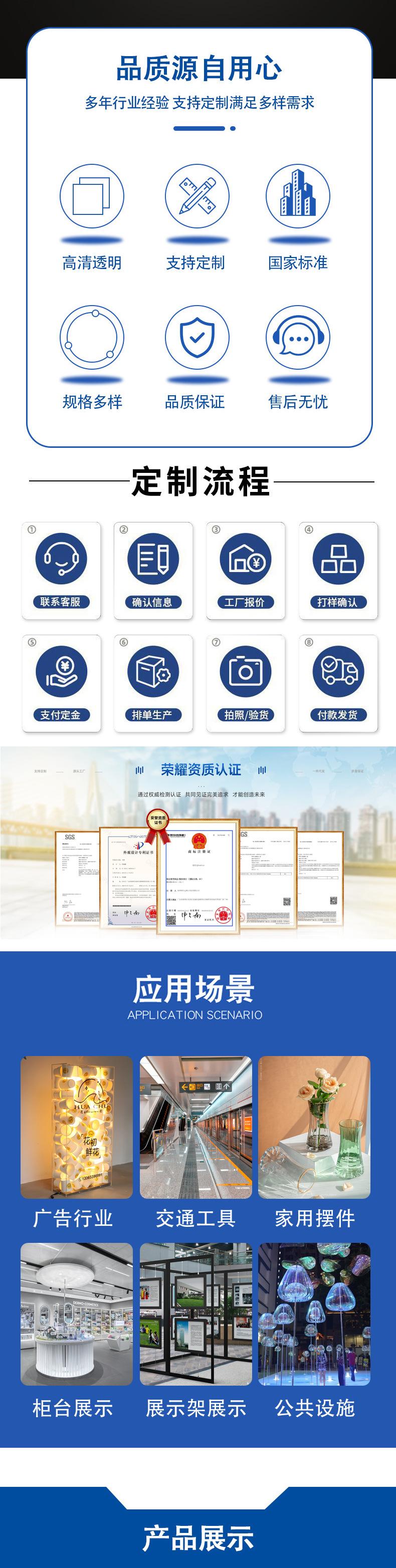 Áreas de aplicación | El acrílico se puede utilizar en muchos lugares como la industria publicitaria, estantes de exhibición para muebles del hogar, instalaciones públicas, etc. |