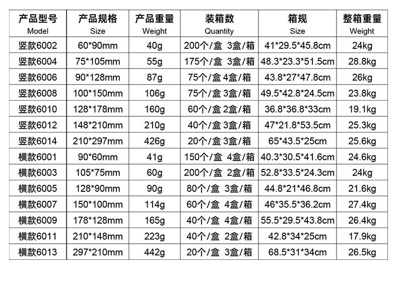 9*6 horizontal 6001, 6*9 vertical 6002, 10.5*7.5 horizontal 6003, 7.5*10.5 vertical 6004, 12.8*9 horizontal 60...