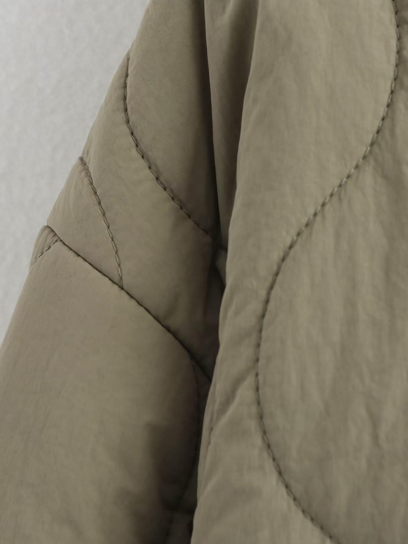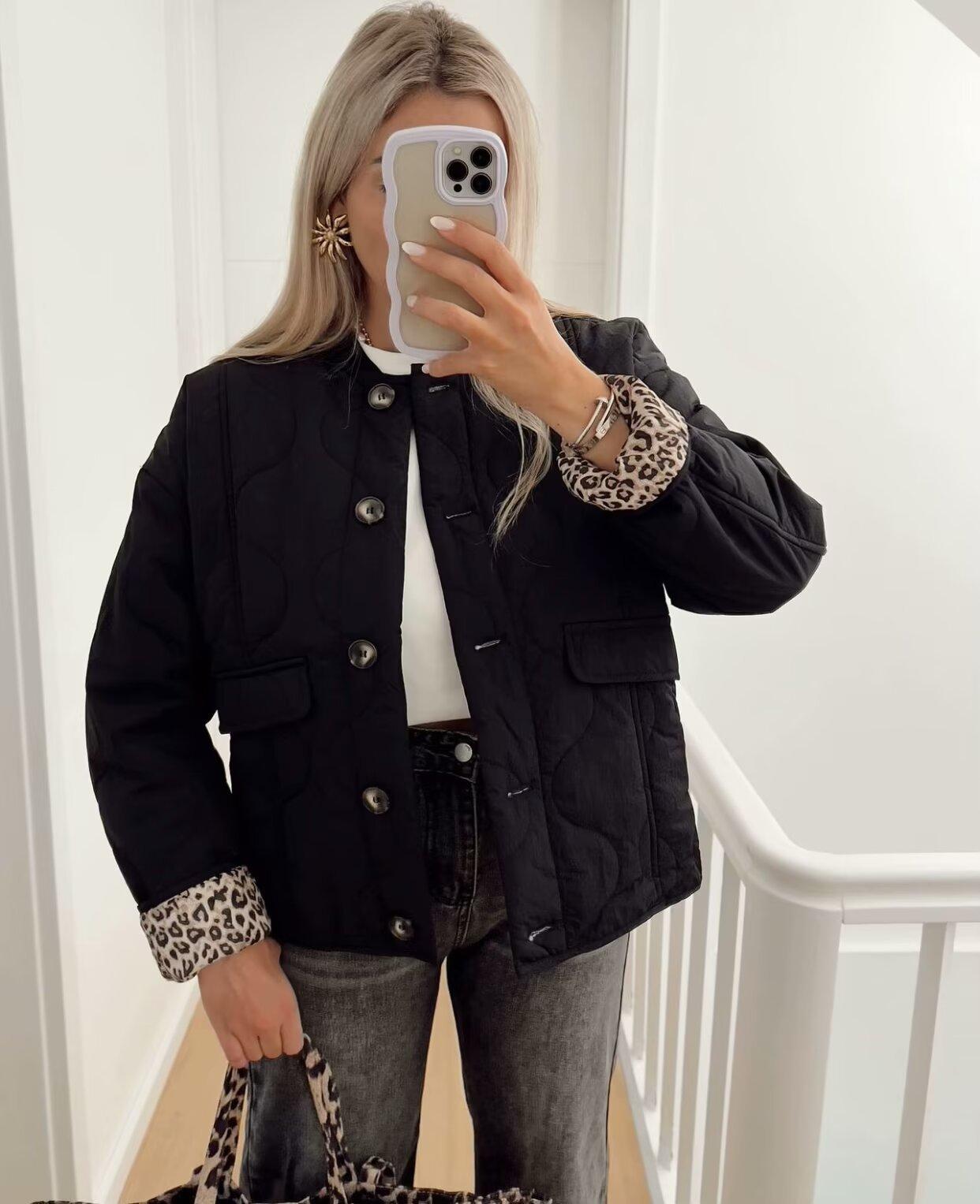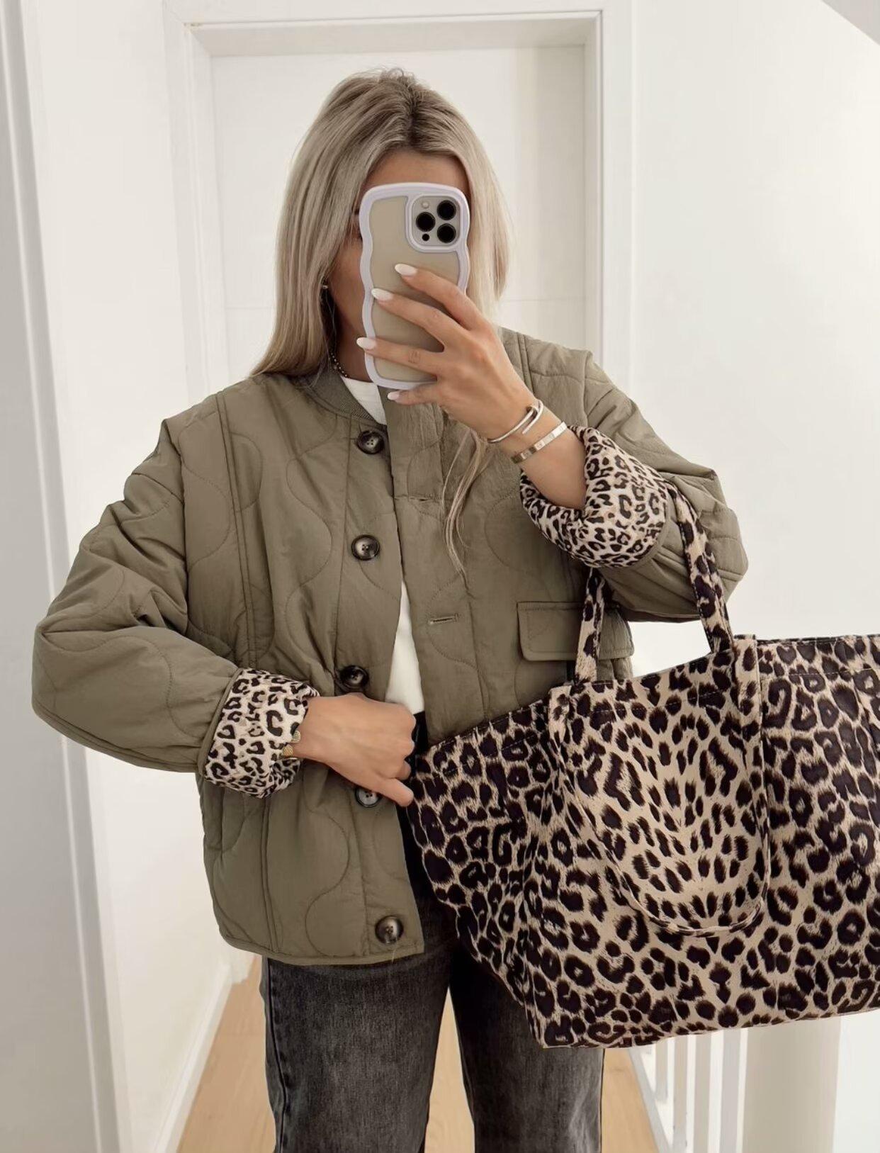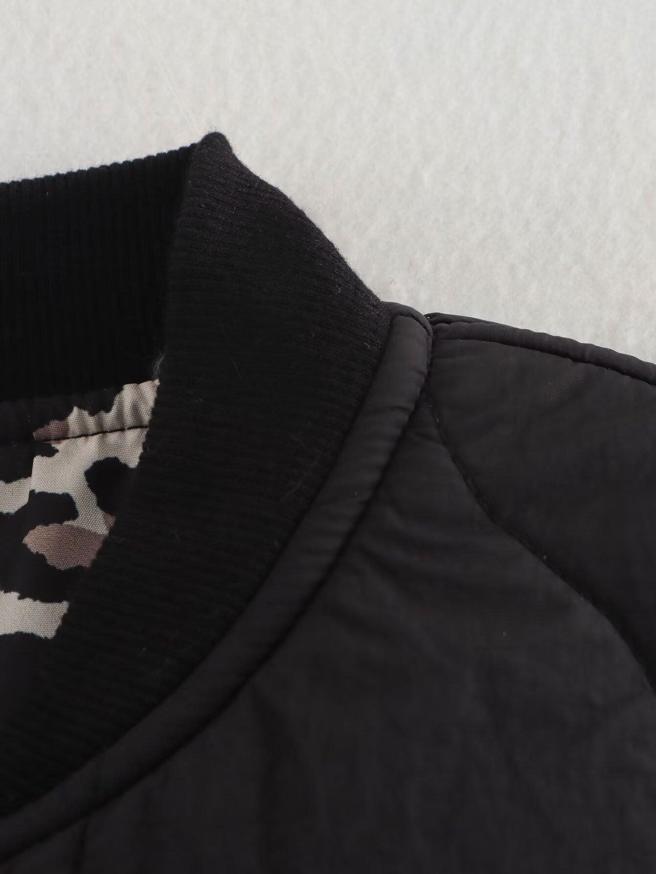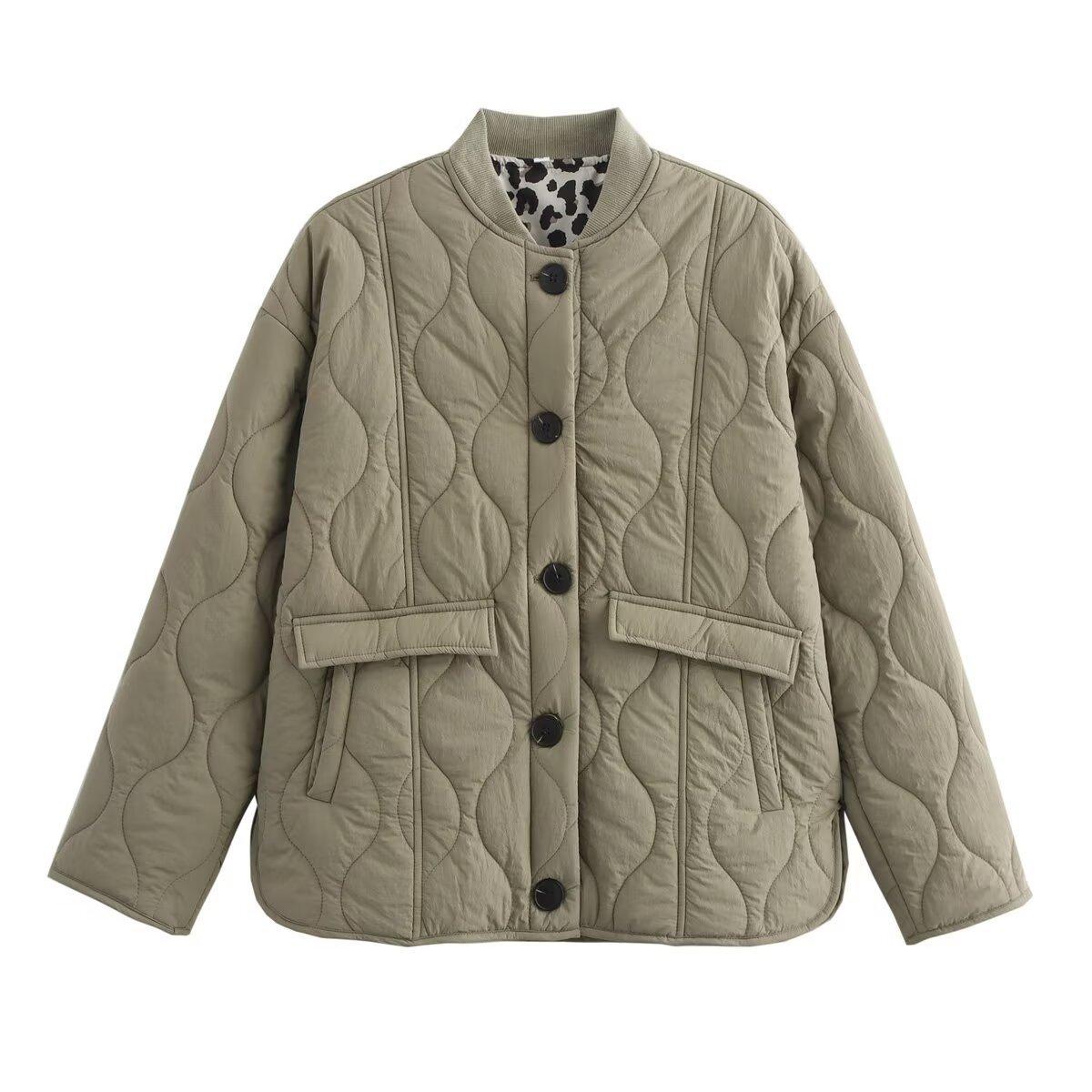 Moda Otoño/Invierno 2025 Nueva Chaqueta de Algodón con Estampado de Leopardo Tricolor Forrada con Cuello Acanalado Ropa de Mujer Transfronteriza Amazon Verde Oliva