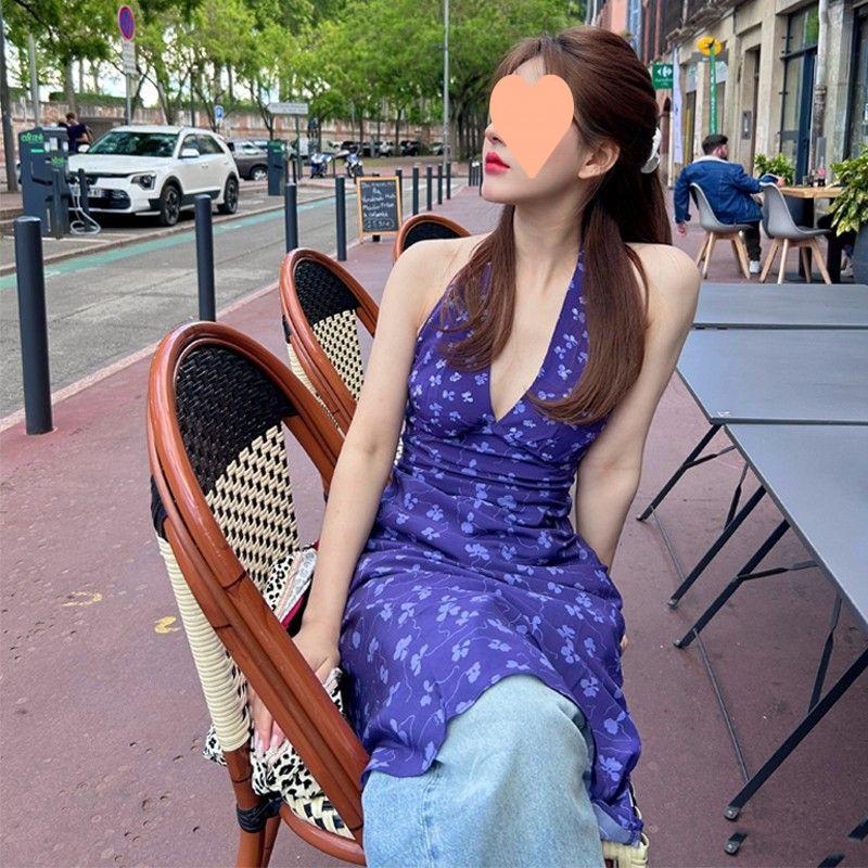 Vestido Halter con Cuello en V Azul con Estampado Floral para Mujer Verano Estilo Francés Vacaciones en la Costa Falda con Tirantes en la Cintura