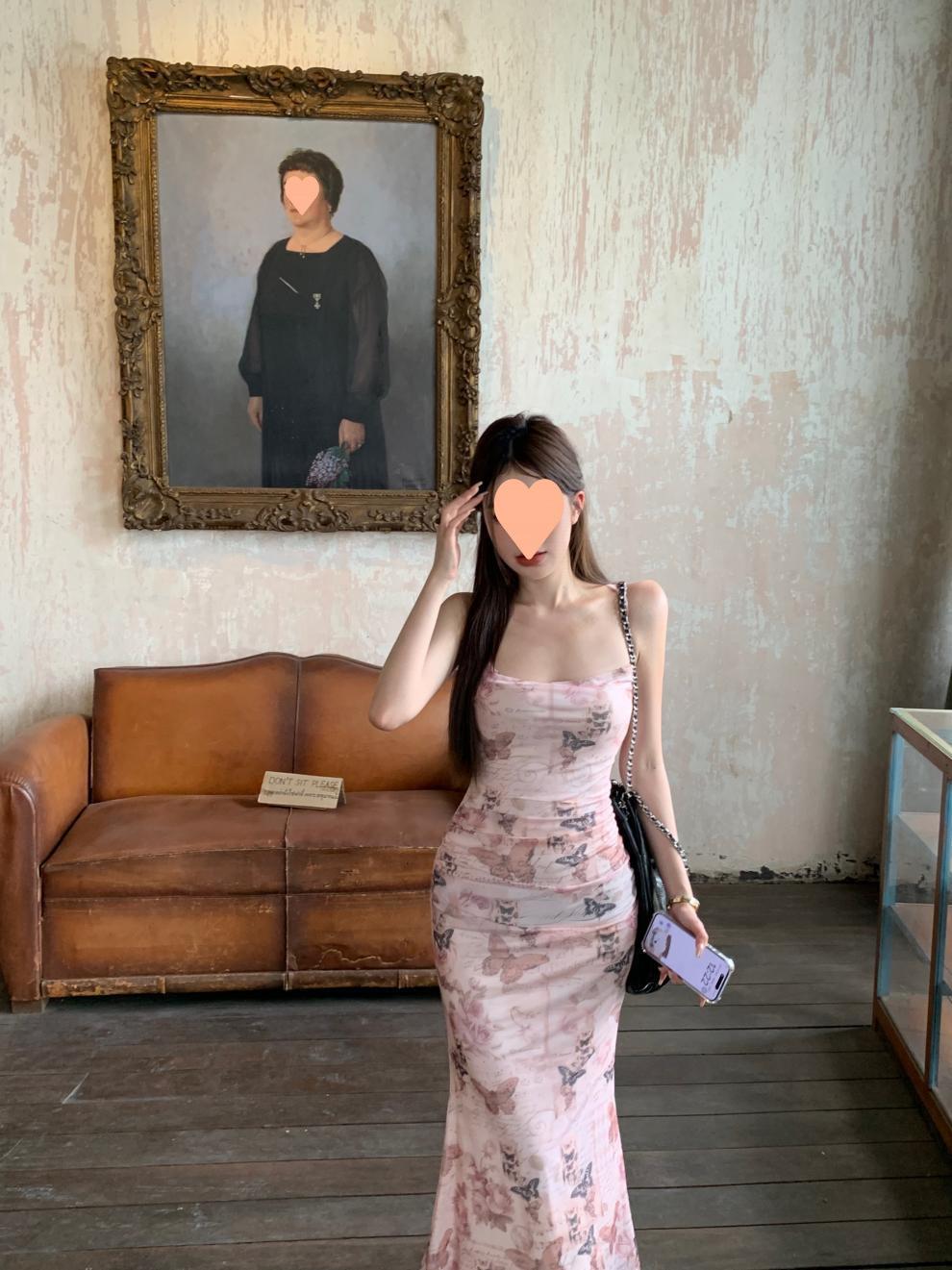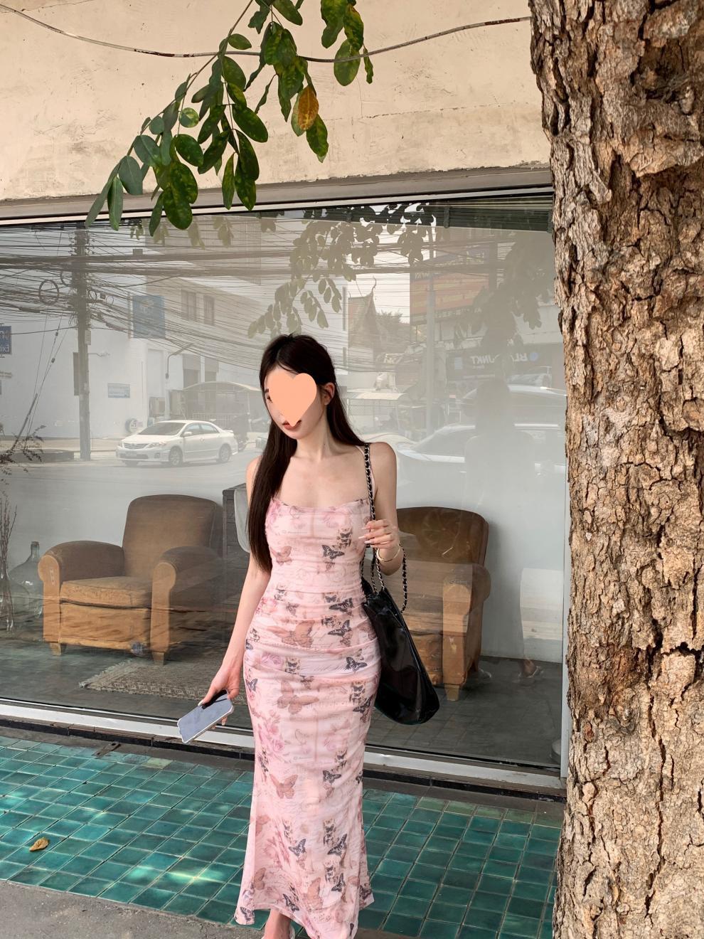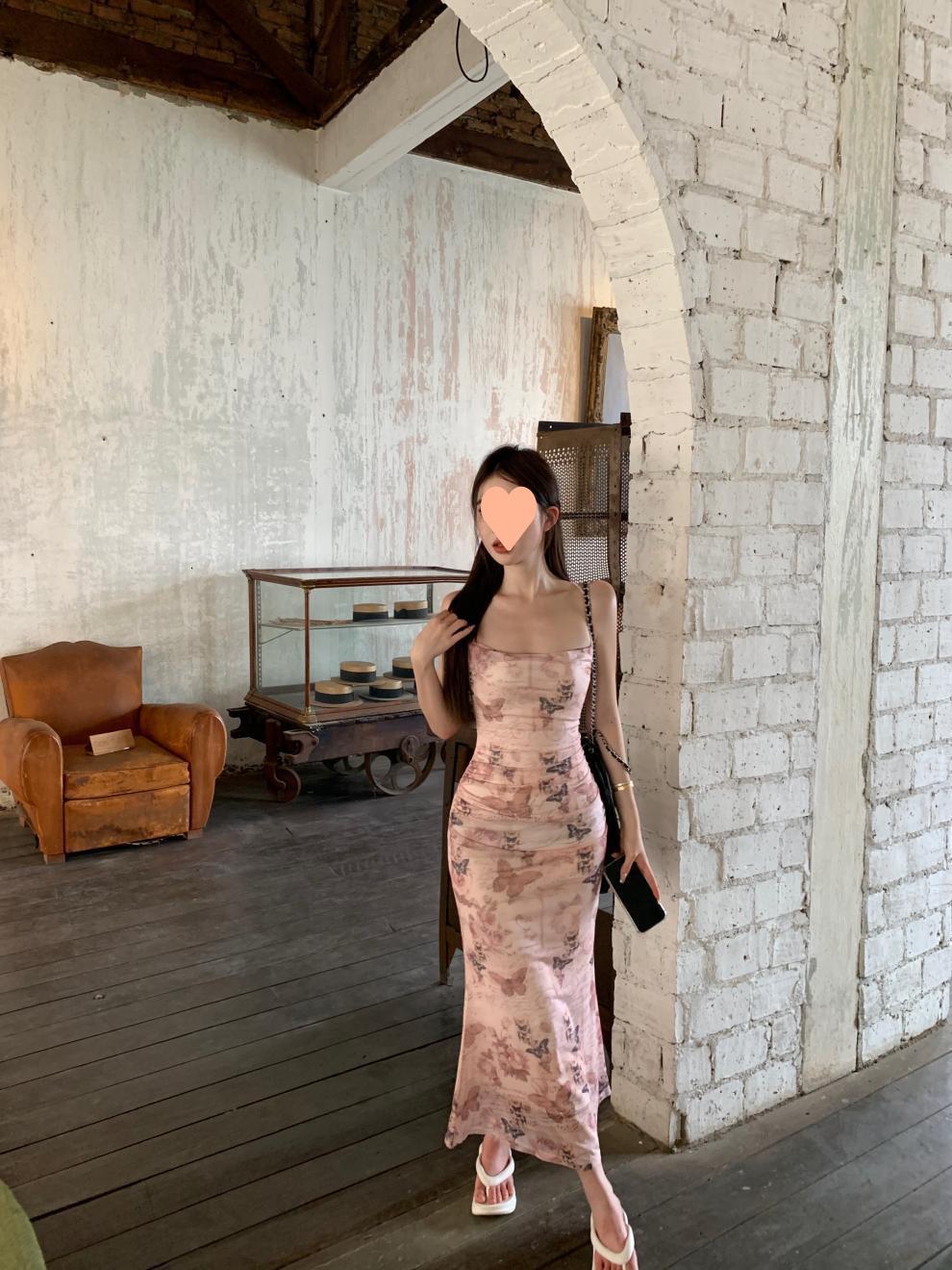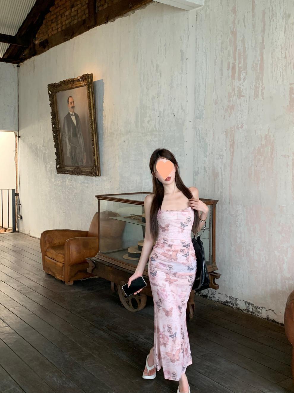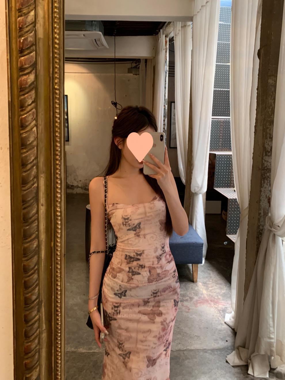 Vestido Sexy de Tirantes con Estampado de Mariposas para Mujer Verano Revelador de Cintura Tirante Trasero Falda de Cadera Lujuria Pura Falda Larga