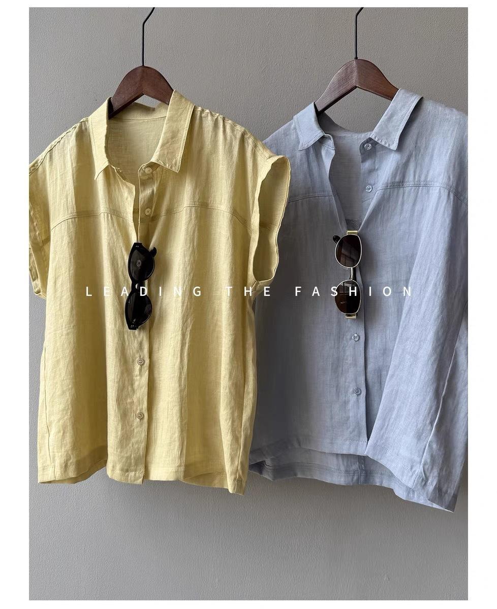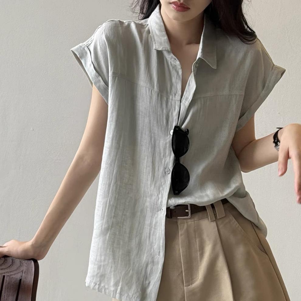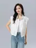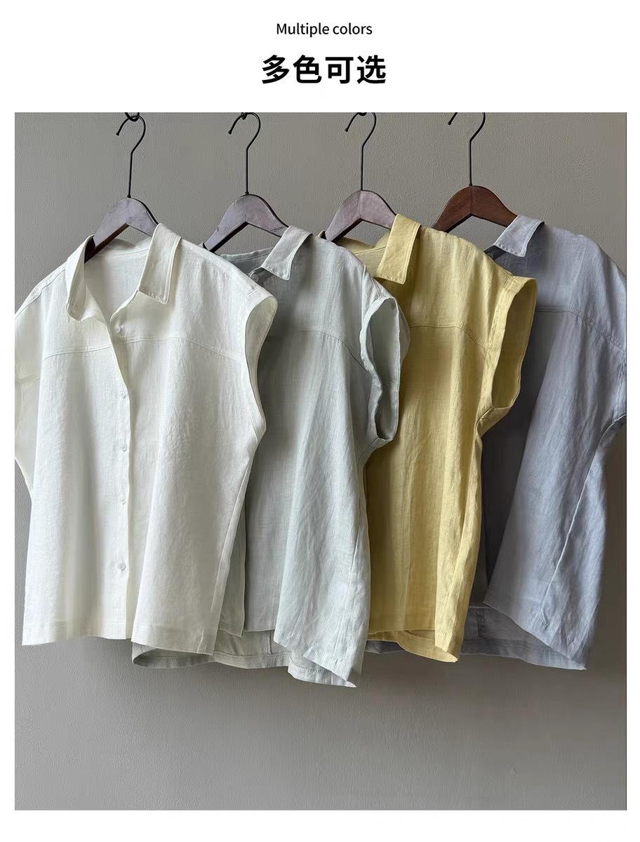 Camisa Azul de Lino de Manga Corta para Mujer Verano Ropa para Ir al Trabajo Blusa Moda Temperamento Manga Pequeña con Volante Sin Mangas Algodón Lino Top