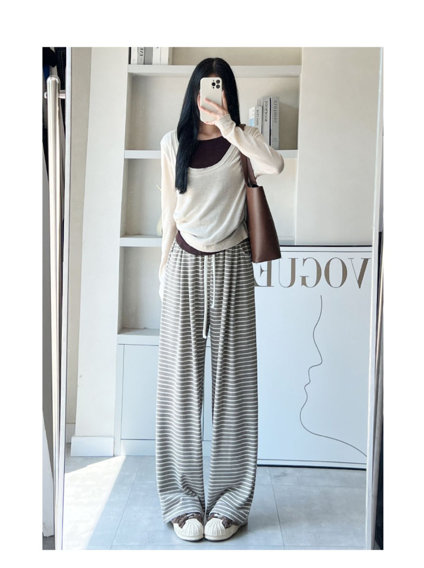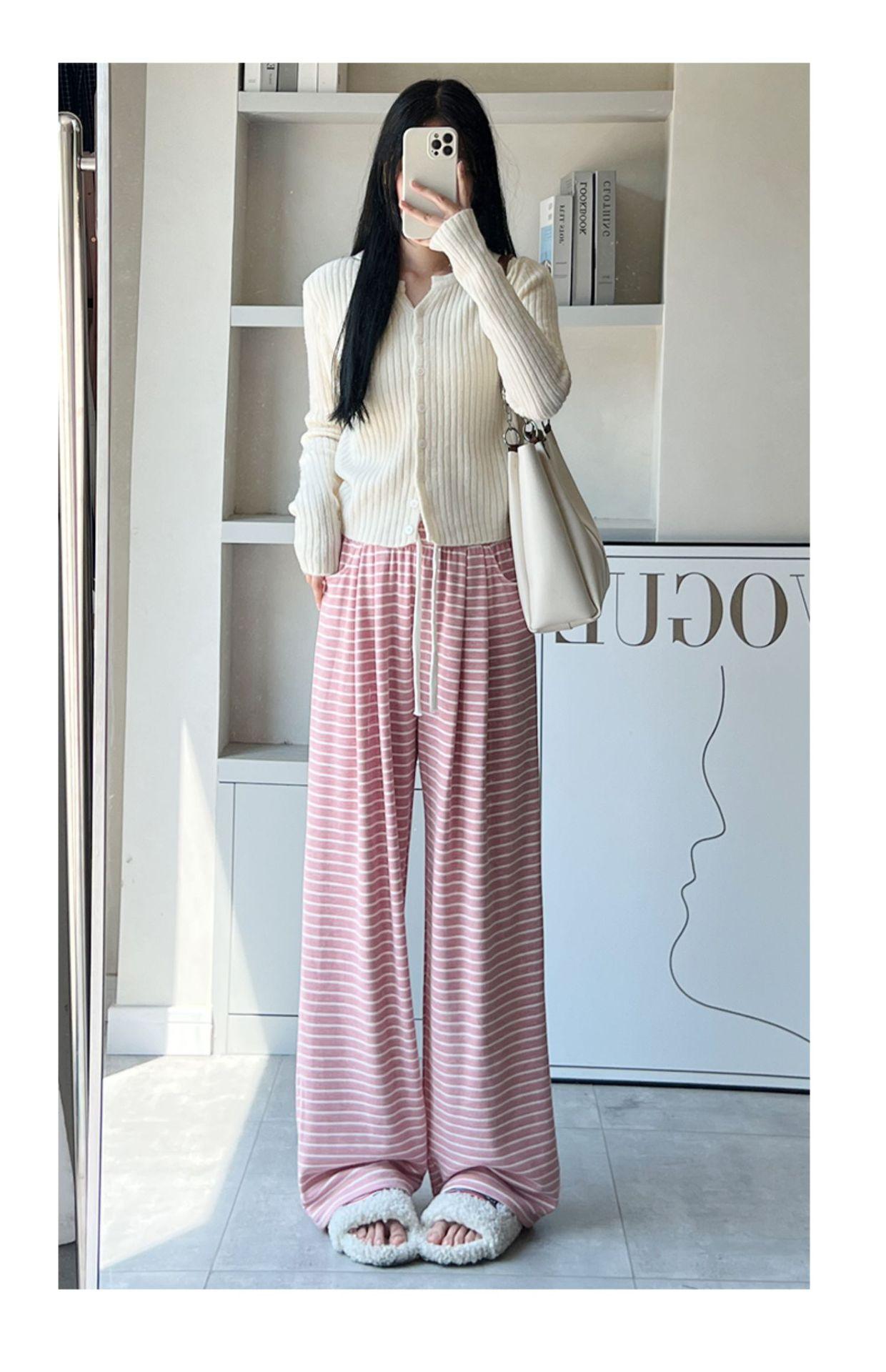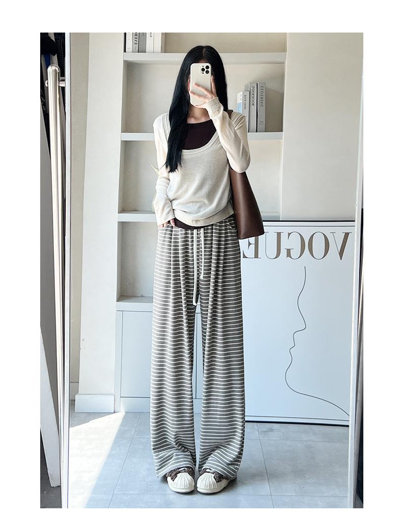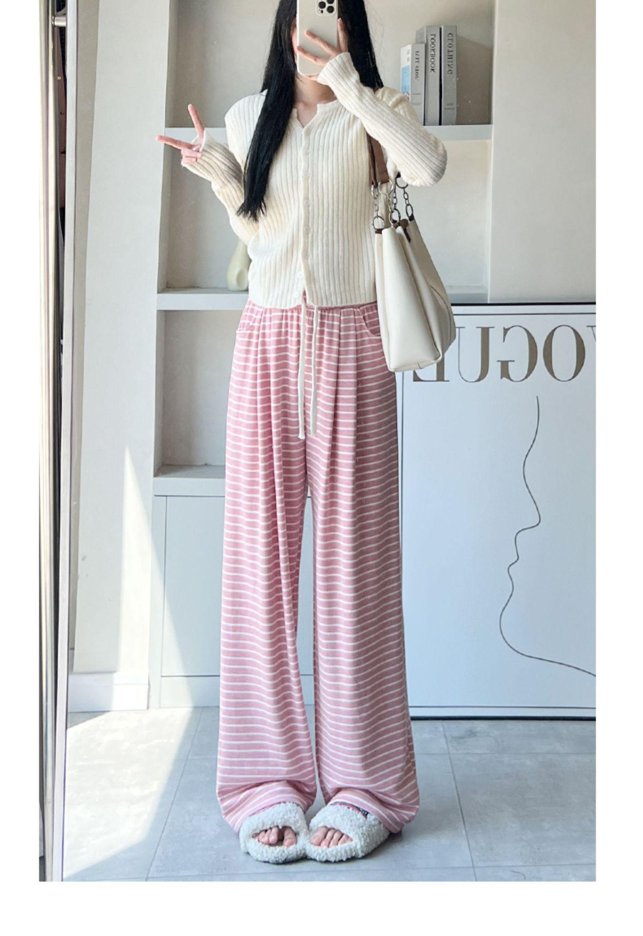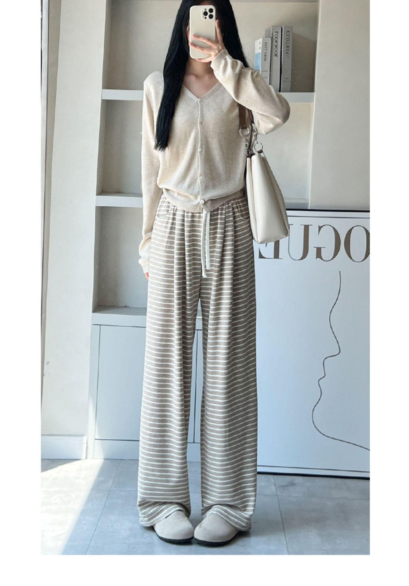 Pantalones de Caminar de Verano 2025 para Mujer de Pierna Ancha a Rayas Grises, Nuevos, de Cintura Alta, Pierna Recta, Casuales, Sueltos, Sensación Relajada y Perezosa