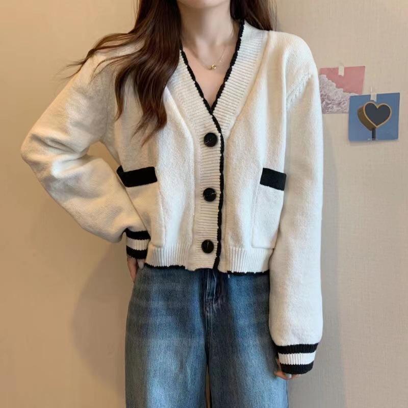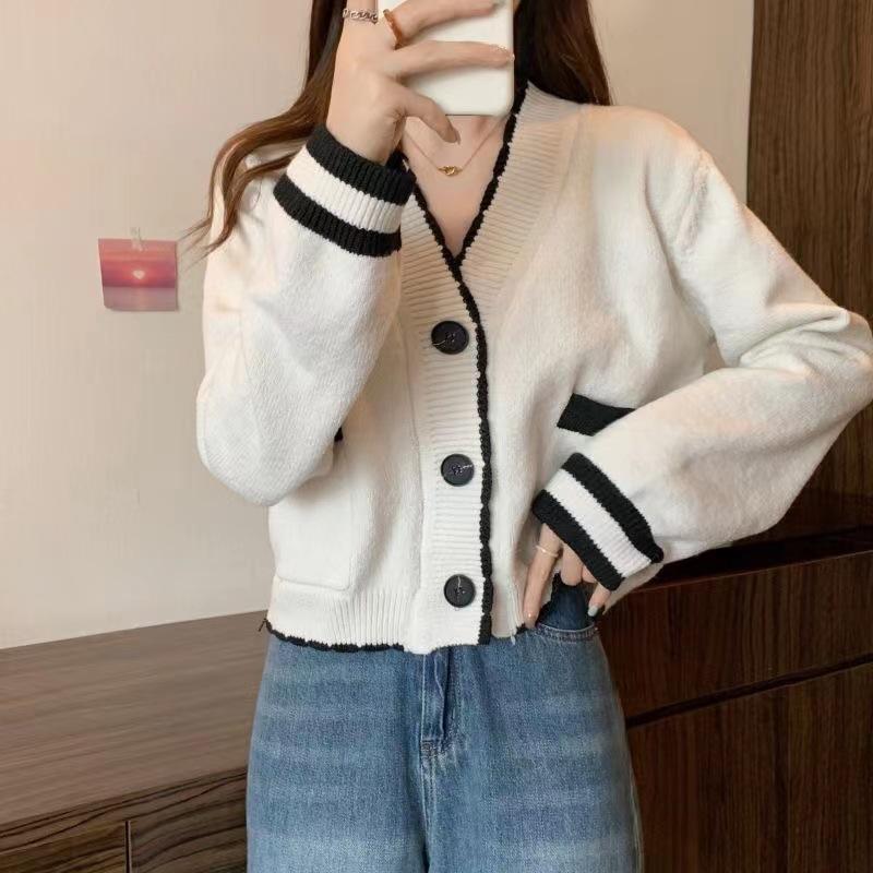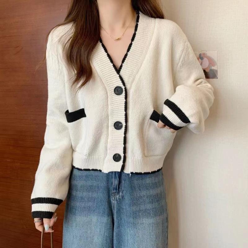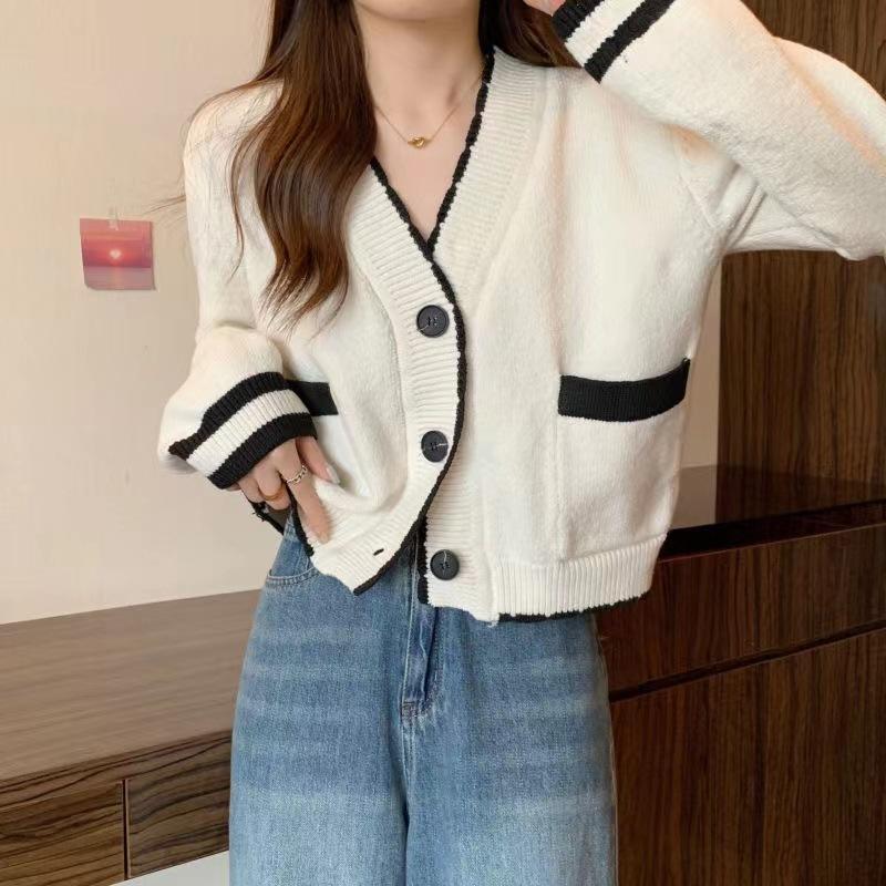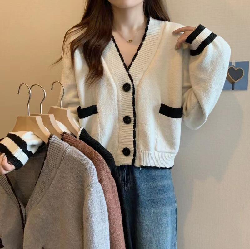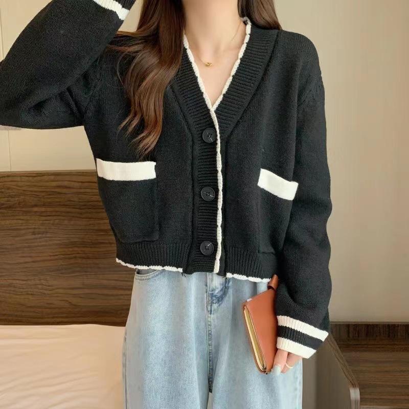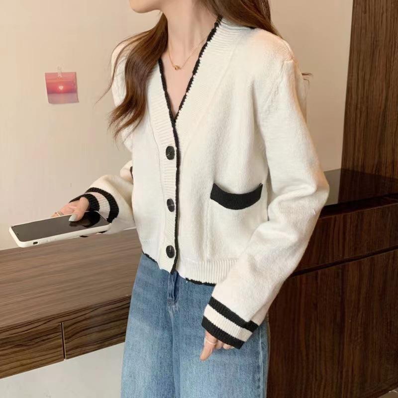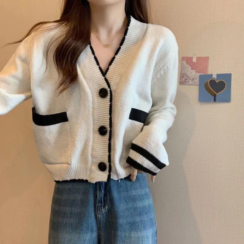 Suéter estilo coreano simple de borde en color contrastante con cuello en V, abrigo para mujer, otoño 2023, nuevo, casual, corto, holgado, tejido