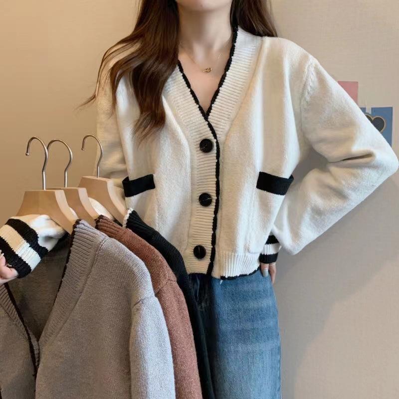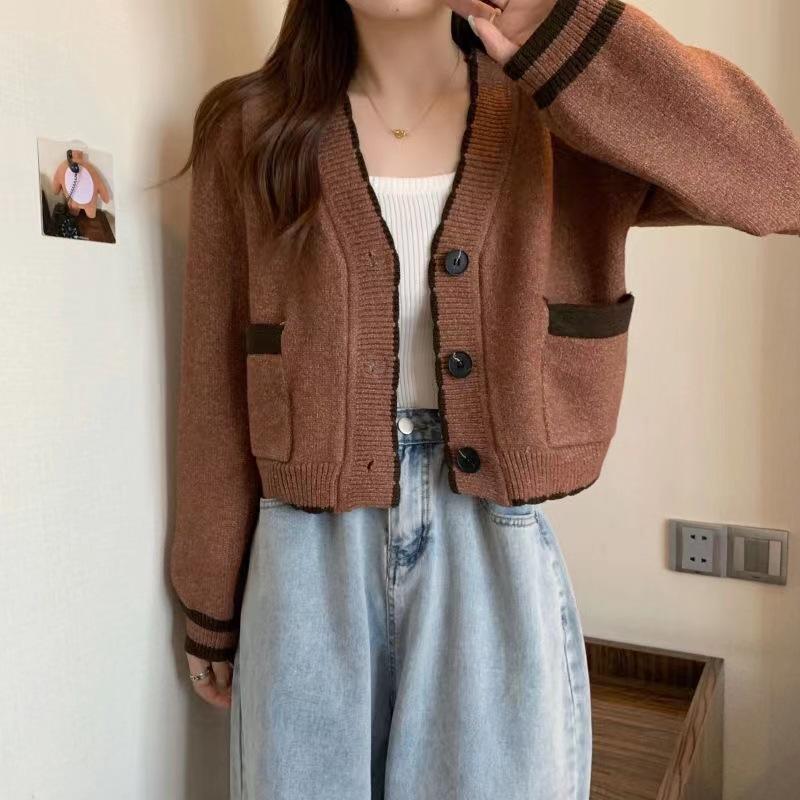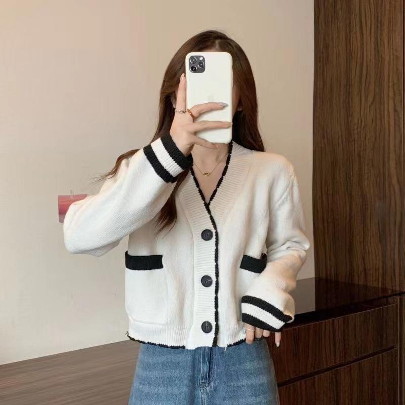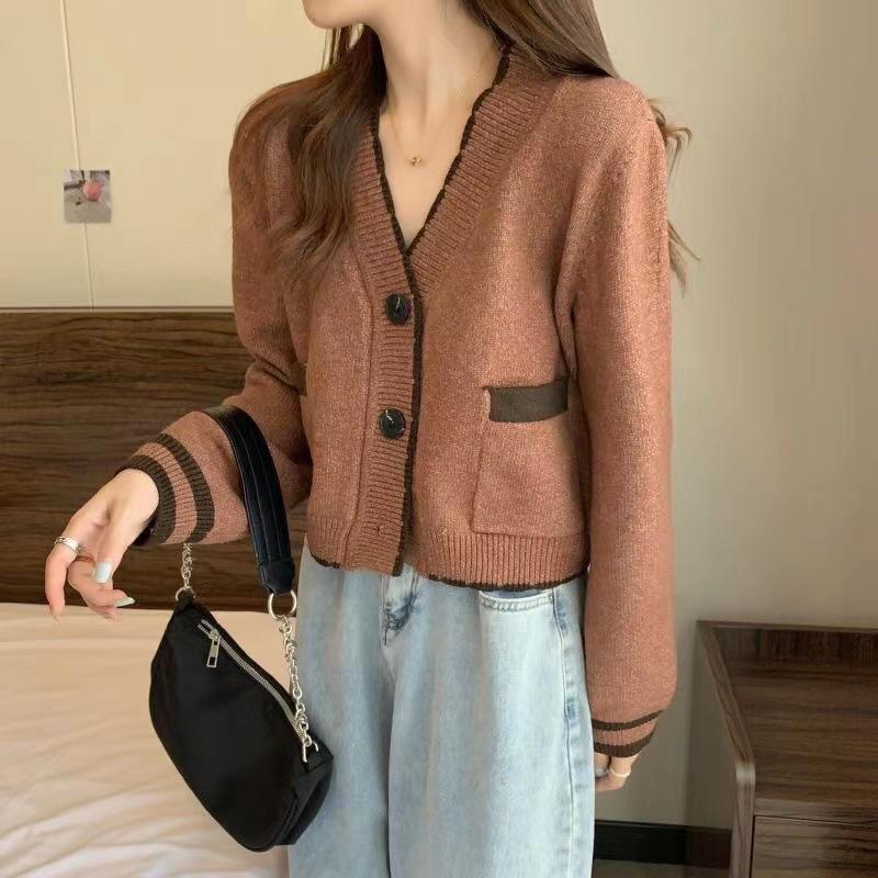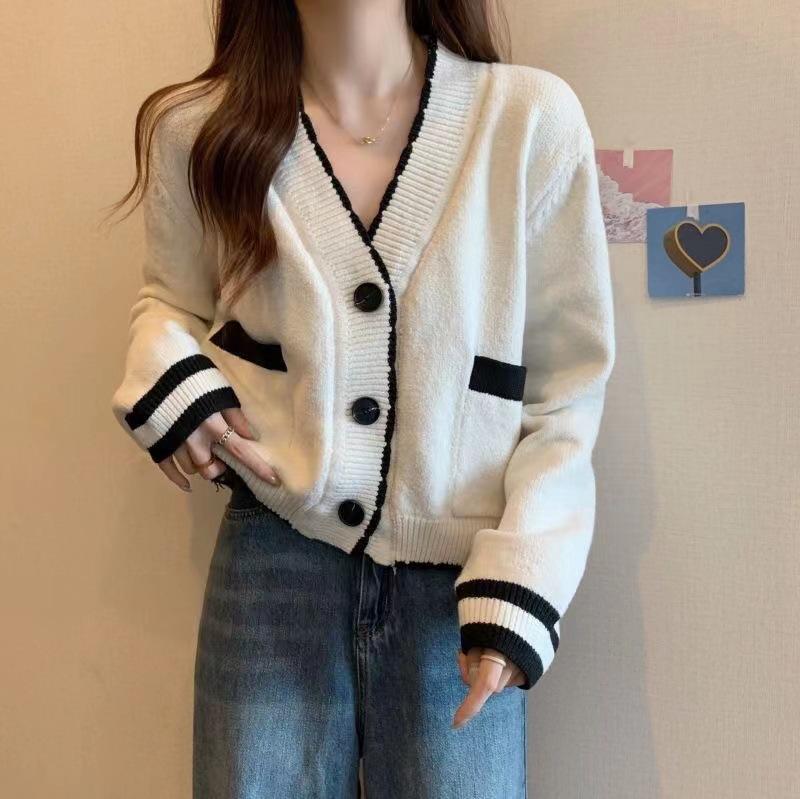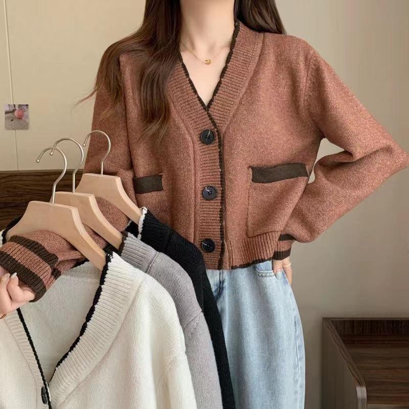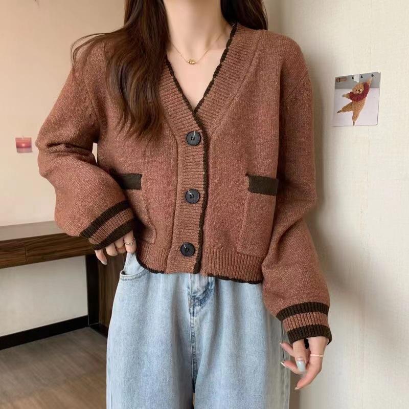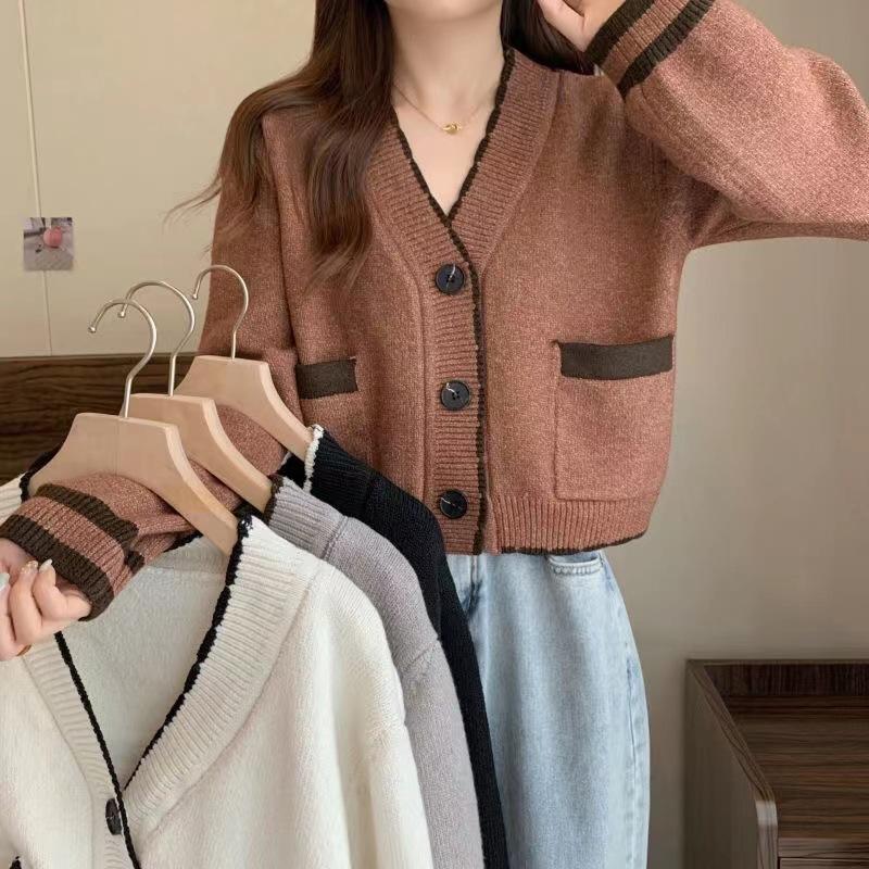 Suéter estilo coreano simple de borde en color contrastante con cuello en V, abrigo para mujer, otoño 2023, nuevo, casual, corto, holgado, tejido
