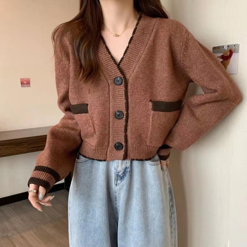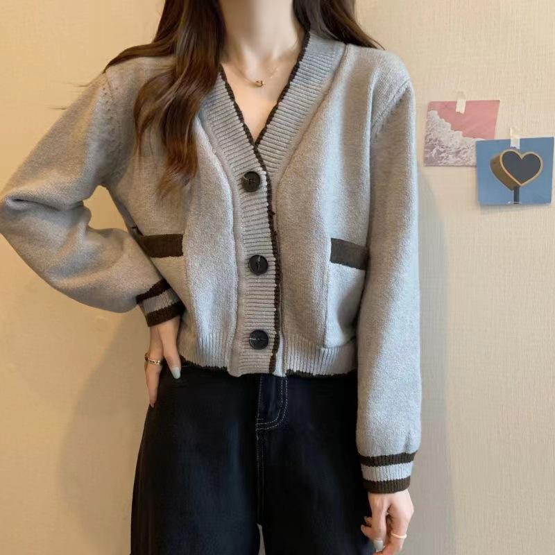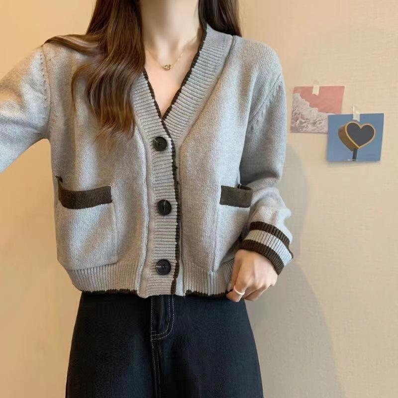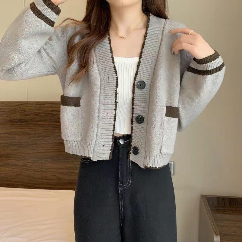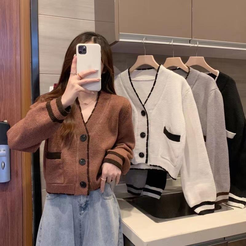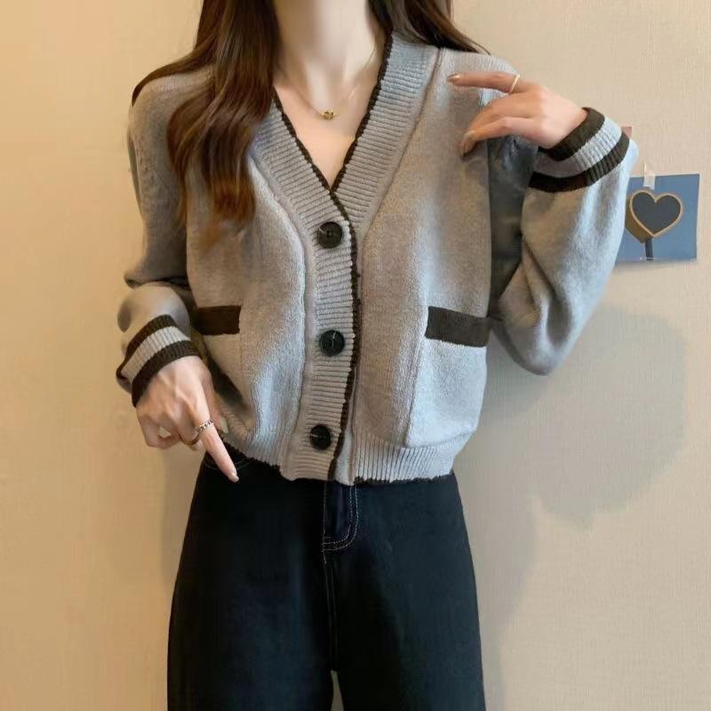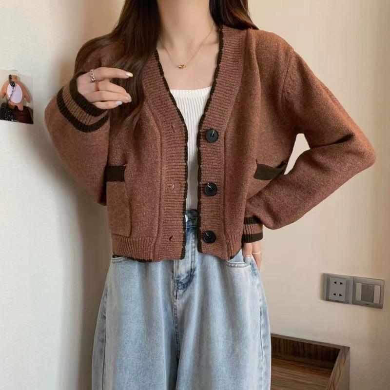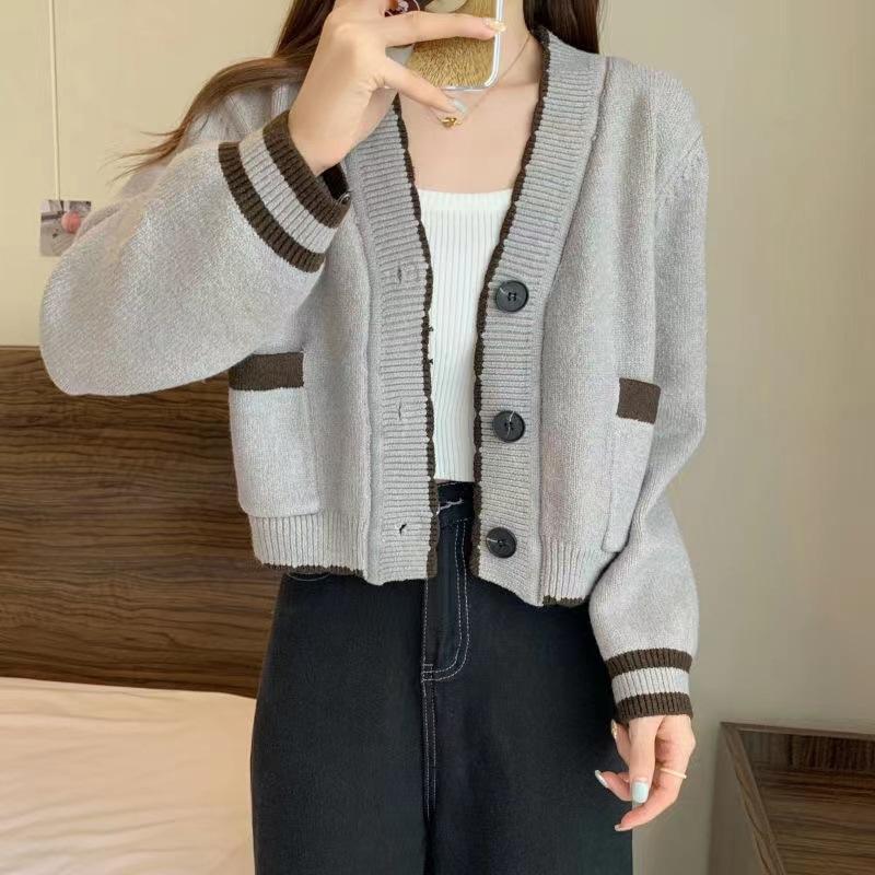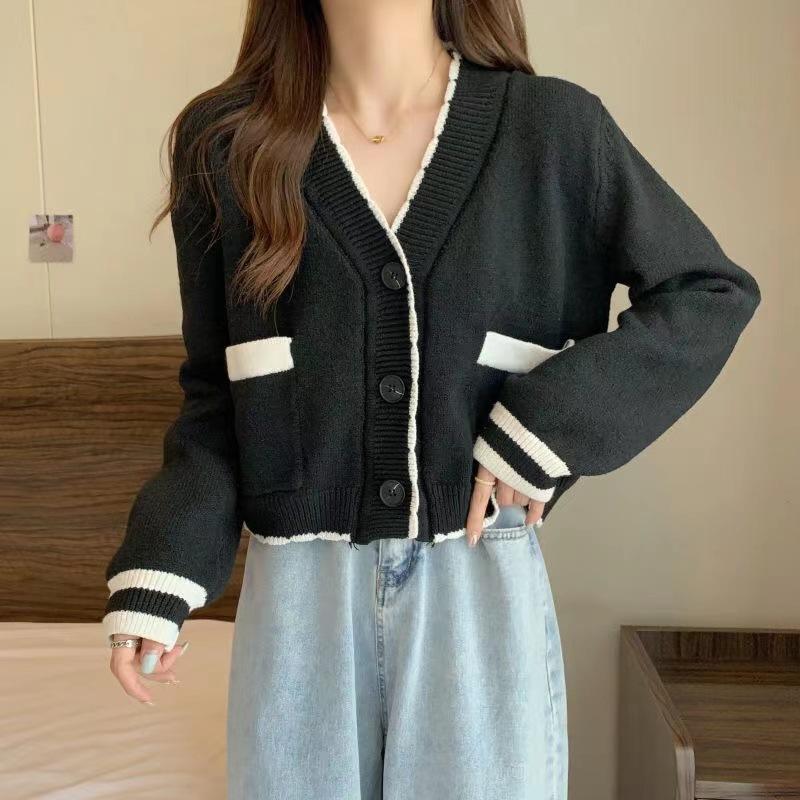 Suéter estilo coreano simple de borde en color contrastante con cuello en V, abrigo para mujer, otoño 2023, nuevo, casual, corto, holgado, tejido