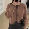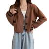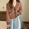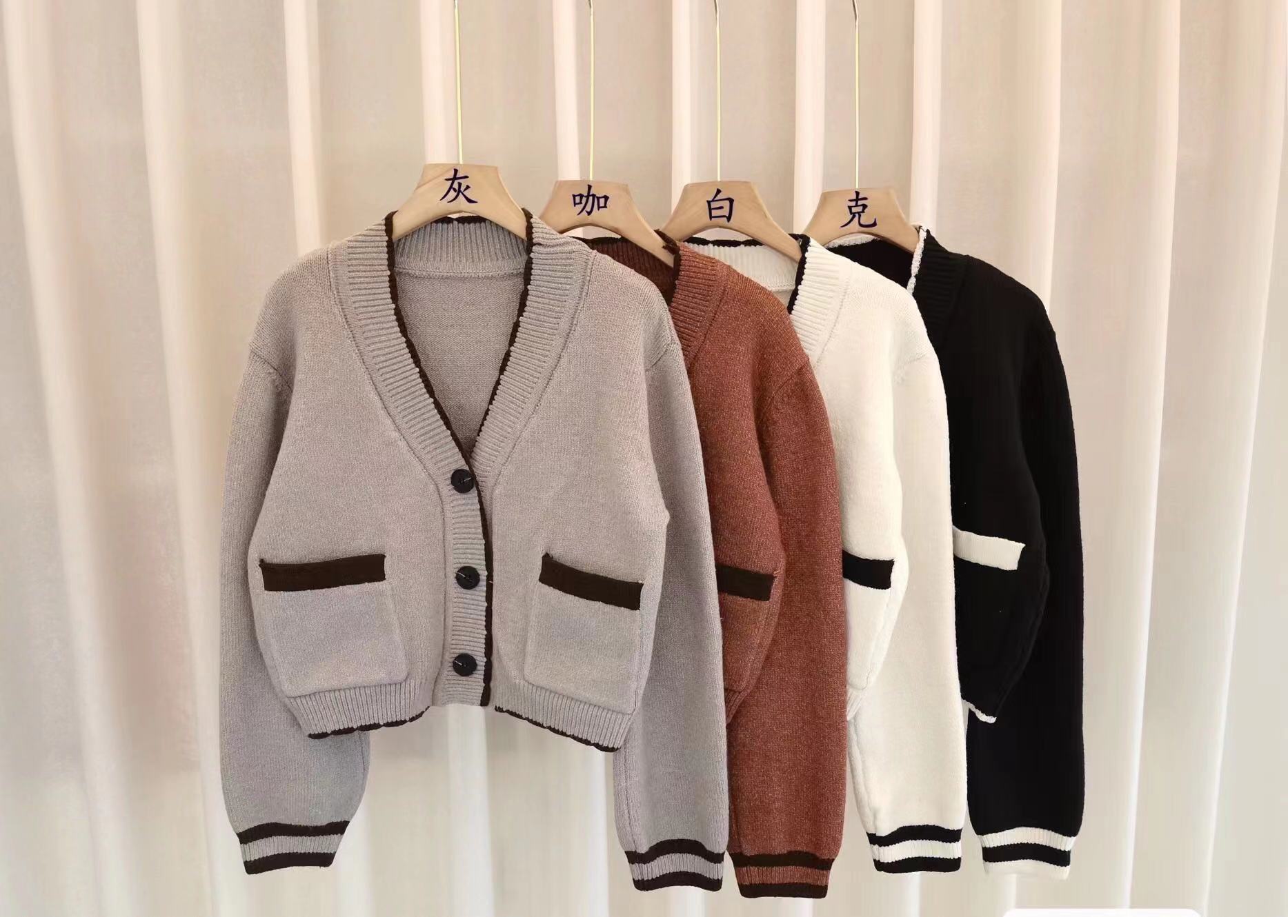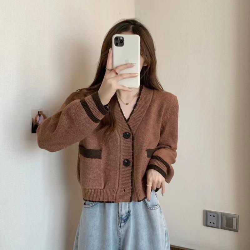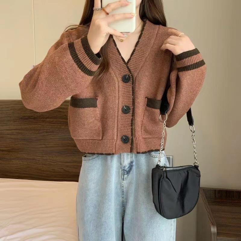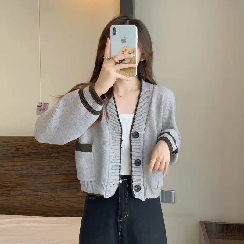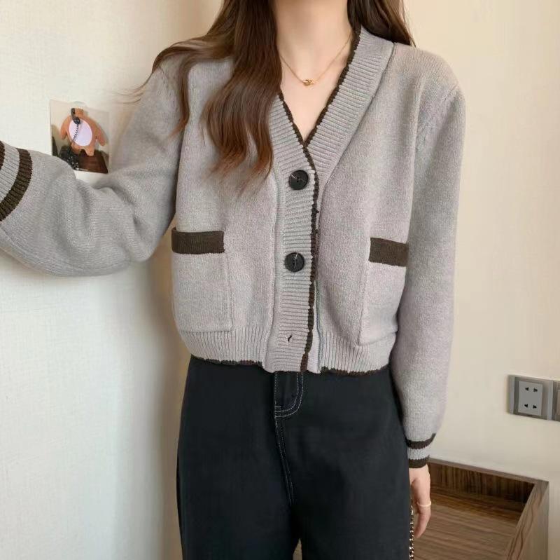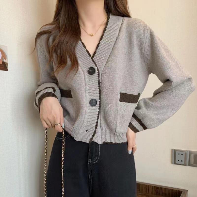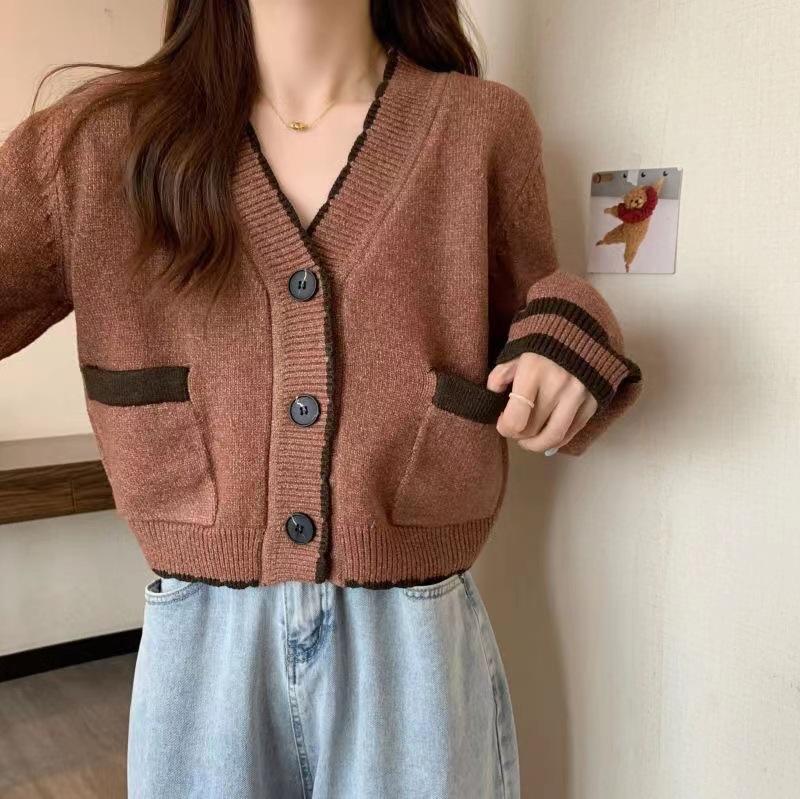 Suéter estilo coreano simple de borde en color contrastante con cuello en V, abrigo para mujer, otoño 2023, nuevo, casual, corto, holgado, tejido