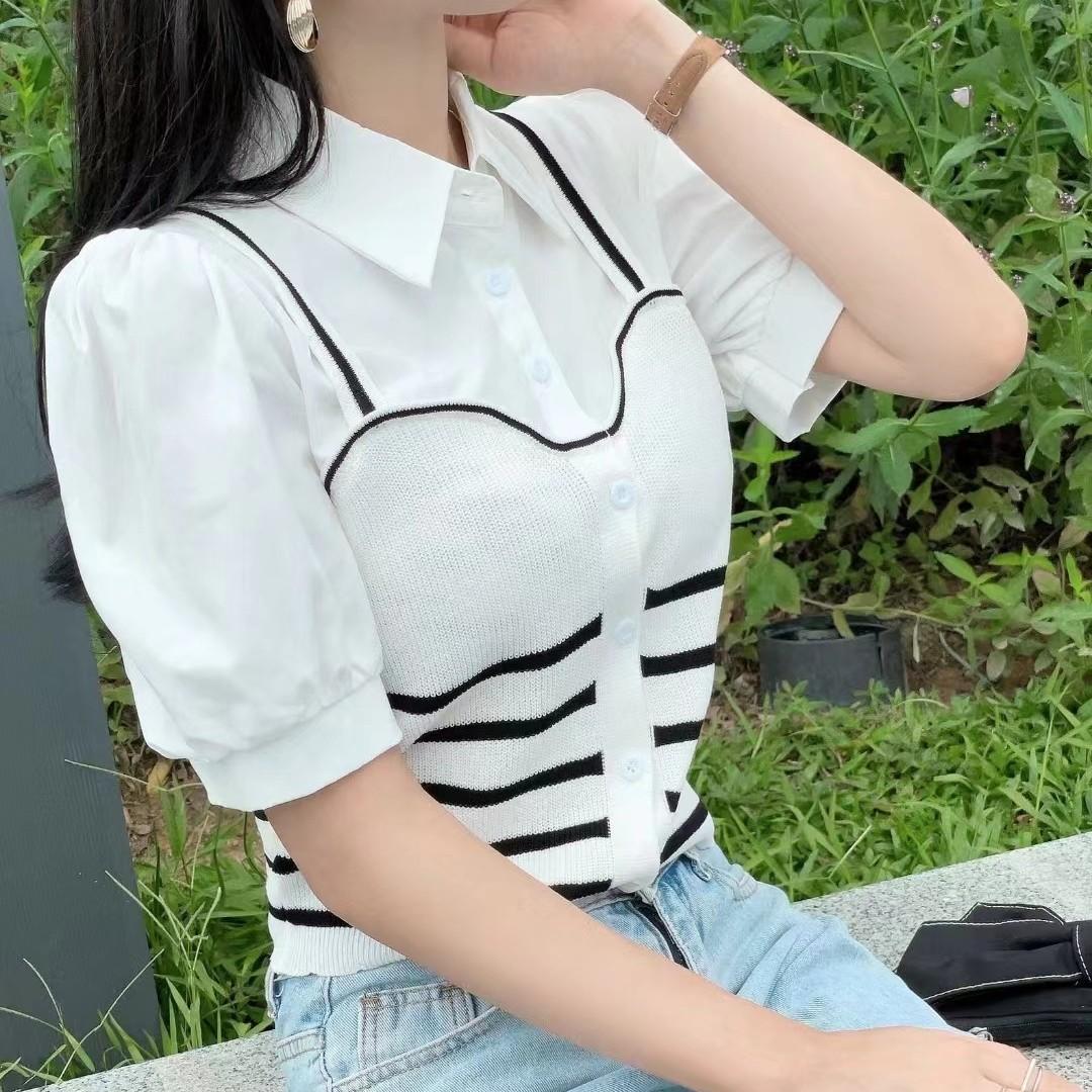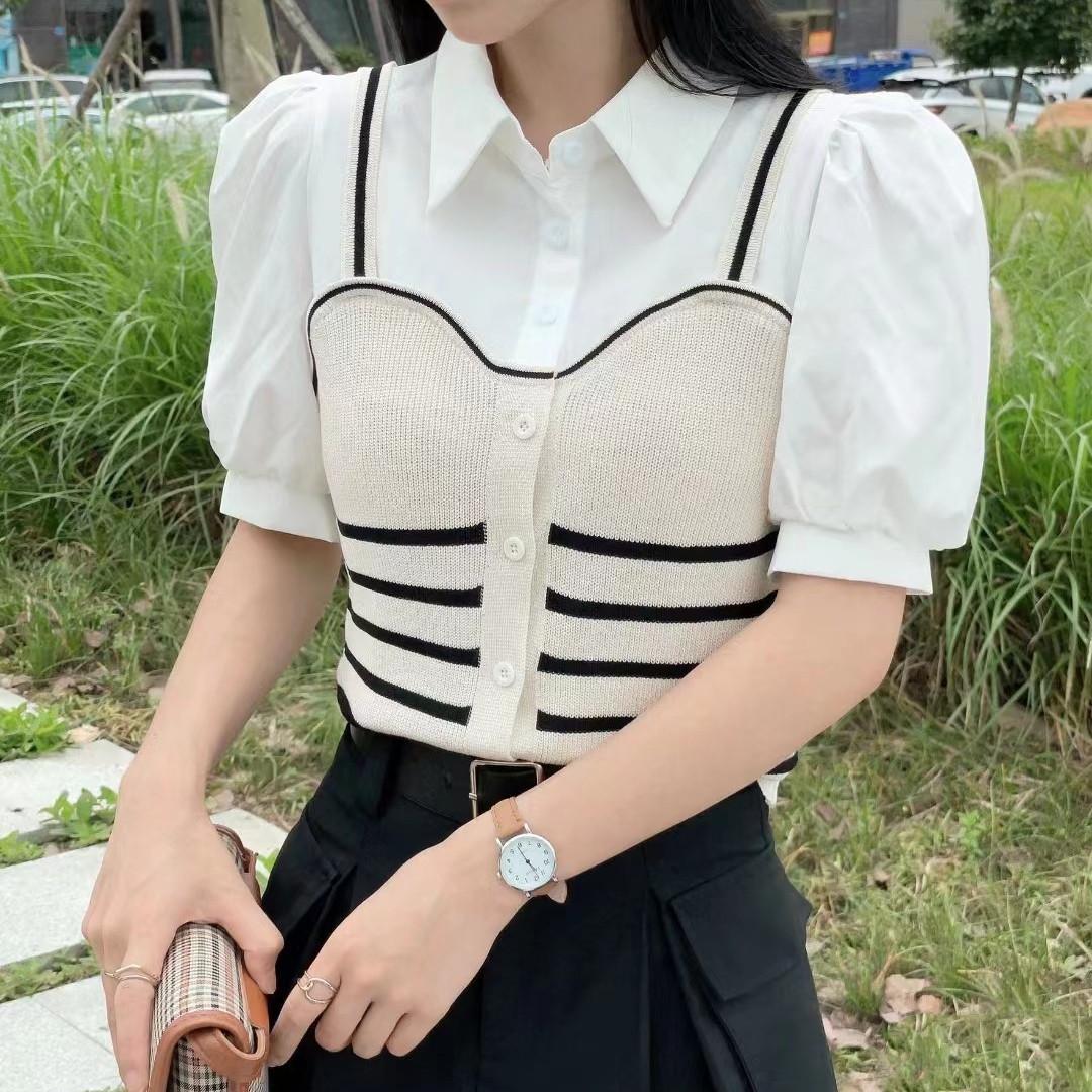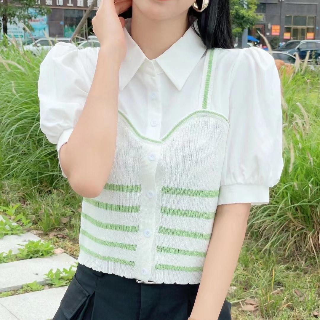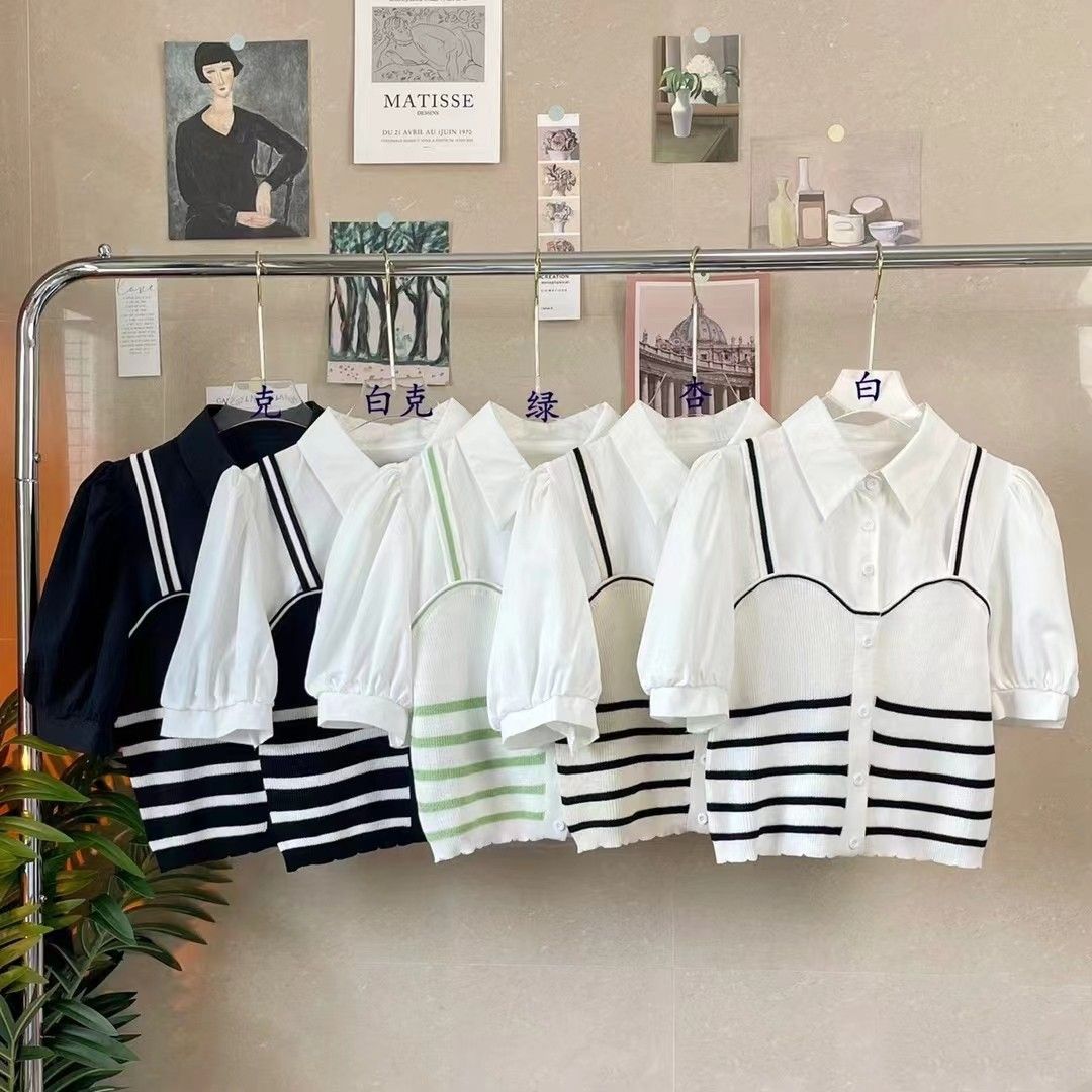 2025 Nuevo Verano Estilo Coreano Simple y a la Moda Polo Cuello Empalmado Falso Dos Piezas Manga Corta Cárdigan Top Ins