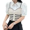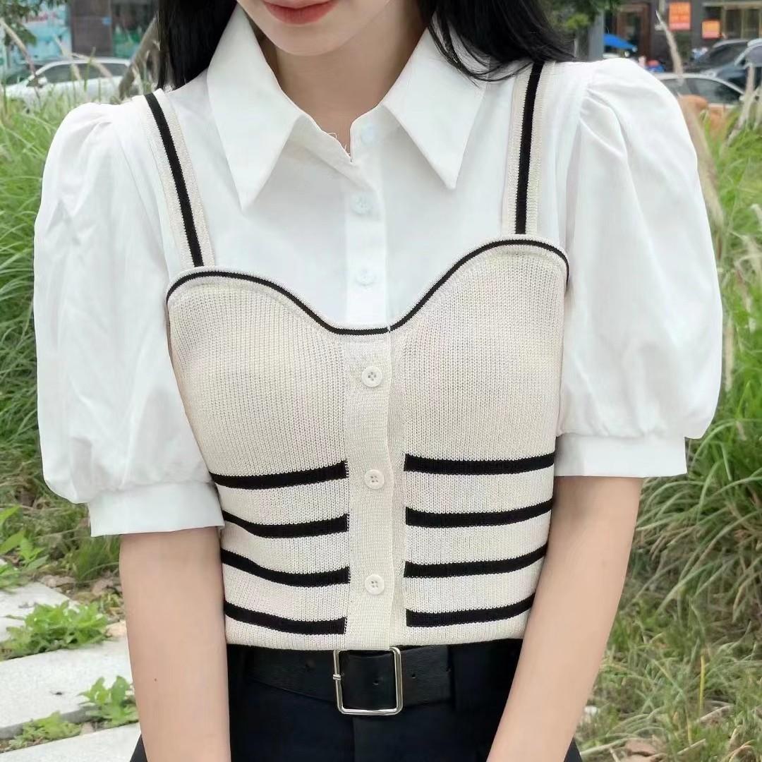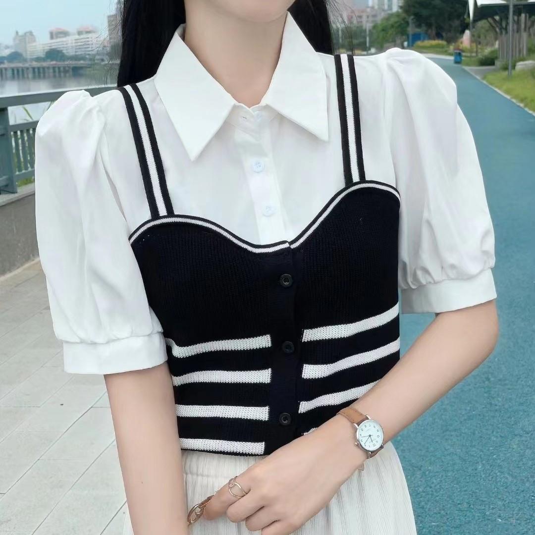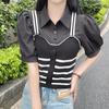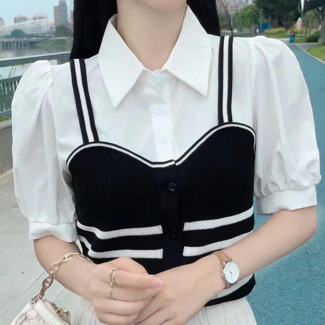 2025 Nuevo Verano Estilo Coreano Simple y a la Moda Polo Cuello Empalmado Falso Dos Piezas Manga Corta Cárdigan Top Ins