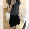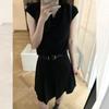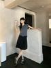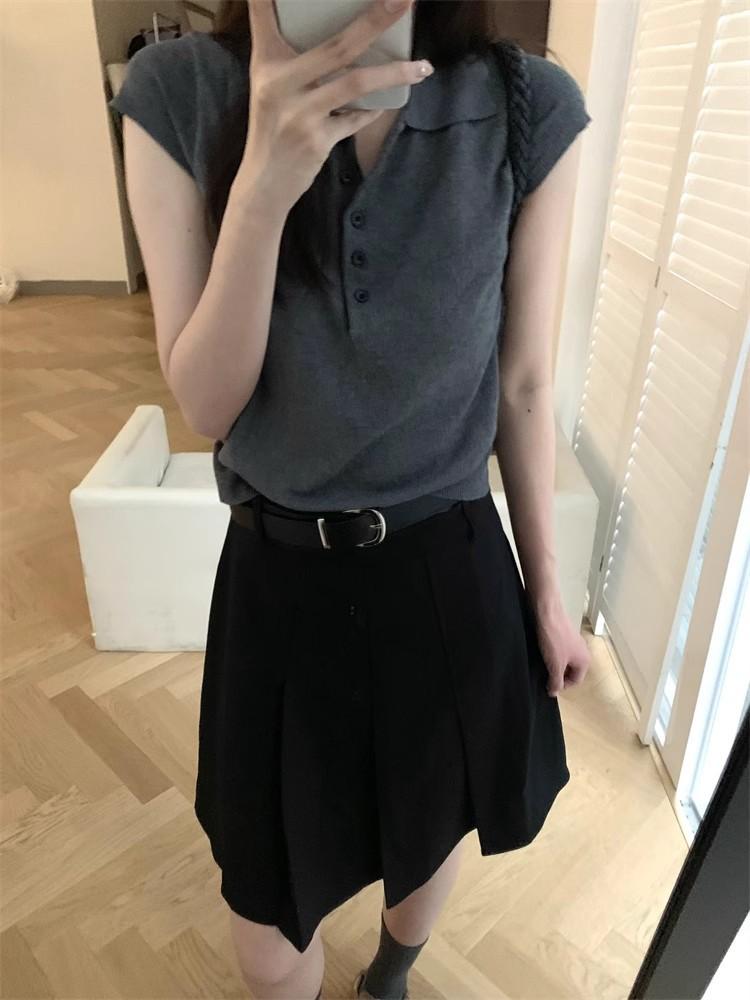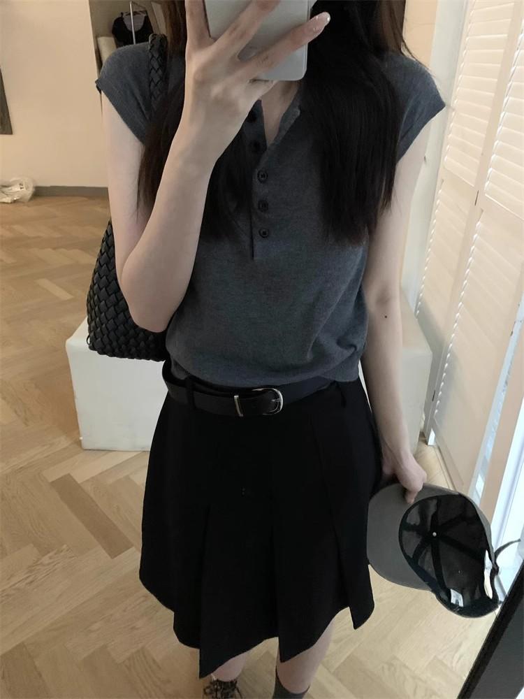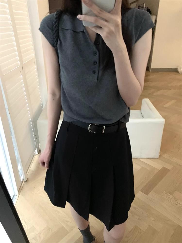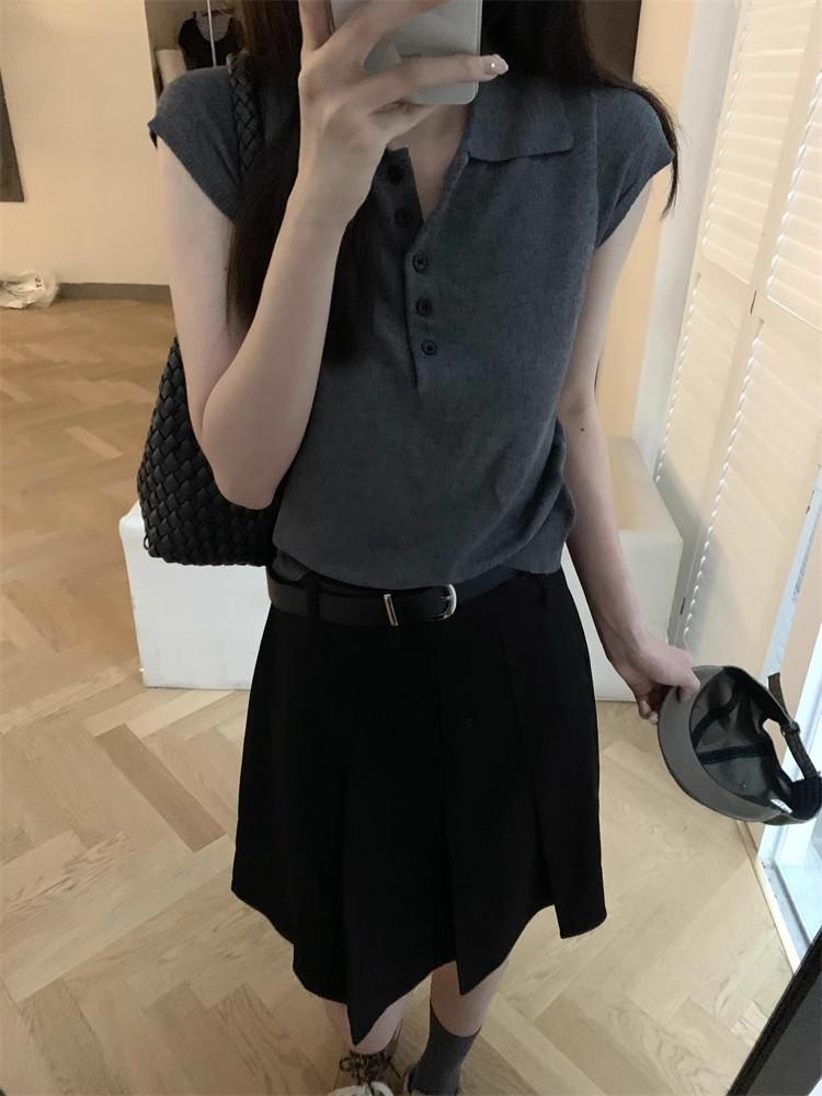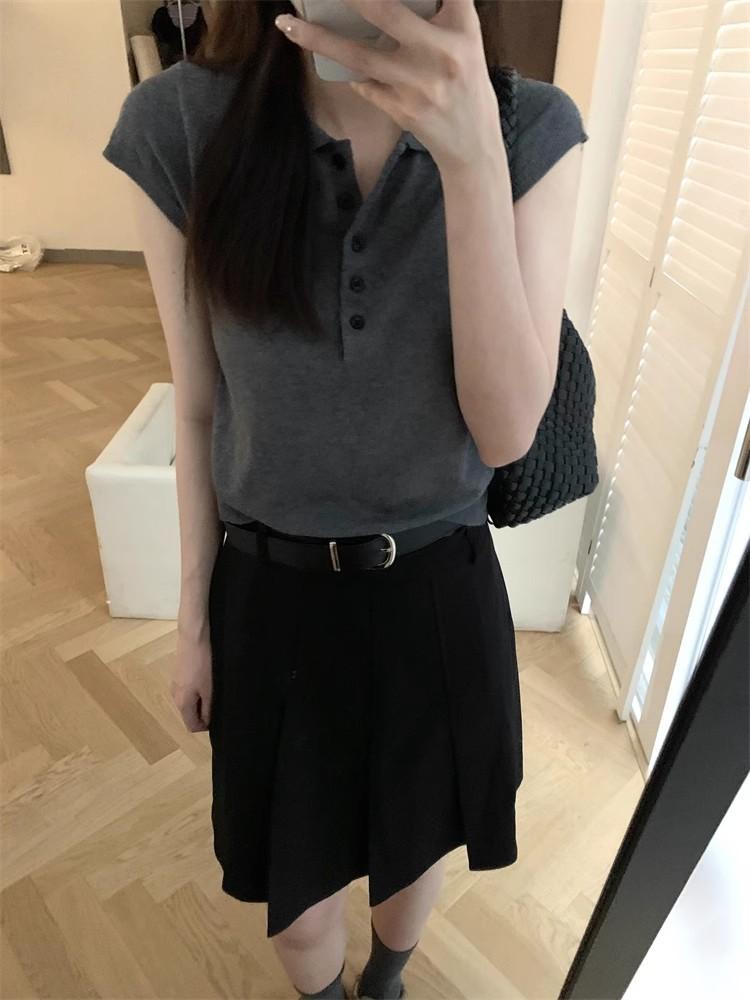 Chic Coreano Gris Polo Cuello Tejido Manga Corta Camiseta para Mujer Verano Look Adelgazante Top de Hombro Derecho Corto
