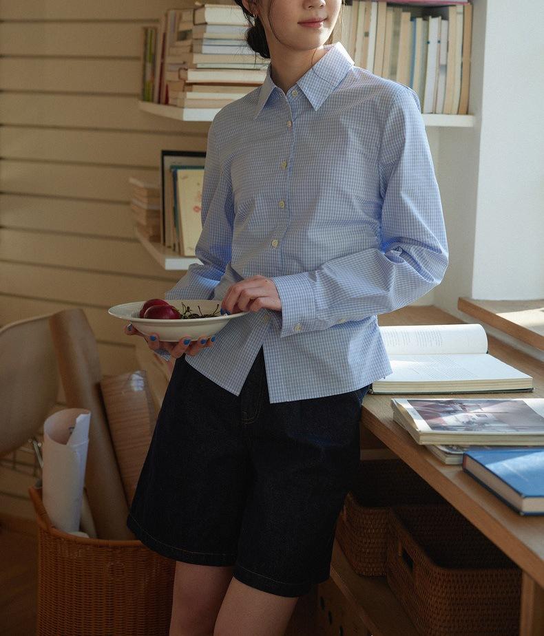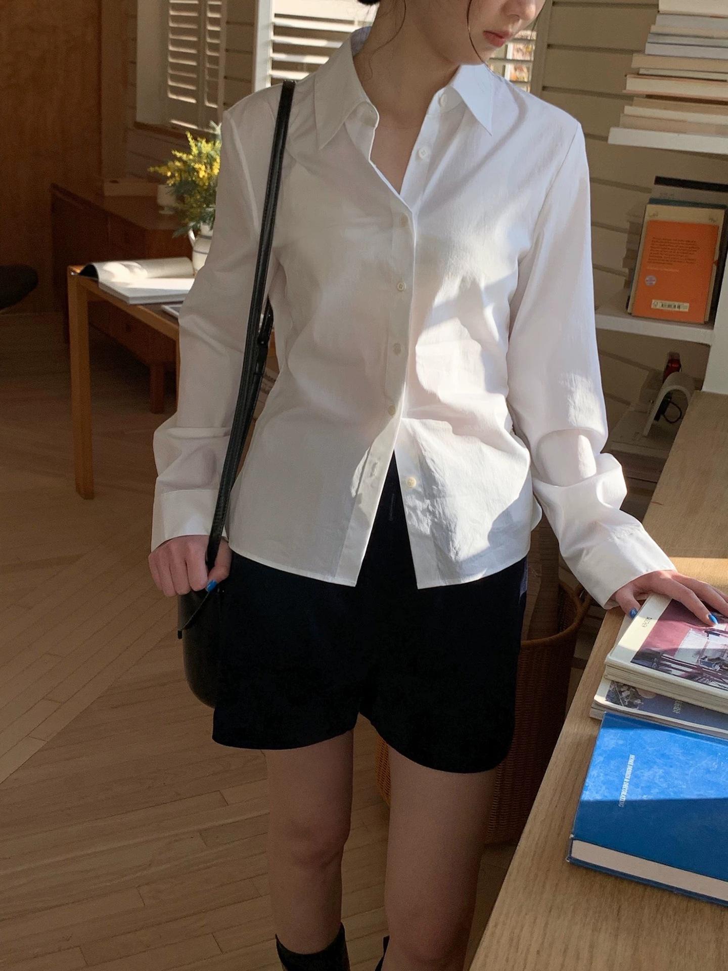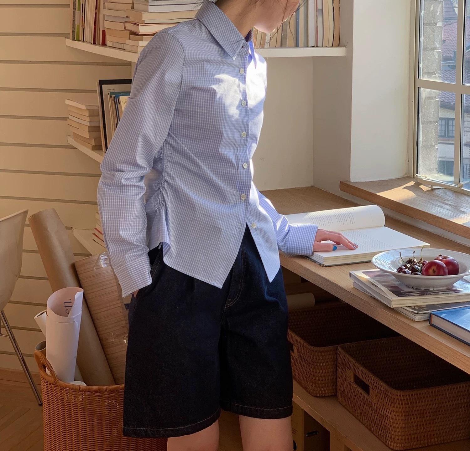 Camisa de manga larga azul pequeña con cintura arrugada 2025SS Intellectuals