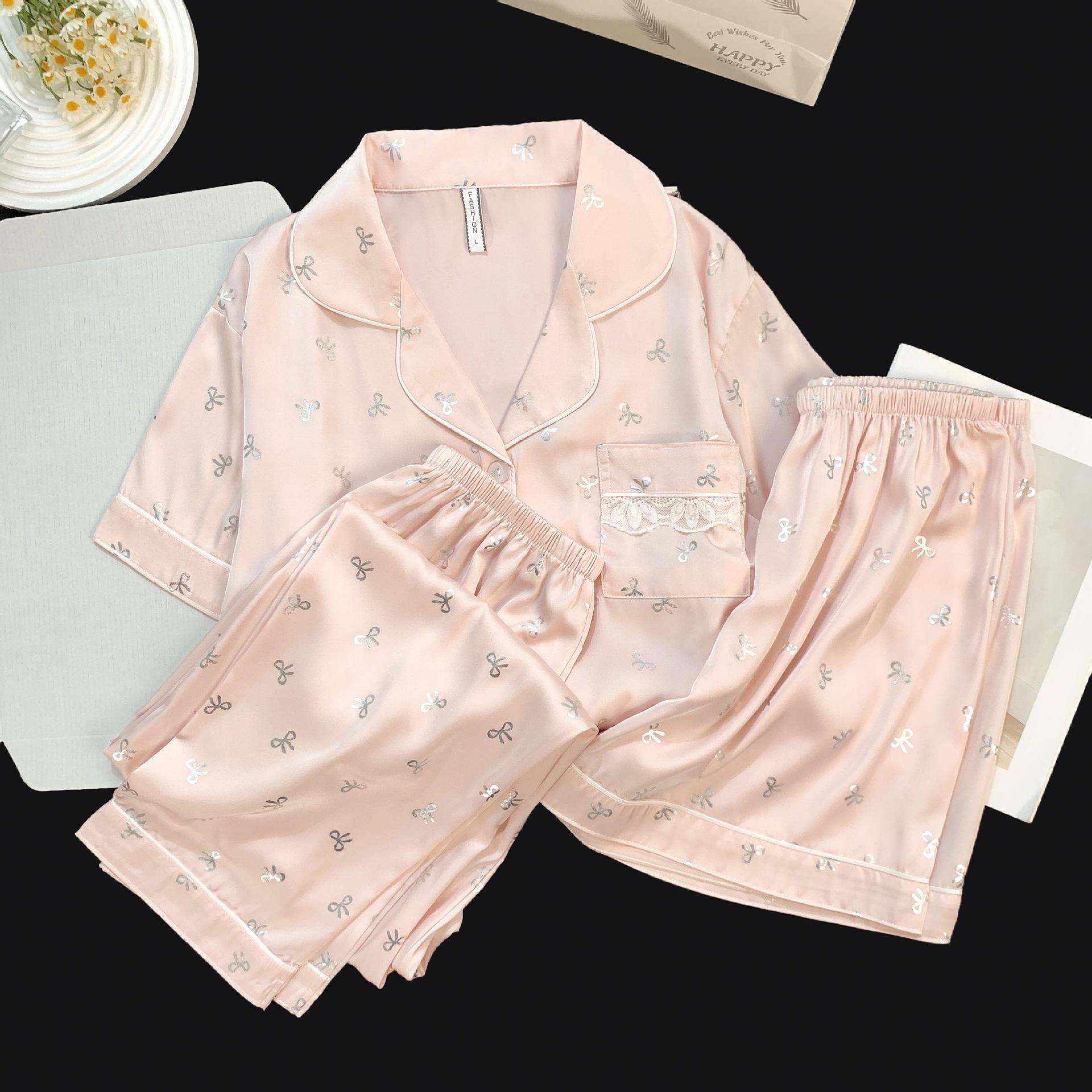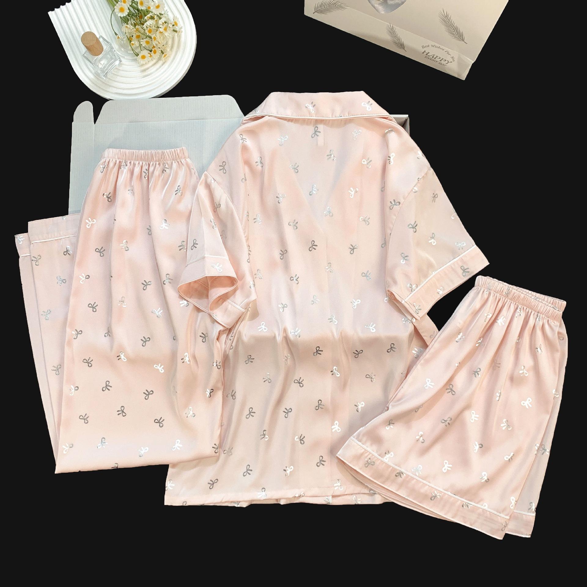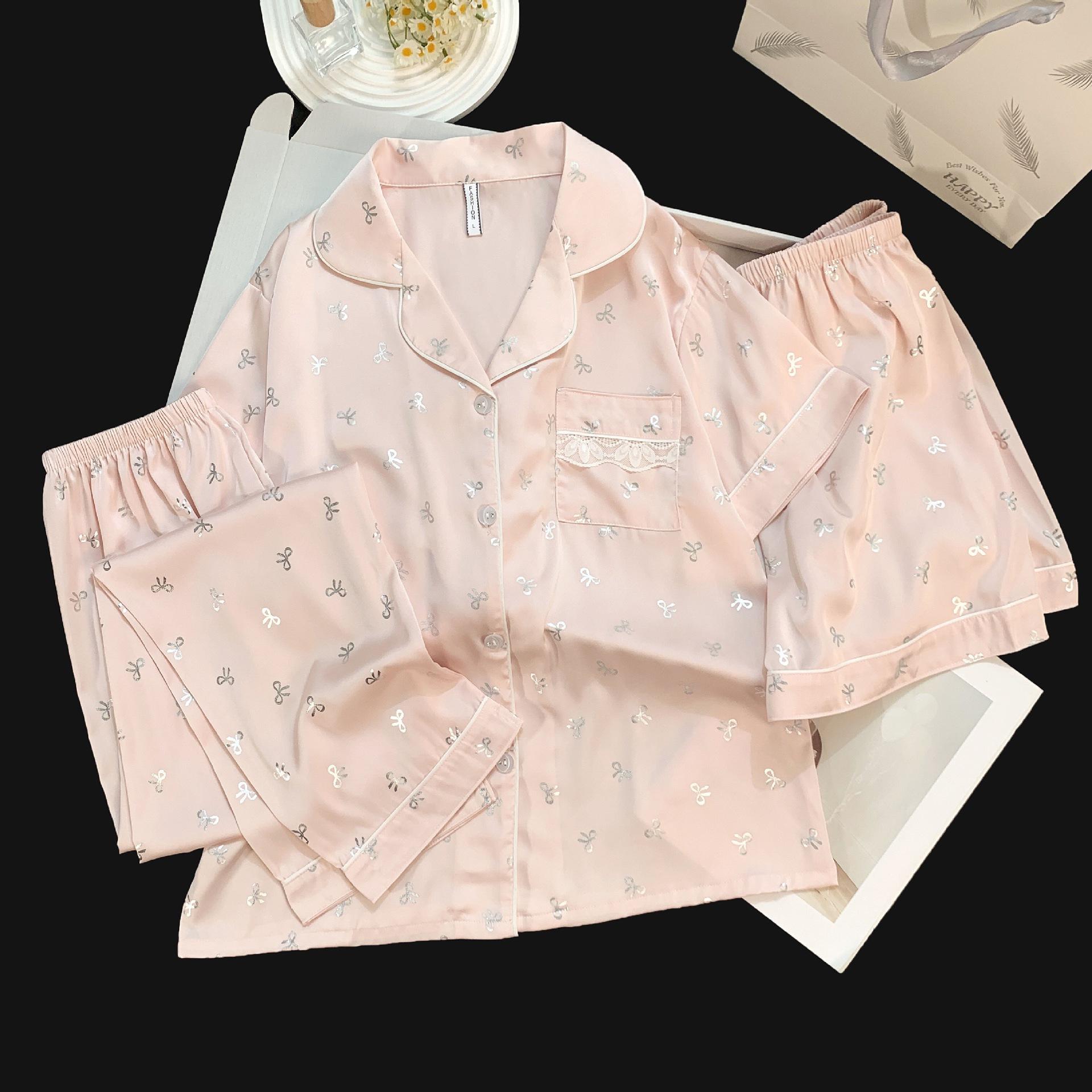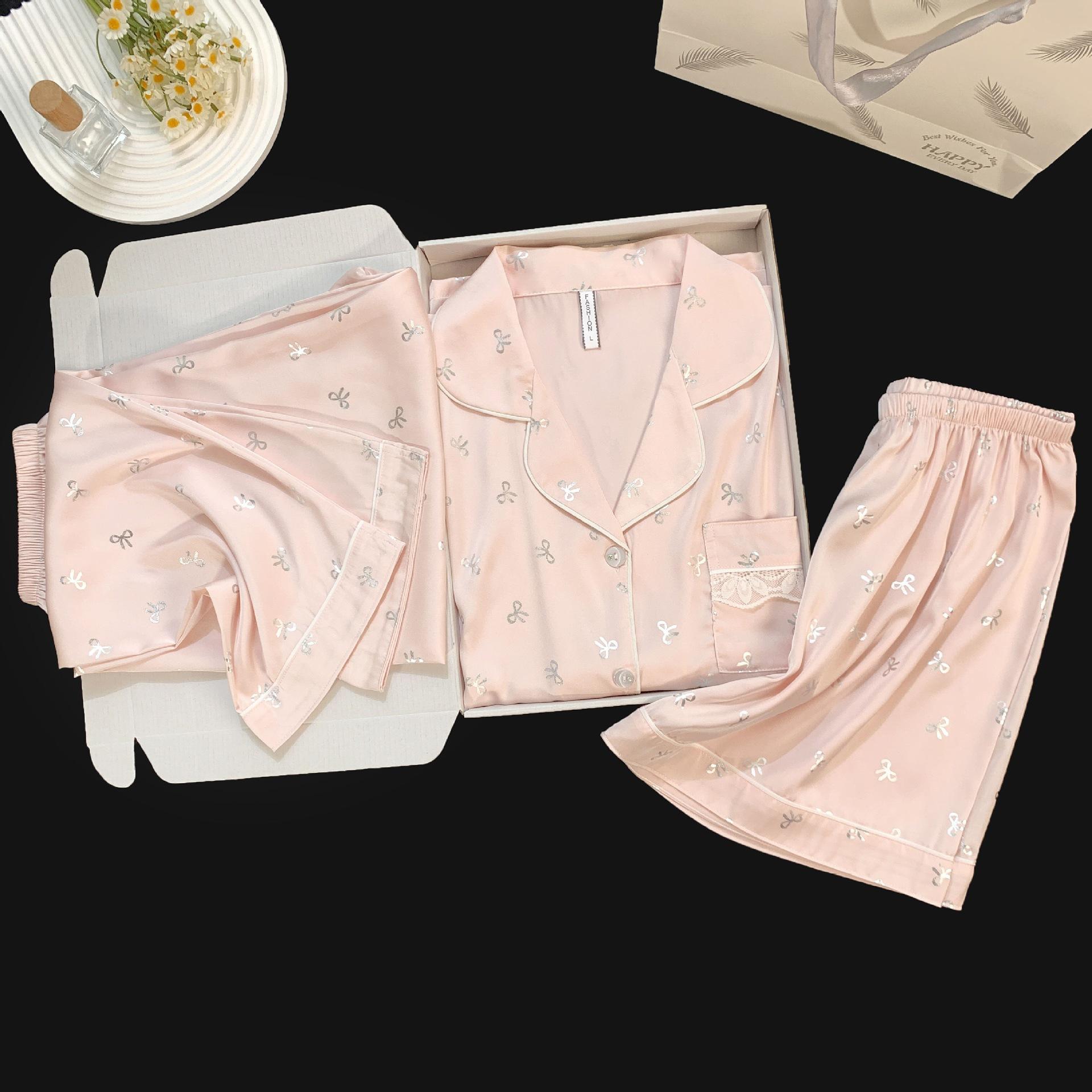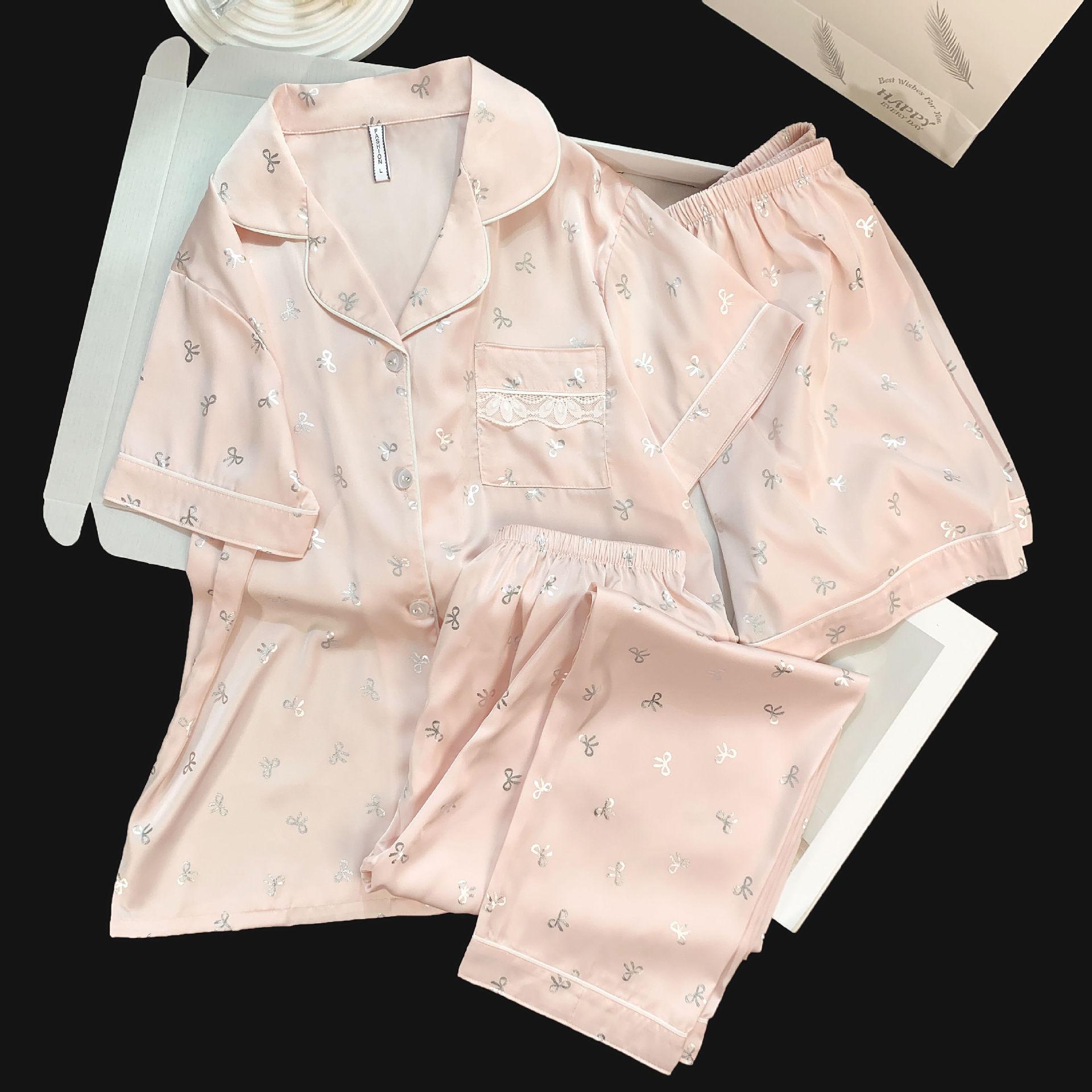 Pijama de Seda de Hielo de Verano para Mujer de Manga Corta de Tres Piezas Conjunto Delgado Estilo Verano 2025 Ropa para el Hogar de Seda de Hielo de Aroma Ligero