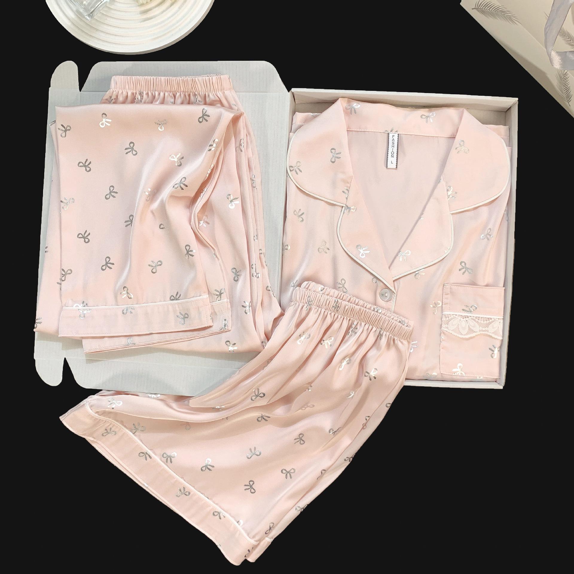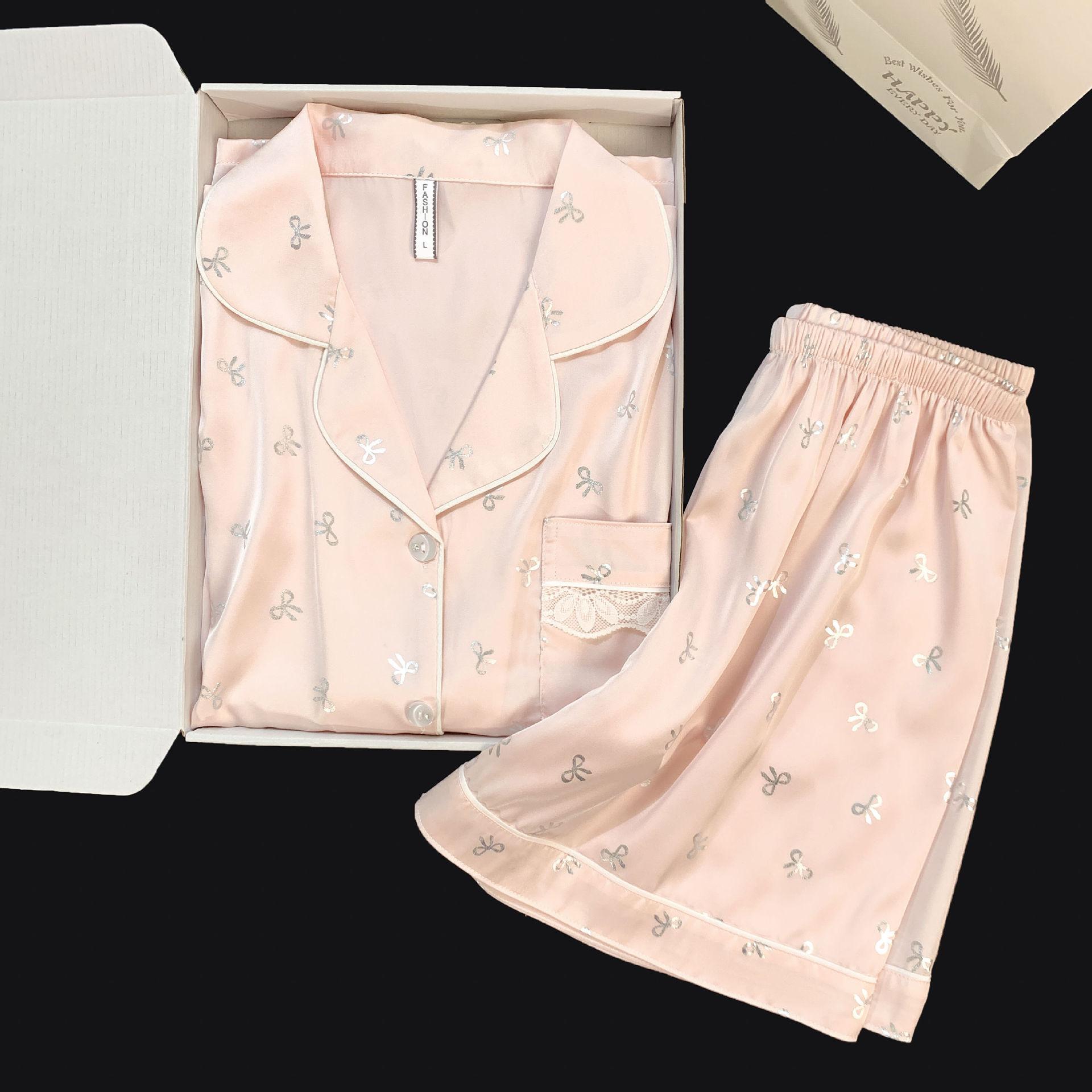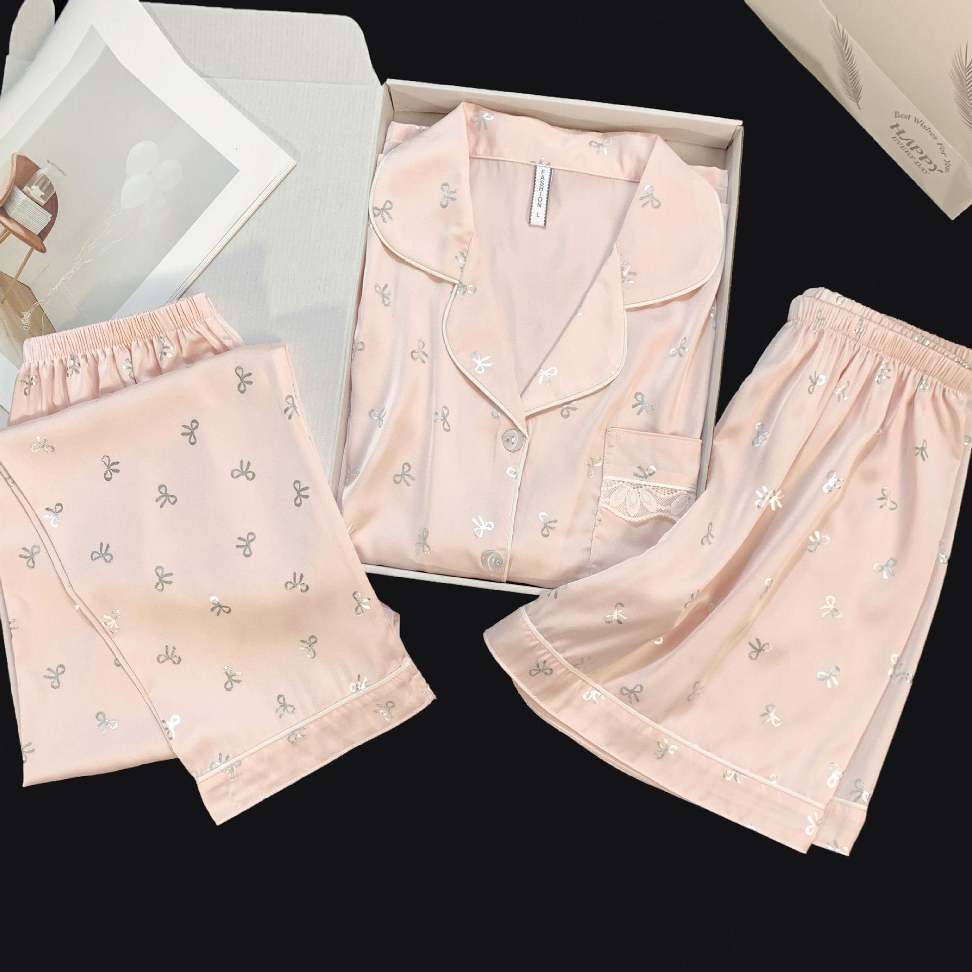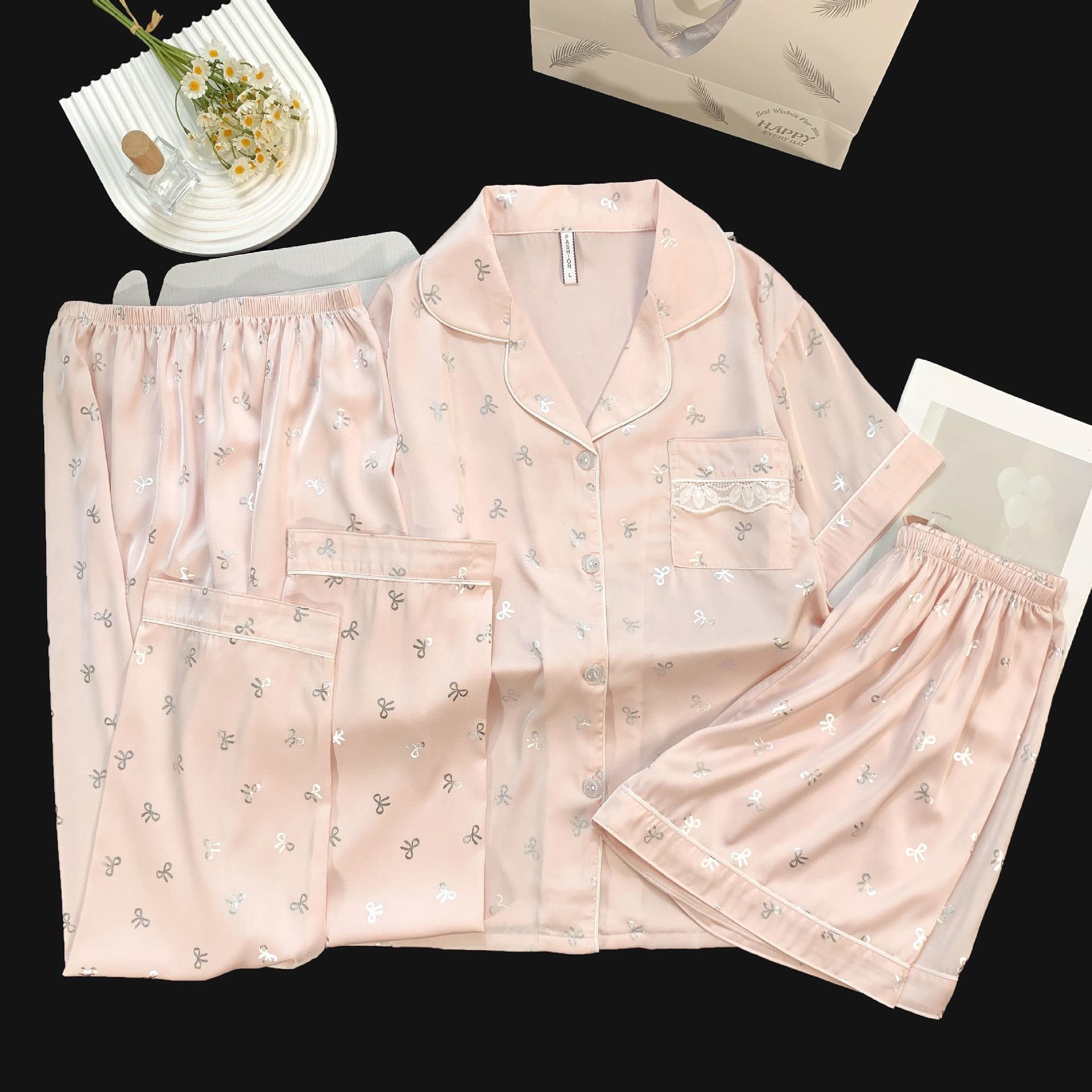 Pijama de Seda de Hielo de Verano para Mujer de Manga Corta de Tres Piezas Conjunto Delgado Estilo Verano 2025 Ropa para el Hogar de Seda de Hielo de Aroma Ligero