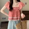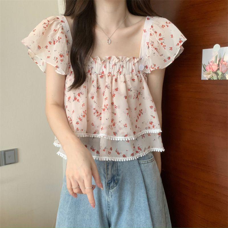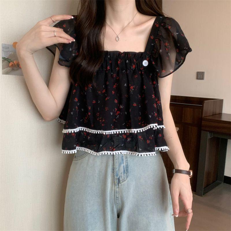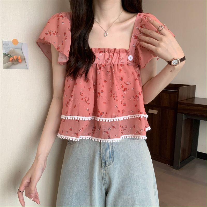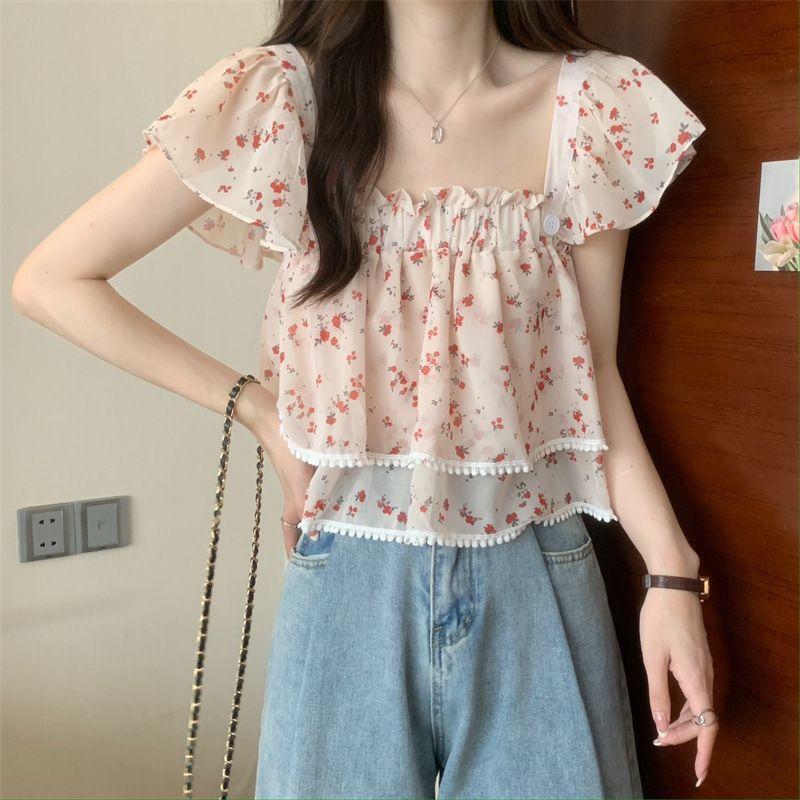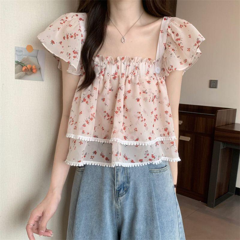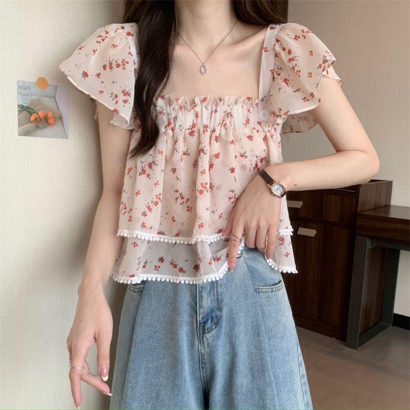 Verano 2025 Nuevo Casual Cuello Cuadrado Manga Corta Floral Sexy Corto Gasa Francés Manga Mariposa Camisa Trendy