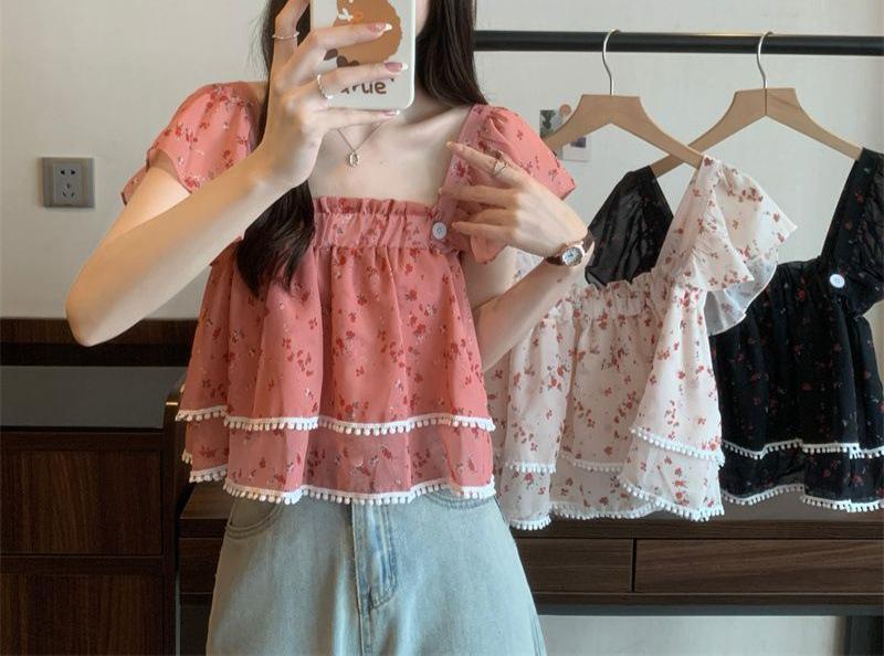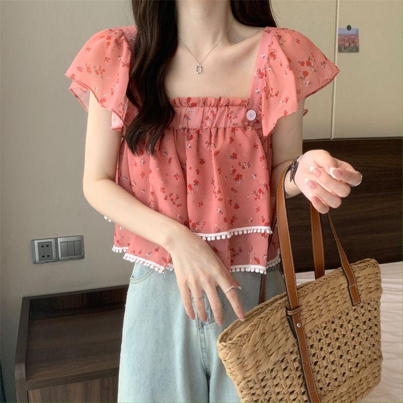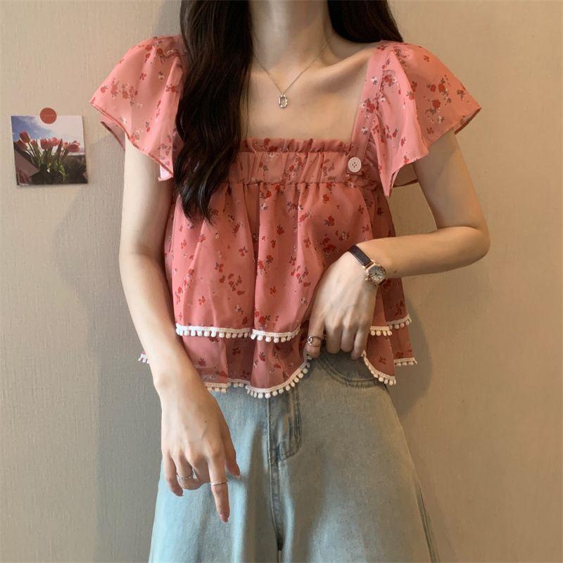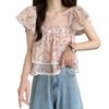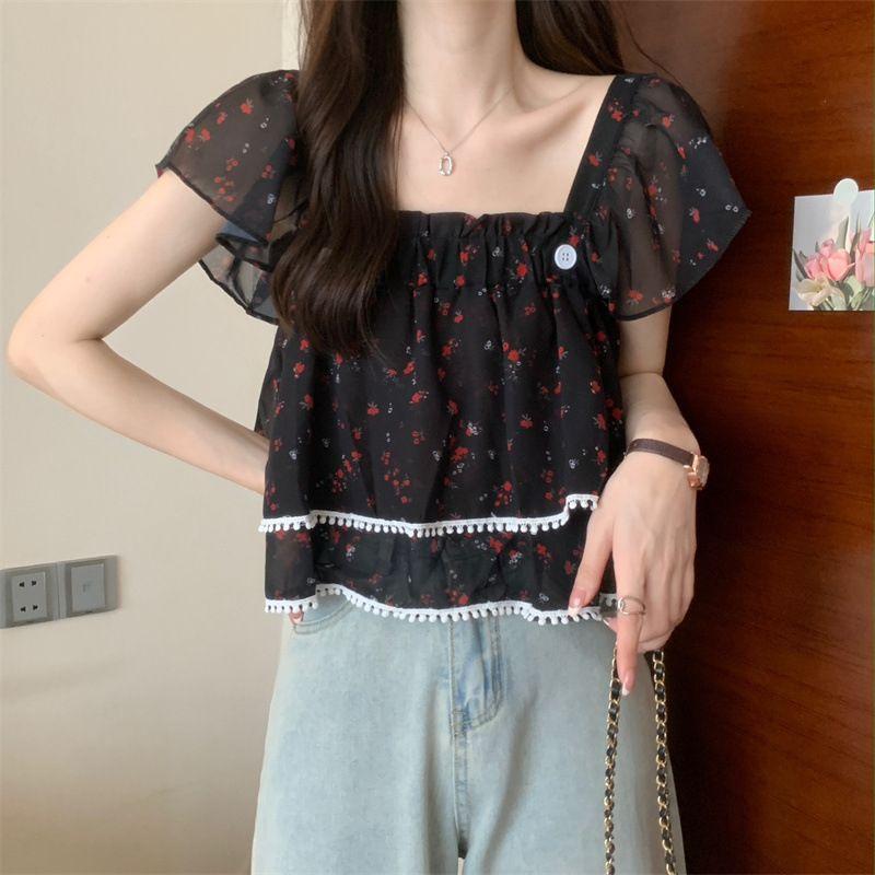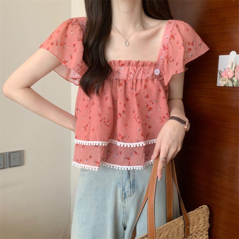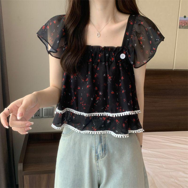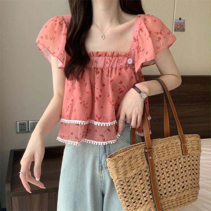 Verano 2025 Nuevo Casual Cuello Cuadrado Manga Corta Floral Sexy Corto Gasa Francés Manga Mariposa Camisa Trendy