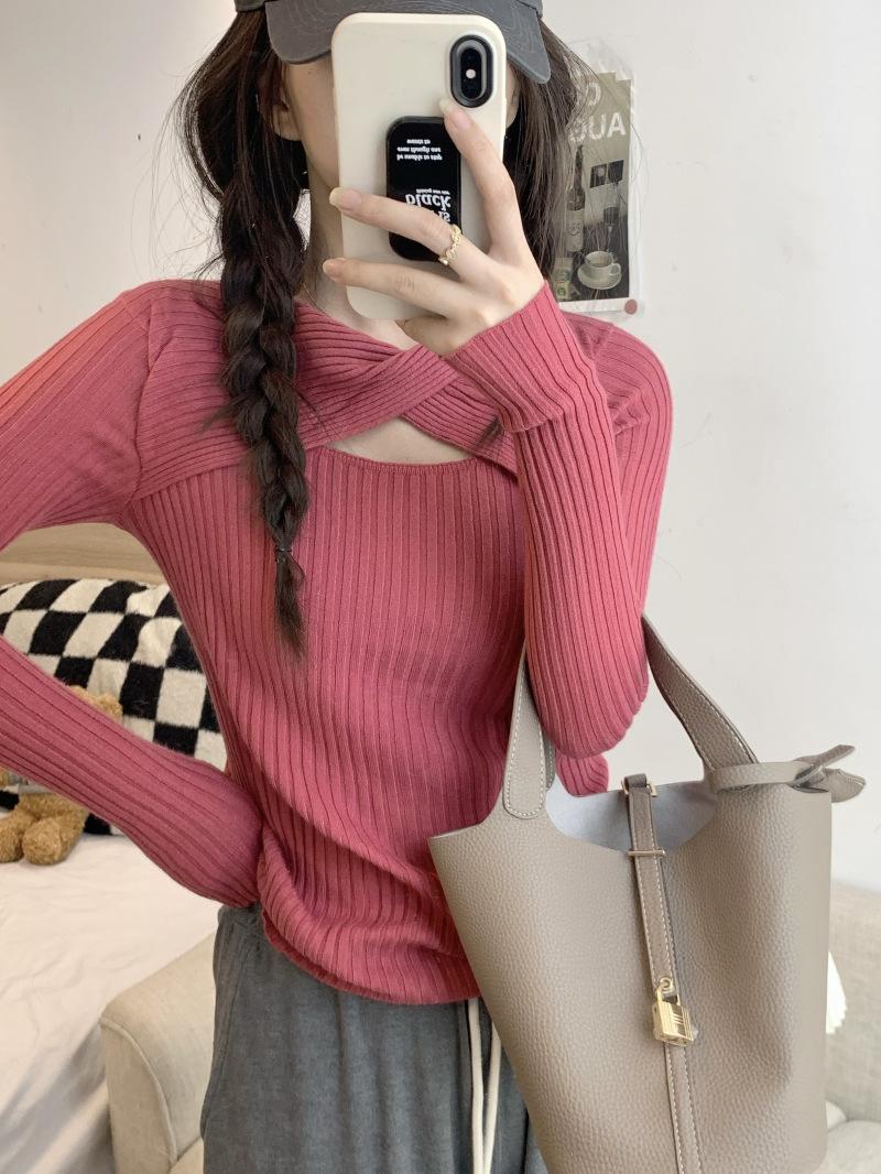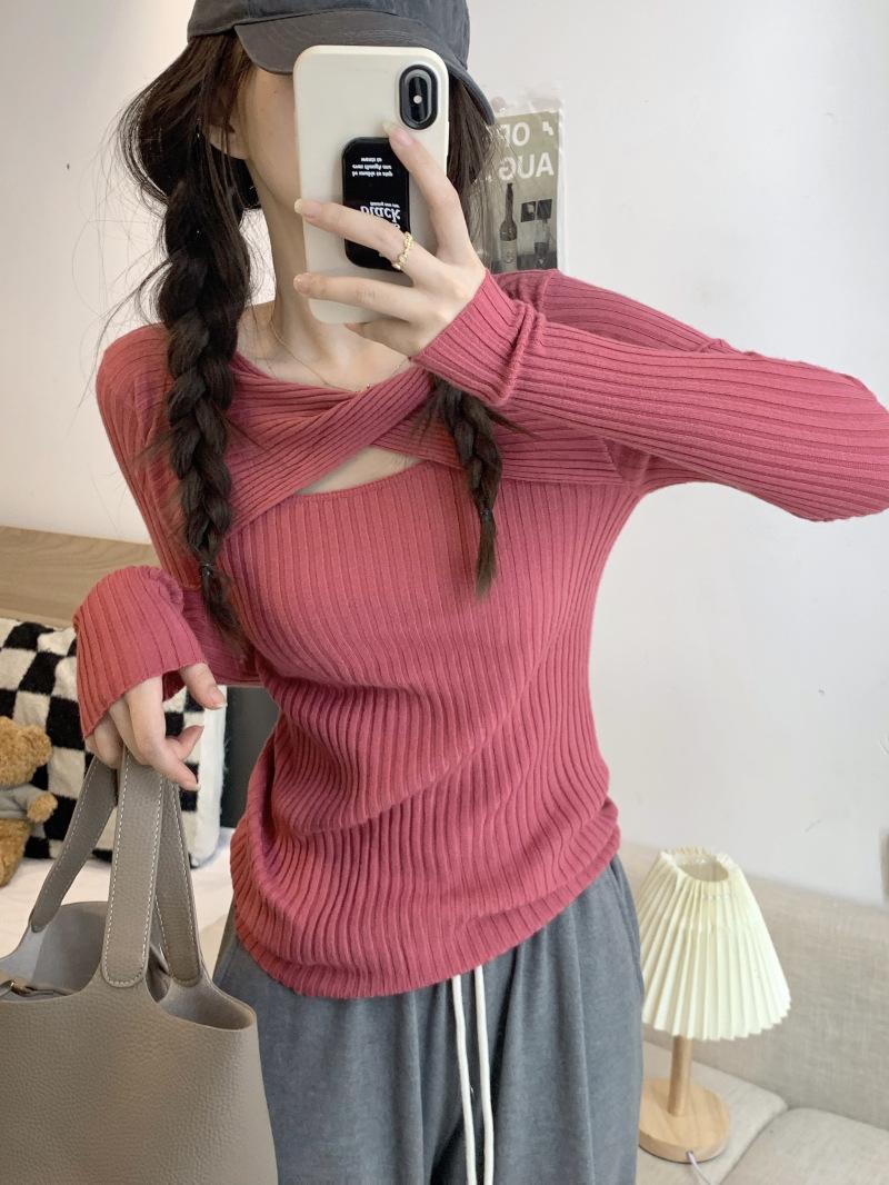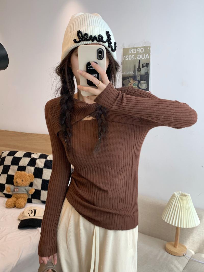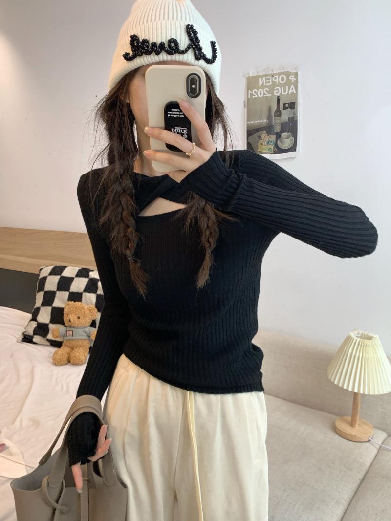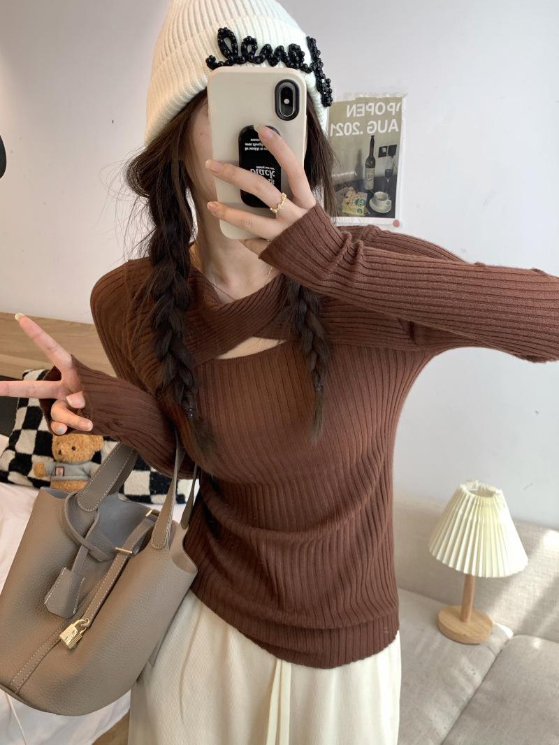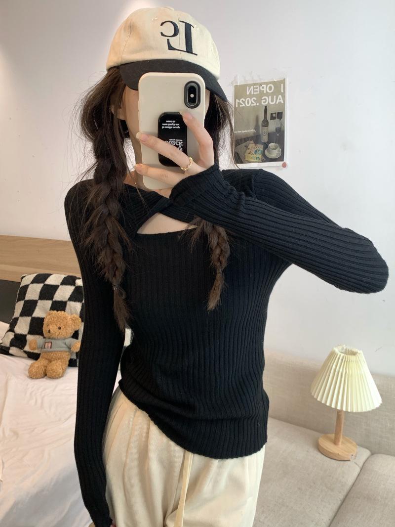 Suéter de Mujer Calado Manga Larga Tejido de Punto Otoño Invierno 2025 Nuevo Adelgazante Elástico Capa Base Interior